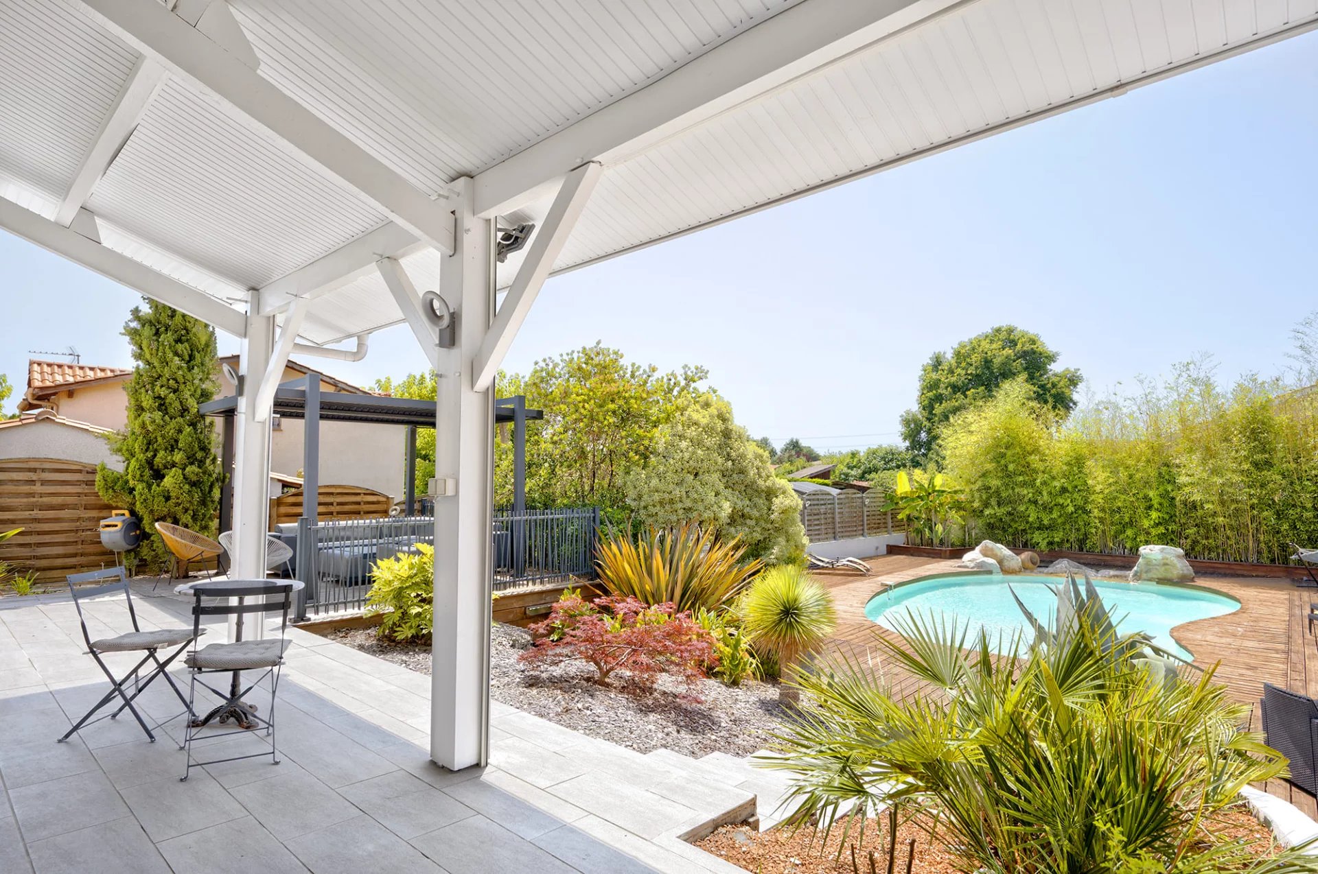 CANÉJAN Centre-ville À quelques pas du centre-ville de CANÉJAN, dans un environnement calme et résidentiel, venez découvrir cette villa de 260 m² entièrement rénovée, offrant des prestations rappelant les superbes propriétés provençales. Lumineuse, moderne et volumineuse, sa pièce de vie d'environ 80 m² avec plafond cathédrale en est l'illustration parfaite, comprenant une cuisine équipée et aménagée sur mesure, ainsi que cinq chambres dont deux suites parentales avec chacune leur salle d'eau. De plus, une salle d'eau et une salle de bains avec douche à l'italienne et baignoire balnéo viennent compléter cet espace. Une buanderie et une grande pièce pouvant servir de salle de sport ou d'espace de jeu complètent cette description intérieure. On retrouve également un impressionnant garage d'environ 90 m² avec double accès, pouvant accueillir 3 à 4 véhicules. Une grande terrasse surplombant une piscine à l'abri des regards et des extérieurs soignés invite à profiter des journées ensoleillées. En résumé, sans exagération, il s'agit d'une maison exceptionnelle dans un cadre de vie qui l'est tout autant.