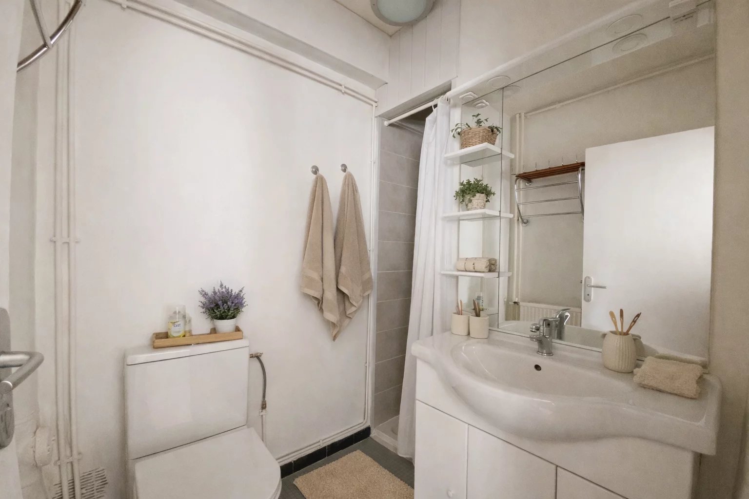 Dès l’entrée, vous trouverez un placard intégré apportant un espace de rangement appréciable. La salle de bain avec WC est pratique et bien agencée.