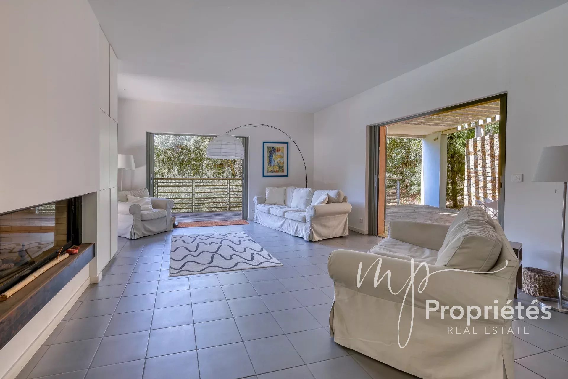 Au rez-de-chaussée, la villa se compose d'une entrée, d'une chambre avec placard donnant sur la terrasse, d'une salle de bain, d'une deuxième chambre avec placard et accès sur la terrasse, d'une cuisine ouverte entièrement équipée et aménagée avec accès sur la terrasse, ainsi que d'un vaste séjour/salon de 60m² avec cheminée, offrant une vue imprenable sur la large terrasse de 50m² et son puit de lumière, ainsi que de la piscine.