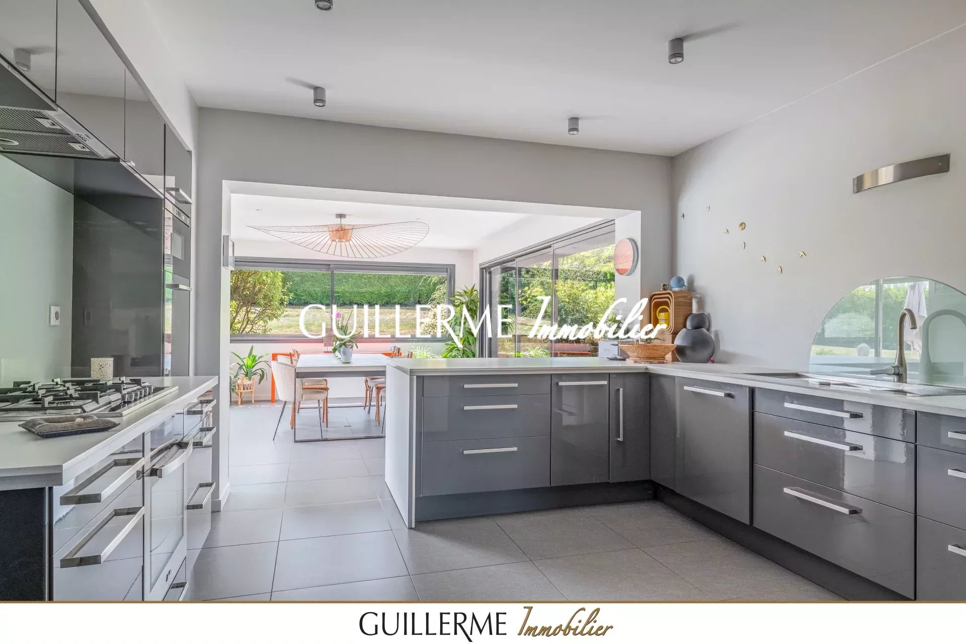 - Cuisine équipée ouverte sur une vaste salle à manger contemporaine, réalisée en 2011 avec baies vitrées coulissantes et brise-soleil orientables, offrant une superbe perspective sur le jardin et la piscine