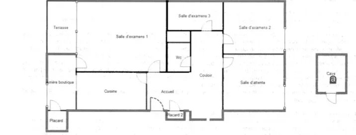 Il se compose d'une belle entrée avec un espace d'accueil, d’un espace de stérilisation avec un espace détente dans l'ancienne cuisine, un grand bureau l'ancien séjour ouvrant sur une terrasse, un second bureau, une salle d'attente, un espace de contrôle l'ancienne salle de bain et de WC indépendants.
