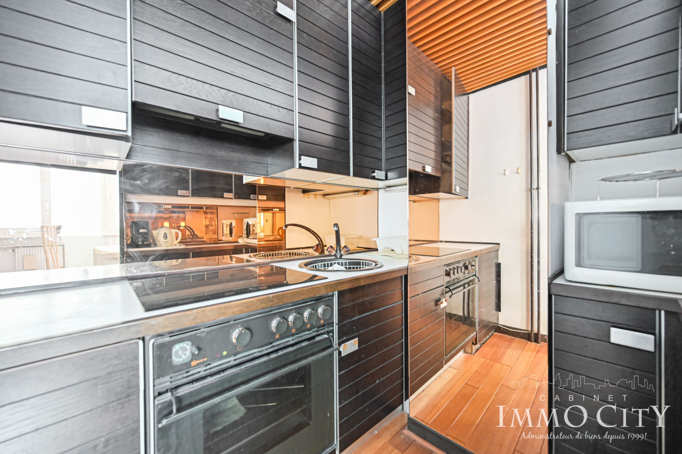 Une entrée avec rangements, un beau double séjour sur rue avec vue sur la Tour Eiffel, une cuisine semi ouverte aménagée et équipée et une salle d'eau et des wc séparés.