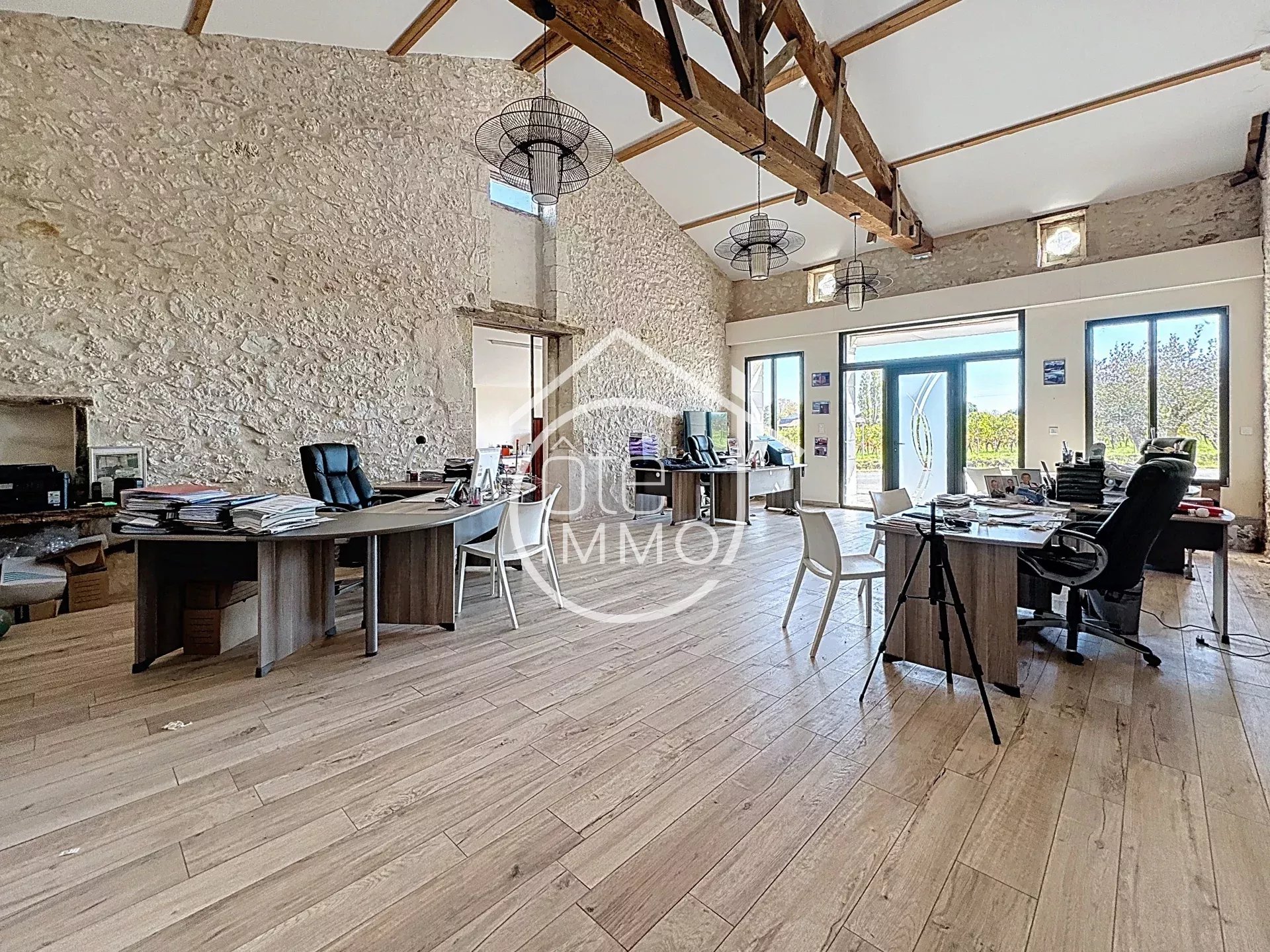 Côté Immo Pays Foyen vous présente cet ensemble professionnel, composé de deux vastes hangars, dont l’un offre une hauteur sous plafond d’environ 8 mètres. Vous y trouverez également deux espaces atelier, un vestiaire équipé d’une douche et de WC, un coin cuisine, ainsi qu’un grand espace de bureaux en open space, entièrement rénové avec goût. À l’extérieur, un vaste parking permet la circulation et le stationnement de véhicules de grande taille.