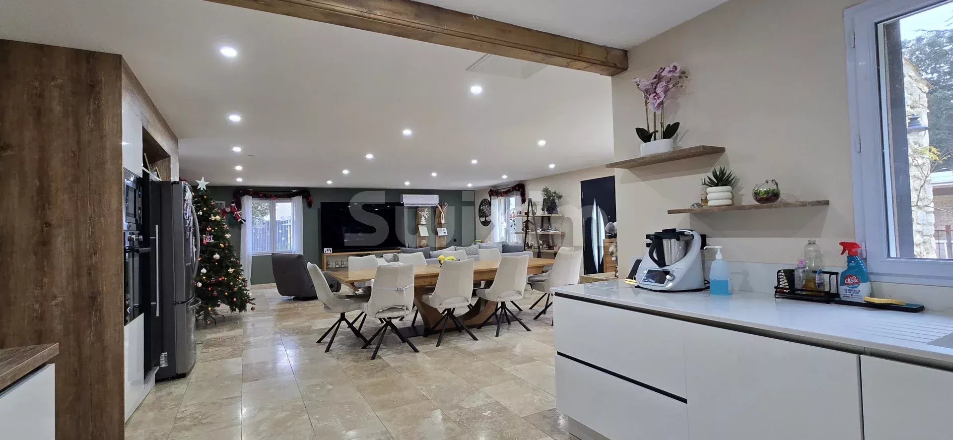 ref769ON : À Suze-la-Rousse, dans un quartier calme et prisé, découvrez cette villa de plain-pied de plus de 210 m², implantée sur un terrain clos et joliment paysagé d’environ 1 000 m². Rénovée récemment, elle offre un espace de vie lumineux et confortable : Le séjour (83 m²) s’ouvre sur les terrasses et la piscine. La cuisine, entièrement rénovée et équipée, s’intègre parfaitement à l’espace. La maison compte quatre chambres, dont une suite parentale avec dressing et salle de bain privative. S’ajoutent une salle d’eau indépendante et une buanderie. Un espace attenant et communicant, composé d’un bureau/dressing et d’une seconde cuisine, peut facilement devenir un petit gîte ou un studio indépendant selon les besoins. À l’extérieur, vous profiterez d’une piscine chauffée, d’un pool house, d’un SPA discret, ainsi que de plusieurs terrasses permettant de profiter du jardin à toute heure. Pour votre confort : climatisation réversible, volets électriques, portail motorisé, visiophone et alarme. Une maison idéale pour une famille ou une résidence secondaire, à proximité directe du village, des commerces et des écoles.