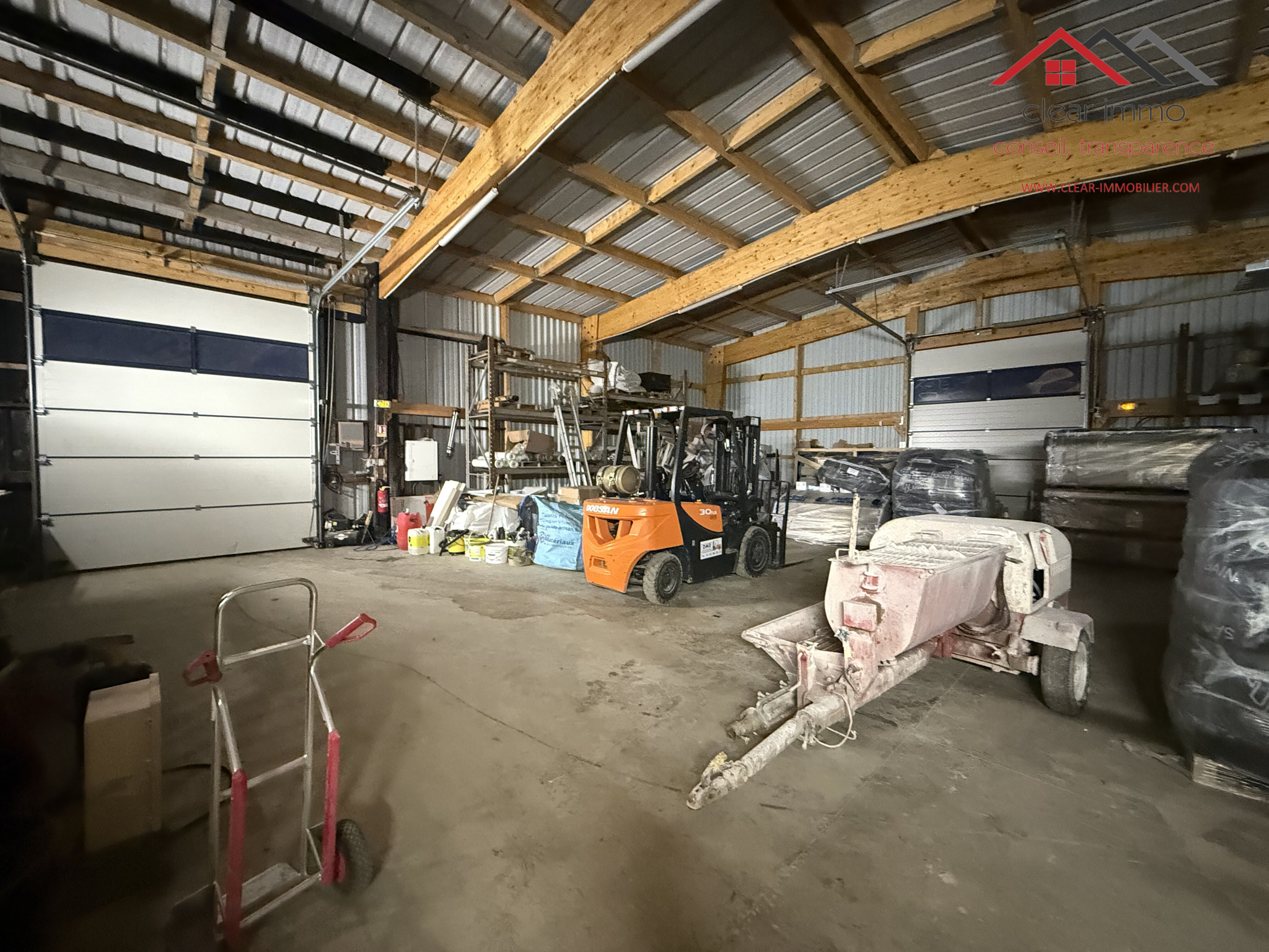 Le bâtiment dispose de 2 portes sectionnelles électriques de 3 m de largeur par 4,5 m de hauteur, facilitant l'accès aux véhicules utilitaires et poids lourds.