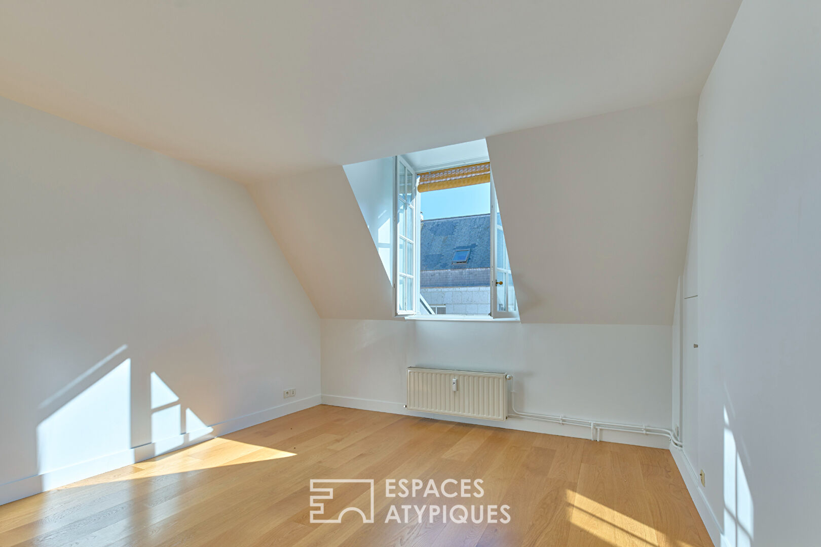 Dévoilant une vue saisissante sur l'Hôtel de Salé, qui abrite le Musée Picasso, ce duplex de 145,44 m² au sol (120,60 m² loi Carrez) se niche aux deux derniers étages, par ascenseur, d'un Hôtel particulier du XVIIIe siècle, classé Monument Historique. L'appartement s'ouvre sur un vaste espace de vie traversant et baigné de lumière , de plus de 55 m² , qui offre une vue unique sur les toits Parisiens, le Musée Picasso, la Tour Eiffel et le Centre Pompidou. Dans le prolongement, une cuisine dinatoire semi-ouverte, pensée comme une pièce à part entière, invite à la convivialité. Une chambre avec salle d'eau privative, un espace bureau et des toilettes invités complètent ce premier niveau. A l'étage supérieur, prennent place deux chambres dont la configuration modulable permet de créer également une suite parentale ou un espace de travail sous les toits. Une salle de bains et des toilettes indépendantes complètent l'ensemble. La vue imprenable sur les monuments emblématiques Parisiens, une lumière omniprésente et un calme absolu en plein coeur du Paris historique et artistique confèrent à cet appartement un caractère unique et d'une grande rareté. Une cave complète ce bien. Une place de parking (en sus du prix) est disponible à proximité. Métro Saint-Sébastien Froissart, Saint-Paul Ce bien est soumis au statut de la copropriété. CLASSE ENERGIE: C/ CLASSE CLIMAT : C Montant moyen estimé des dépenses annuelles d'énergie pour un usage standard, indexées aux années 2021, 2022, 2023 : entre 1170 euros et 1630 euros (abonnement compris). Les informations sur les risques auxquels ce bien est exposé sont disponibles sur le site Géorisques : https://www.georisques.gouv.fr. Contact : Sandra Mascio 06 27 52 75 81 RSAC : 510 809 171 Paris Copropriété de 25 lots (Pas de procédure en cours). Charges annuelles : 4560 euros.