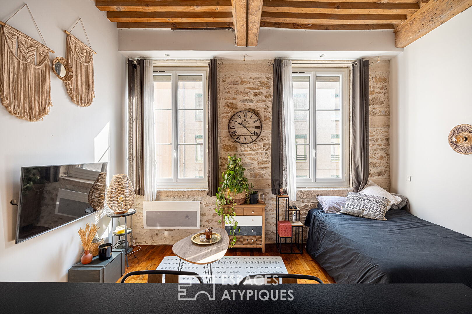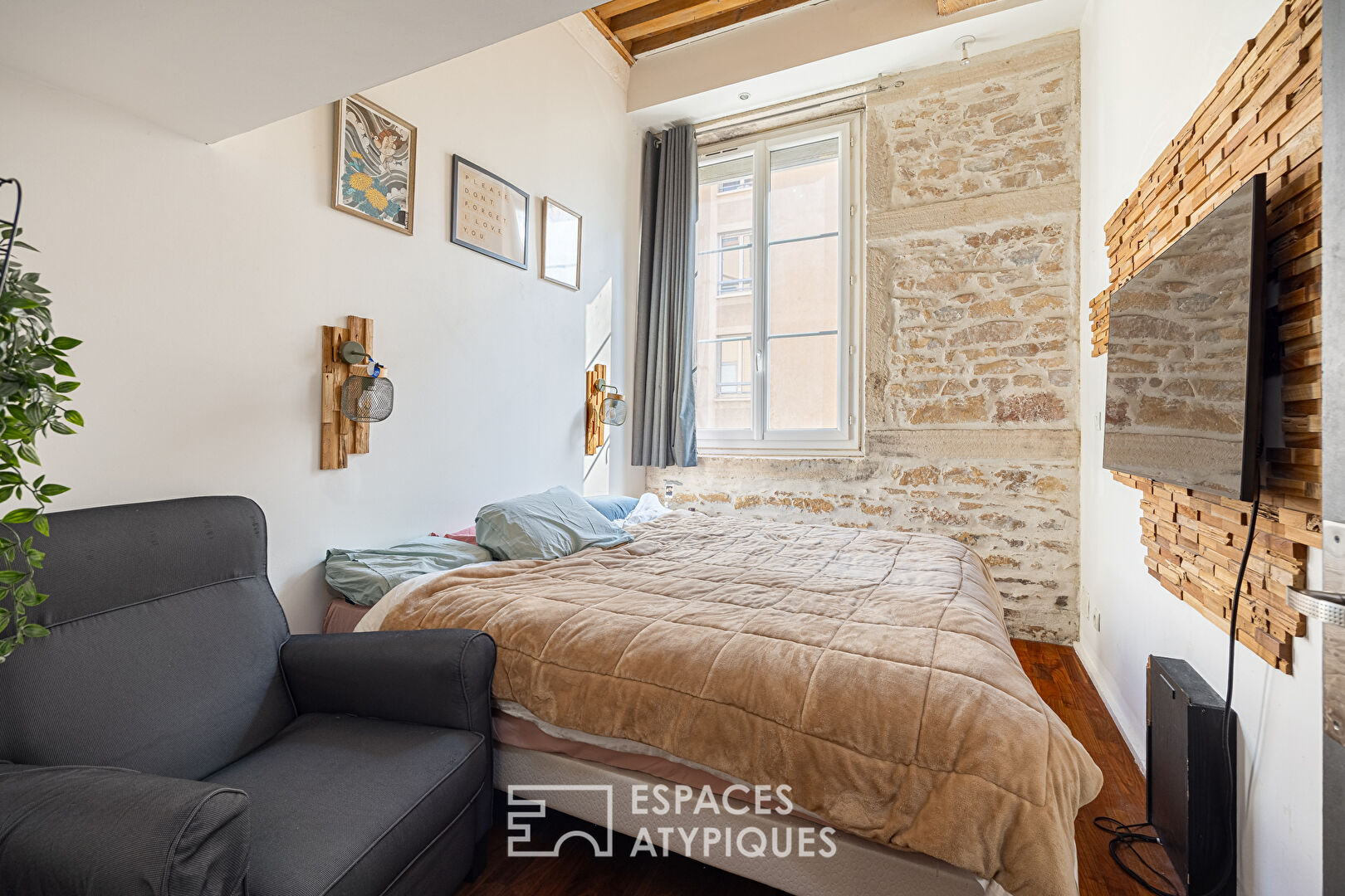 Situé au coeur du 1er arrondissement de Lyon, cet appartement canut de charme d'une superficie de 57 m² Carrez, complétée par une mezzanine de 16 m², se niche dans une petite copropriété au calme, au deuxième étage sur trois. Baigné de lumière grâce à son exposition plein sud, il séduit par le caractère unique de son architecture alliant cachet de l'ancien et confort contemporain. L'entrée s'ouvre sur une pièce de vie où les poutres apparentes et les murs en pierre créent une atmosphère chaleureuse et authentique. L'espace est structuré autour d'une cuisine ouverte, moderne et fonctionnelle, donnant sur un séjour à la belle hauteur sous plafond. La mezzanine, accessible par un escalier intégré au mobilier, offre un espace supplémentaire propice à un bureau ou une chambre d'appoint. Le bien se compose également de deux chambres, d'une salle d'eau élégante, d'une buanderie indépendante et d'un WC séparé. Deux greniers viennent compléter cet ensemble, offrant des volumes de rangement appréciables. A quelques pas, les commerces, écoles et transports en commun facilitent le quotidien. Ce bien rare séduit par son authenticité et son atmosphère singulière, où le bois, la pierre et la lumière dialoguent harmonieusement. Soumis au statut de la copropriété : 12 lots Charges annuelles 1228 euros CLASSE ÉNERGIE : D / CLASSE CLIMAT : B Montant moyen estimé des dépenses annuelles d'énergie pour un usage standard, établi à partir des prix de l'énergie de l'année 2021, 2022, 2023 : entre 930 euros et 1 310 euros Contact : Adrien - 06 09 55 70 81 Copropriété de 12 lots - dont 12 lots habitation. (Pas de procédure en cours). Charges annuelles : 1228 euros. Adrien AUGIER (EI) Agent Commercial - Numéro RSAC : 909 000 945 - LYON.