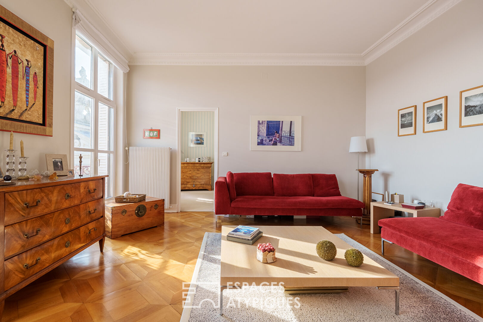 Lové au troisième étage avec ascenseur d'un immeuble de 1890, cet appartement déploie 86 m² d'une élégance intemporelle. Entièrement rénové dans les règles de l'art, il allie le cachet historique à un confort contemporain en hyper-centre de Nancy. La lumière y circule librement, soulignant la qualité des matériaux conservés. Dès l'entrée, le ton est donné par une belle hauteur sous plafond de trois mètres, soulignée par le charme des moulures, ouvrant sur un espace de vie aux volumes généreux. L'appartement entier, baigné de lumière grâce à ses grandes ouvertures et son exposition, profite d'une vue dégagée sur les toits de Nancy. Le sol est sublimé par un parquet massif style Versailles, créant une atmosphère chaleureuse. Dans le séjour, une majestueuse cheminée en noyer massif ornée de son miroir d'époque XVIIIe siècle confère un caractère singulier à la pièce. Une cuisine indépendante de style anglais prolonge l'espace de réception. Côté nuit, la distribution s'organise autour de deux chambres au calme, chacune bénéficiant de rangements intégrés. L'une d'elles offre une vue privilégiée sur la porte Saint-Georges. Une salle de bains rénovée avec goût complète l'agencement. Situé dans une copropriété calme et entretenue, ce bien bénéficie d'une situation urbaine optimale. L'environnement immédiat offre un accès facilité à toutes les commodités : commerces à quelques minutes à pied, écoles, marché central, et la célèbre Place Stanislas, accessible en seulement sept minutes de marche. Pour une mobilité aisée, la station de trolleybus passe à quelques pas de l'immeuble. La jouissance d'une cave voûtée sécurisée et d'un grenier ajoute une praticité recherchée. Le stationnement extérieur est aisé à proximité immédiate, avec des possibilités de parking en location dans le voisinage. Cet appartement de caractère conjugue l'âme de l'ancien, des matériaux nobles et une situation géographique centrale. Il représente une opportunité rare sur le marché grâce à l'ensemble de ses éléments de style, son ascenseur et sa luminosité parfaite. Une visite s'impose pour en apprécier pleinement le charme singulier. CLASSE ENERGIE : D / CLASSE CLIMAT : D Montant moyen estimé des dépenses annuelles d'énergie pour un usage standard, établi à partir des prix de l'énergie de l'année 2021 : entre 1280 et 1780 euros Contact : Gaëlle : 06.88.37.96.71 Copropriété de 56 lots - dont 16 lots habitation. (Pas de procédure en cours). Charges annuelles : 1572 euros. Gaëlle TAPISSIER (EI) Agent Commercial - Numéro RSAC : 530 344 498 - Nancy.
