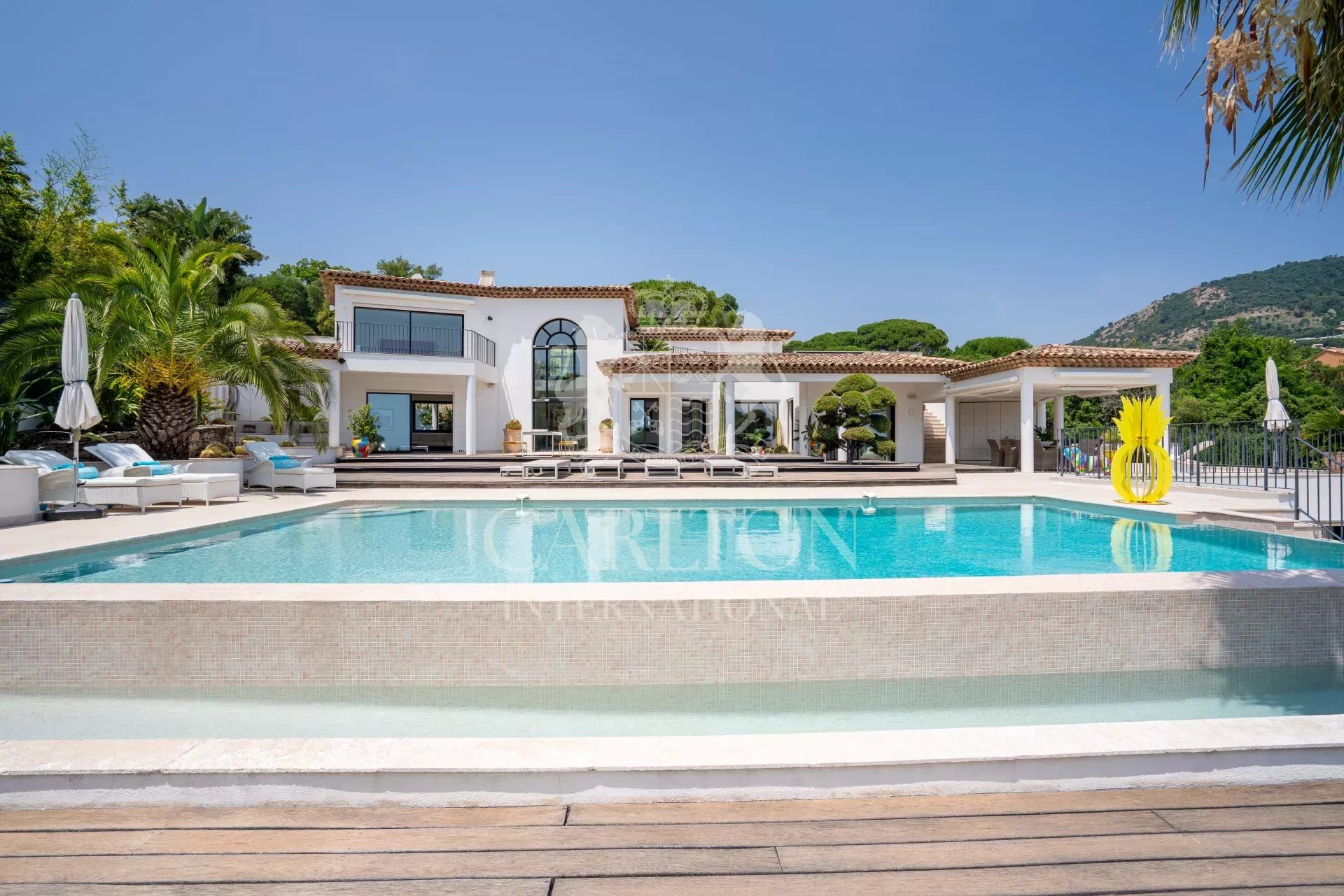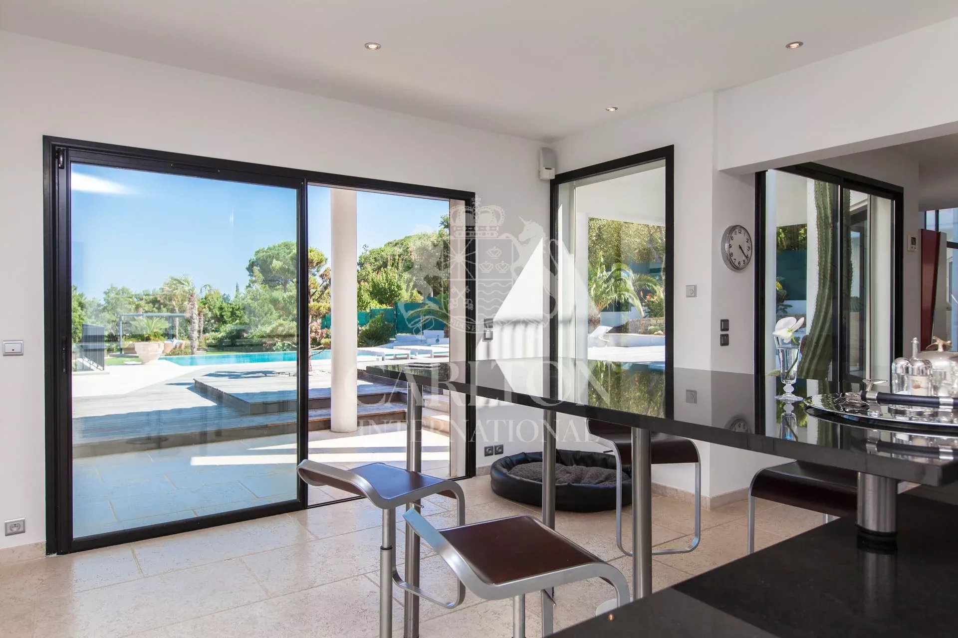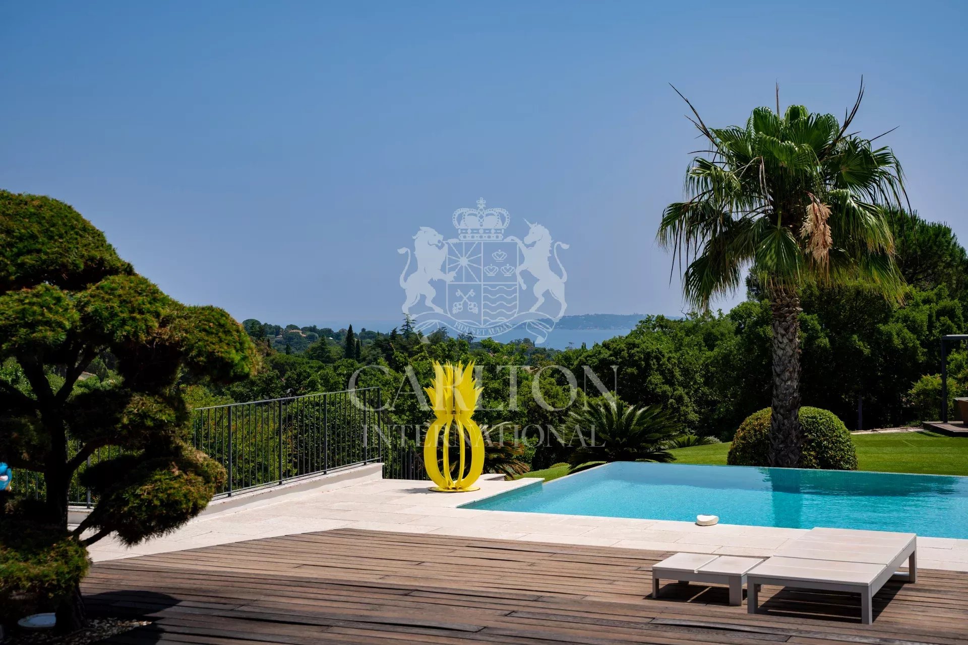 Immersa in un tranquillo contesto residenziale, proprio accanto al campo da golf di Beauvallon, questa villa contemporanea di circa 350 m² gode di una spettacolare vista panoramica sul mare e sull'emblematico villaggio di Saint Tropez. Inserita in un terreno paesaggistico di circa 3.200 m², vanta un'architettura luminosa, linee pulite e materiali di qualità eccellente. Le sale di rappresentanza si aprono armoniosamente su un'ampia terrazza in quercia e su un'elegante piscina riscaldata di 12 x 6 metri. Il salone, la sala da pranzo e la cucina completamente attrezzata godono di un'eccezionale luce naturale. Al piano superiore, la suite padronale dispone di una terrazza privata con vista sul mare, mentre una zona ufficio o biblioteca conduce a una terrazza solarium. Il piano giardino ospita tre camere da letto per gli ospiti, ciascuna con bagno privato con doccia, ripostiglio incorporato e accesso diretto al giardino. Un'oasi di pace a pochi minuti dalle spiagge di Pampelonne e dal cuore di Saint Tropez. Questa rara proprietà viene venduta con un golf cart e gode di un accesso diretto e privilegiato al campo da golf di Beauvallon, riservato a un numero molto limitato di proprietari. I costi energetici medi nel 2024 saranno compresi tra 2689 e 3637 euro all'anno. Le spese di agenzia sono a carico del venditore. Le informazioni sui rischi a cui è esposto questo immobile sono disponibili sul sito web di Géorisques http://www.georisques.gouv.fr. LE00216