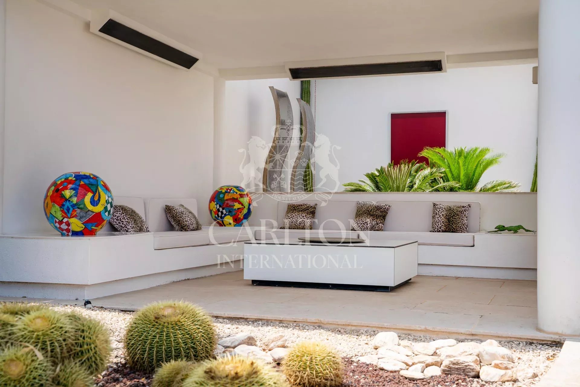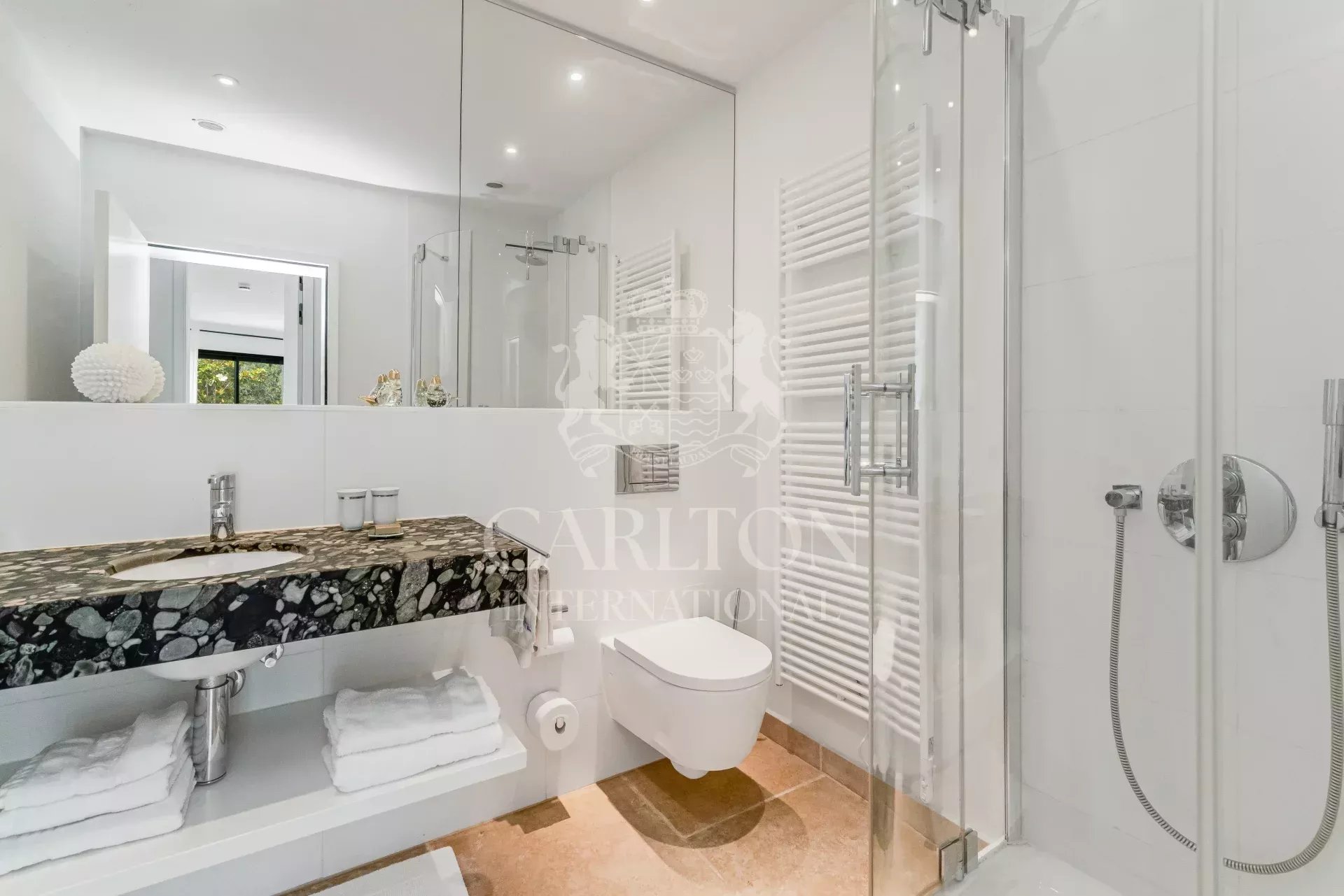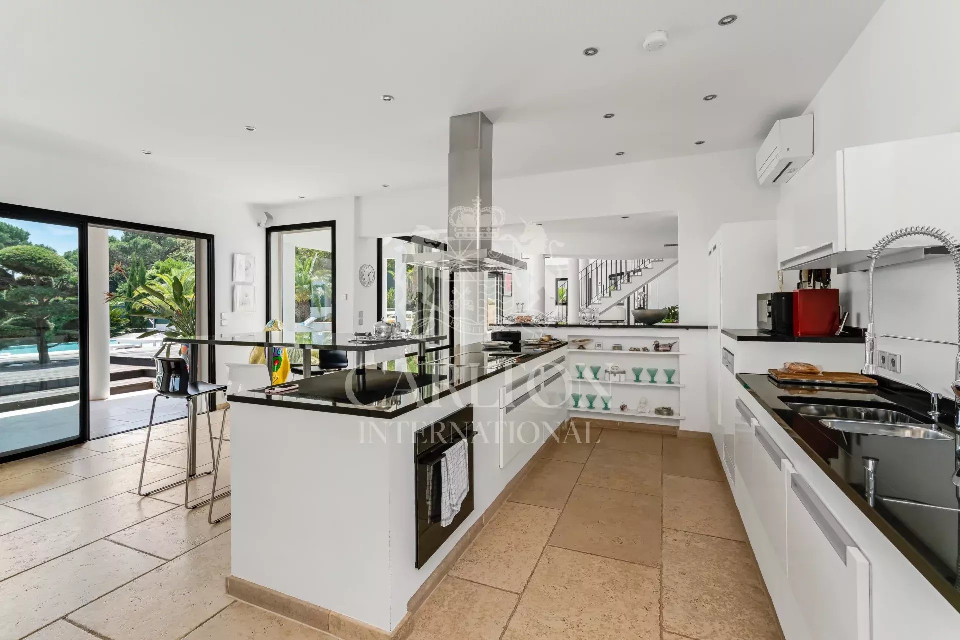 Immersa in un tranquillo contesto residenziale, proprio accanto al campo da golf di Beauvallon, questa villa contemporanea di circa 350 m² gode di una spettacolare vista panoramica sul mare e sull'emblematico villaggio di Saint Tropez. Inserita in un terreno paesaggistico di circa 3.200 m², vanta un'architettura luminosa, linee pulite e materiali di qualità eccellente. Le sale di rappresentanza si aprono armoniosamente su un'ampia terrazza in quercia e su un'elegante piscina riscaldata di 12 x 6 metri. Il salone, la sala da pranzo e la cucina completamente attrezzata godono di un'eccezionale luce naturale. Al piano superiore, la suite padronale dispone di una terrazza privata con vista sul mare, mentre una zona ufficio o biblioteca conduce a una terrazza solarium. Il piano giardino ospita tre camere da letto per gli ospiti, ciascuna con bagno privato con doccia, ripostiglio incorporato e accesso diretto al giardino. Un'oasi di pace a pochi minuti dalle spiagge di Pampelonne e dal cuore di Saint Tropez. Questa rara proprietà viene venduta con un golf cart e gode di un accesso diretto e privilegiato al campo da golf di Beauvallon, riservato a un numero molto limitato di proprietari. I costi energetici medi nel 2024 saranno compresi tra 2689 e 3637 euro all'anno. Le spese di agenzia sono a carico del venditore. Le informazioni sui rischi a cui è esposto questo immobile sono disponibili sul sito web di Géorisques http://www.georisques.gouv.fr. LE00216