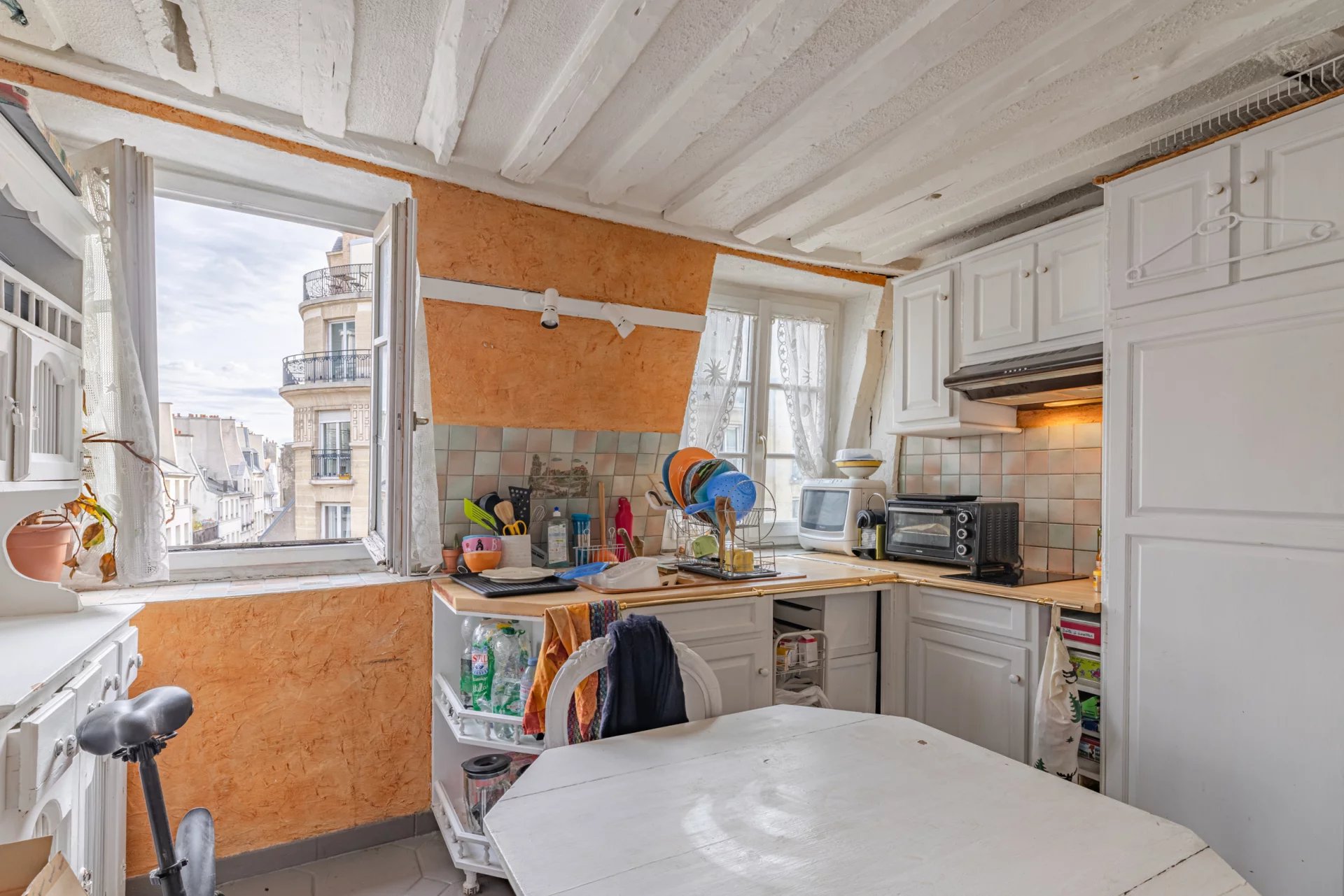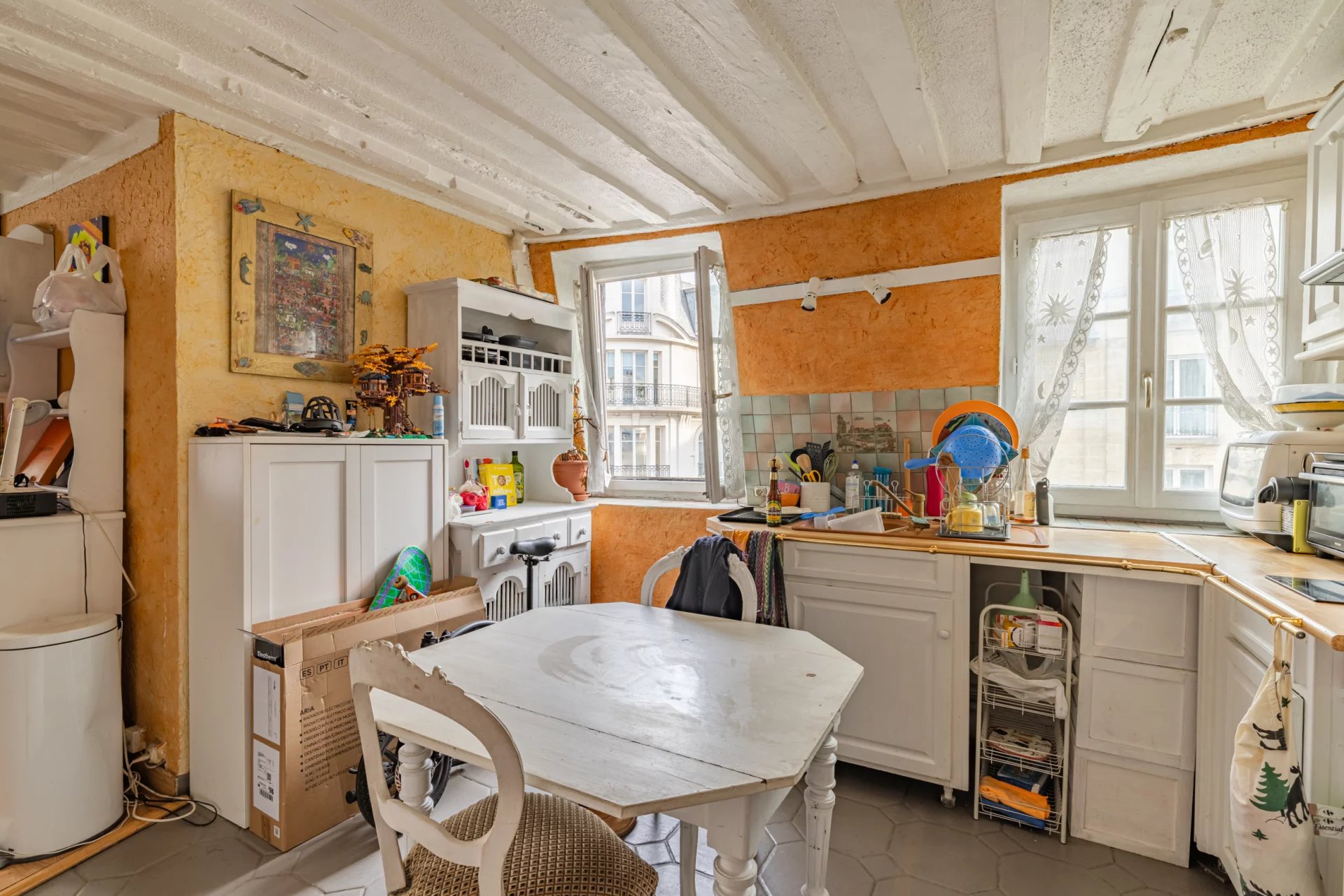 Exclusivité. Situé rue Beaubourg, à l'angle de la rue des Gravilliers et de ses nombreux commerces, au 5e étage d'un petit immeuble du 17e siècle bien entretenu, ce joli 2 pièces de 35,84m2 loi Carrez et 38,44m2 au sol vous séduira par son cachet typique du Marais et ses perspectives dégagées. Il se compose d'une entrée avec cuisine ouverte et espace dinatoire, un séjour avec cheminée fonctionnelle, un espace nuit en alcôve, une salle de douche et un wc séparé.