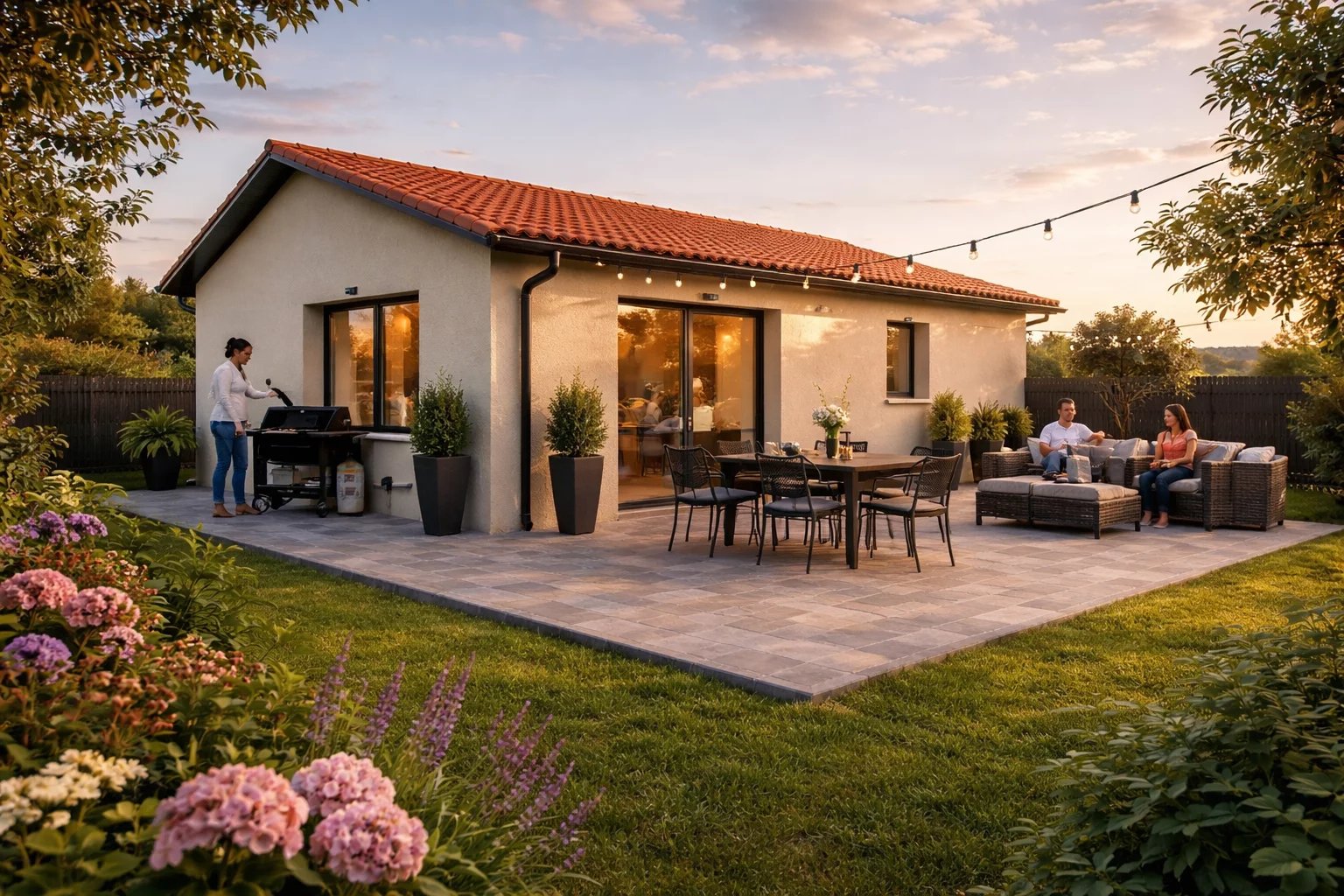Je propose, à 20 minutes de Saint Etienne et 40 minutes de Lyon, sur les hauteurs de St Chamond dans un lotissement paisible, une charmante maison de plain-pied conforme aux normes RE 2020, d'environ 85 m² habitables. Découvrez une pièce de vie lumineuse de presque 40 m² avec cuisine ouverte, un WC indépendant, un cellier et plusieurs ouvertures donnant sur l'espace extérieur. Trois belles chambres, dont une indépendante, toutes équipées de placards muraux, ainsi qu'une salle de bain spacieuse à personnaliser selon vos préférences. Pour Compléter cette maison, vous trouverez un garage avec un accès direct sur le cellier. Les prestations de qualité comprennent des murs en brique, un chauffage par pompe à chaleur avec climatisation, un carrelage 60x60, menuiseries anthracites, baies vitrées et volets roulants aluminium, et un boîtier pour la gestion à distance de votre maison. L'environnement agréable et les volumes généreux font de cette maison un lieu de vie plaisant. Le tout est implanté sur un terrain plat de 500 m² situé dans un lotissement avec un cadre champêtre. Le projet est modifiable avec une étude personnalisée selon vos désirs et besoins, à partir de 258 000€ maison + terrain (assurance dommage ouvrage comprise). Veuillez noter que ce prix n'inclut pas les taxes, frais de viabilisation et finitions. Pour plus d'informations, n'hésitez pas à me contacter ! *Hypothèse d'implantation de maison neuve sur un terrain proposé par notre partenaire foncier. Mots clés : Maison, Villa, Construction, Terrain constructible, Lotissement, RE2020, Neuf, Viabilisé, appartement, copropriété, maison individuelle, résidence, habitation, logement, bâtiment, aménagement, plans, Jardin, Terrasse, Garage, Chambre, Cuisine, Salle de bains, Salon, Escalier, Toit, Fenêtre