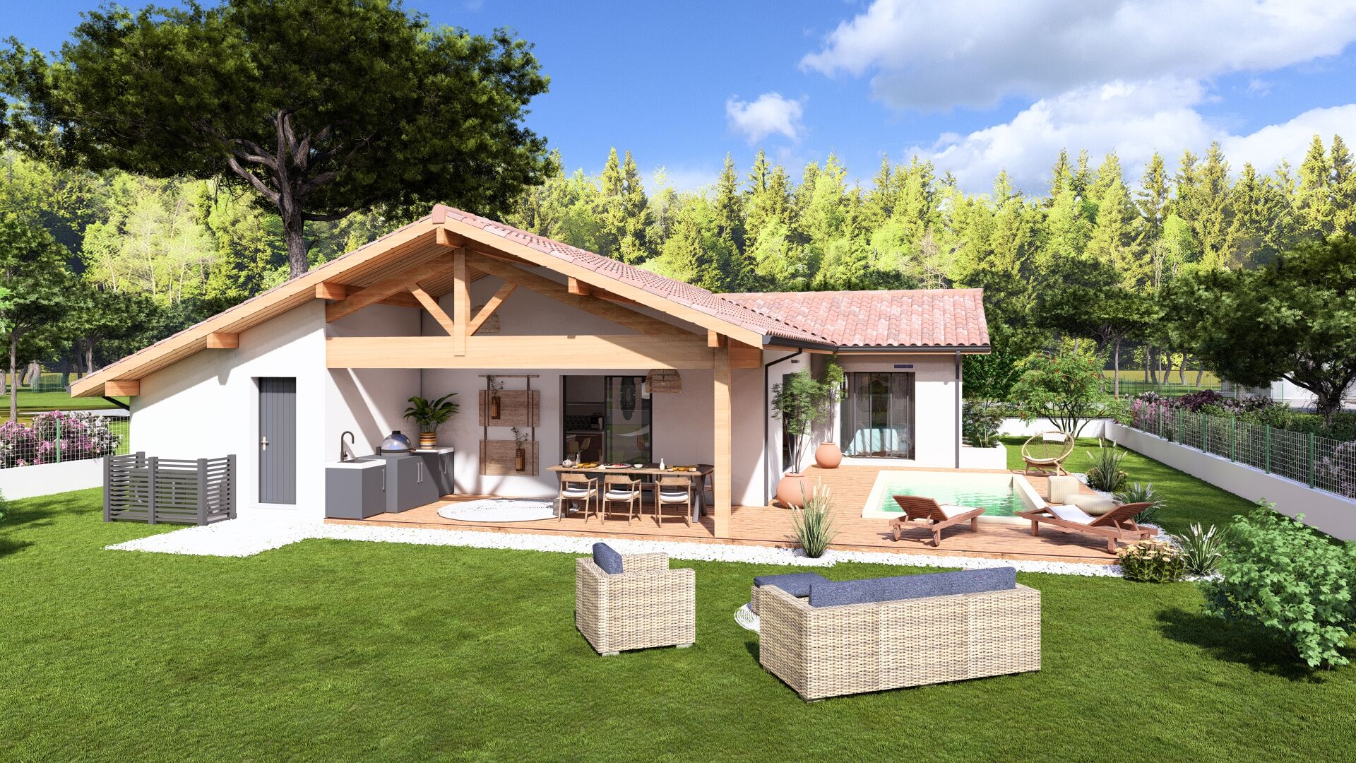 Maison + terrain + frais de notaire + terrassement + raccordements à partir de 411 500 euros. Dommages-ouvrage et garanties de parfait achèvement et de livraison à prix et délais convenus incluses.
