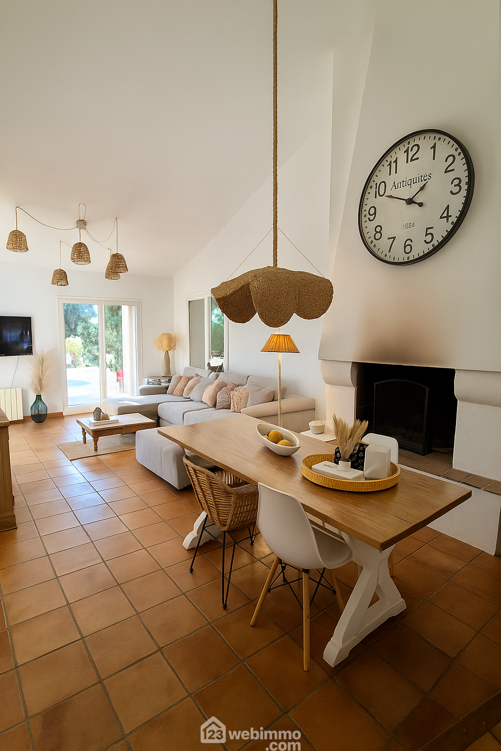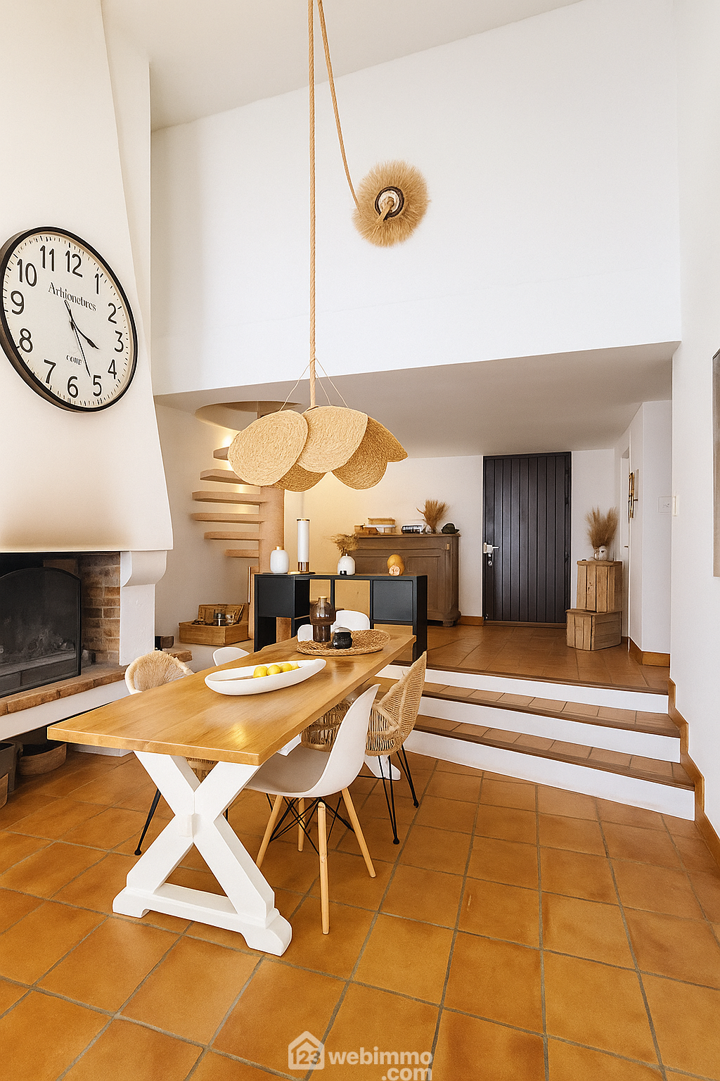 La superficie de la villa est de 124 m², cette propriété offre une grande pièce de vie lumineuse avec une belle hauteur sous plafond, une cheminée et 1 cuisine entièrement équipée.