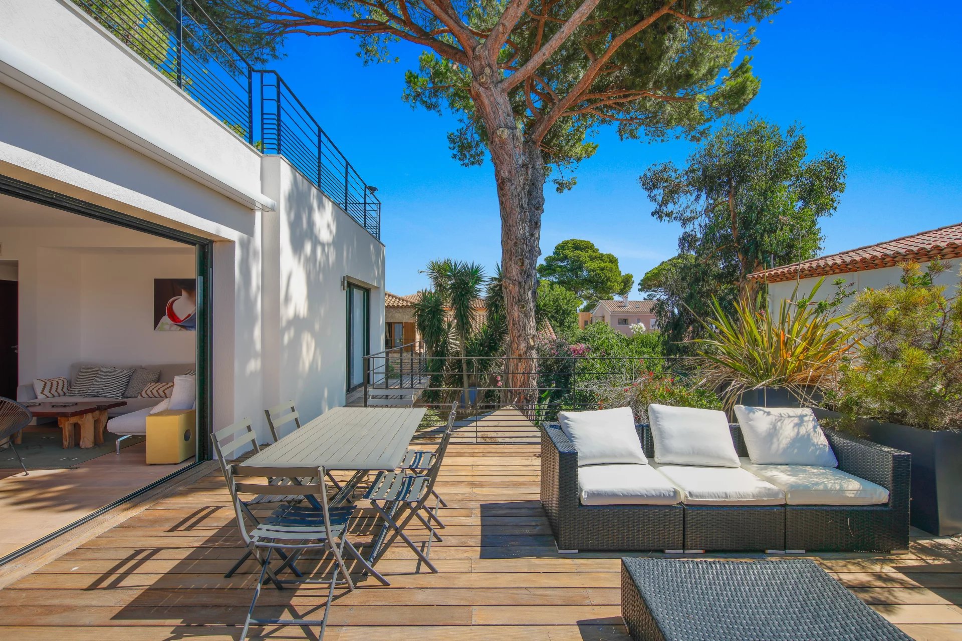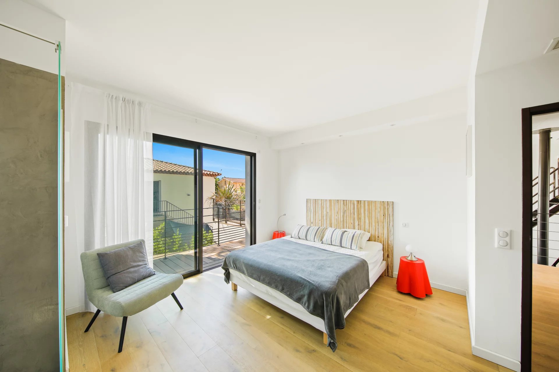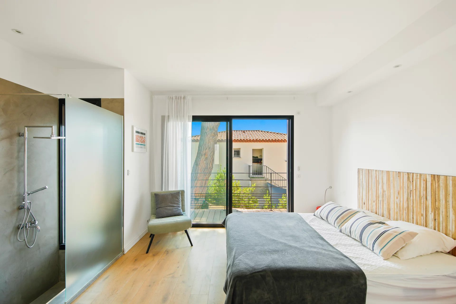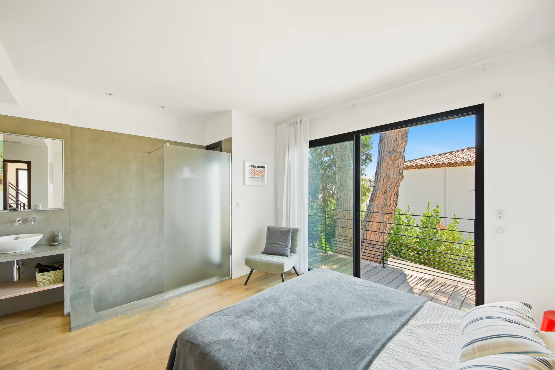 L'étage se compose d'un salon TV s'ouvrant sur une vaste terrasse bois et de la suite parentale avec salle de bains, dressing, bureau et un wc.