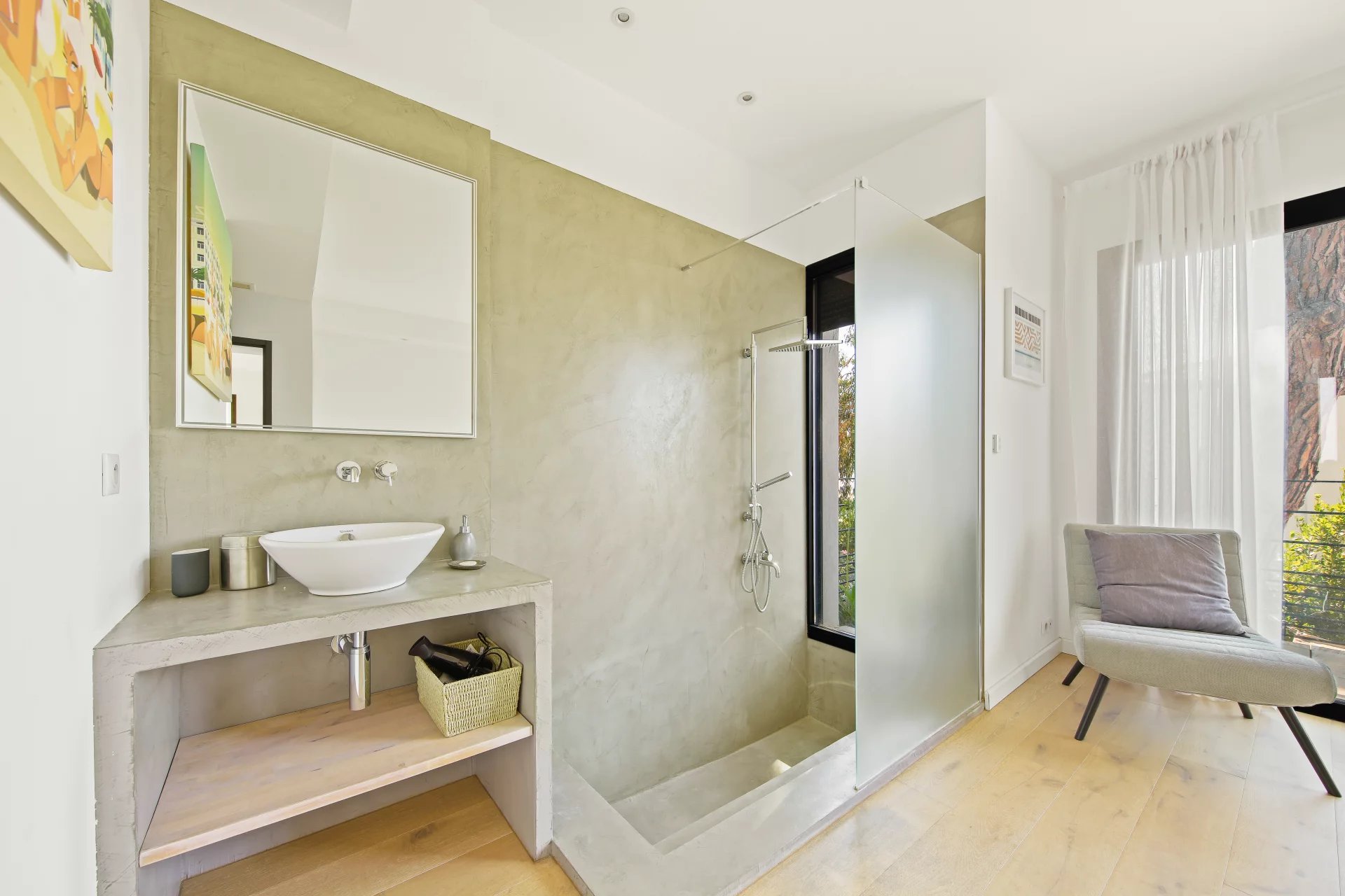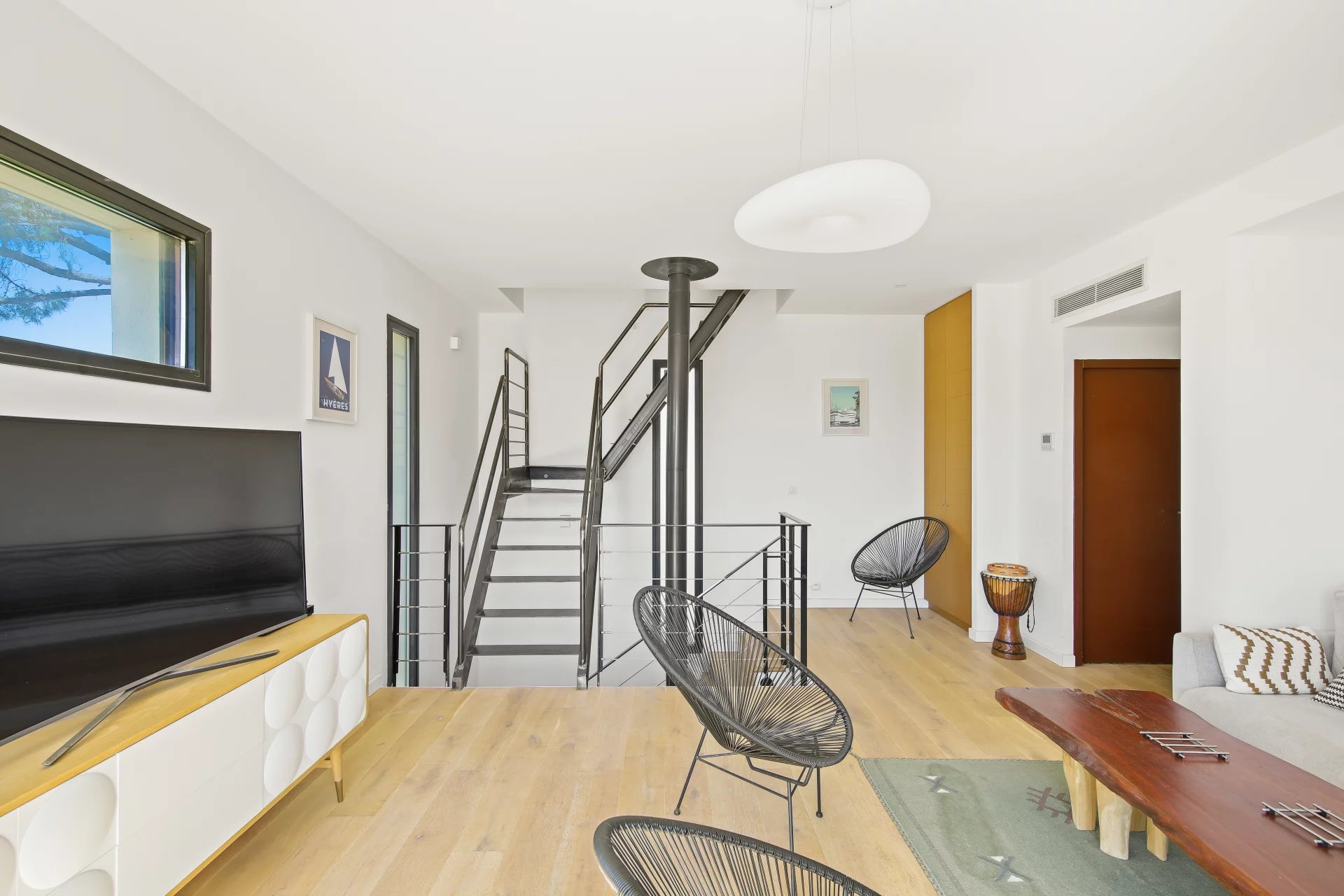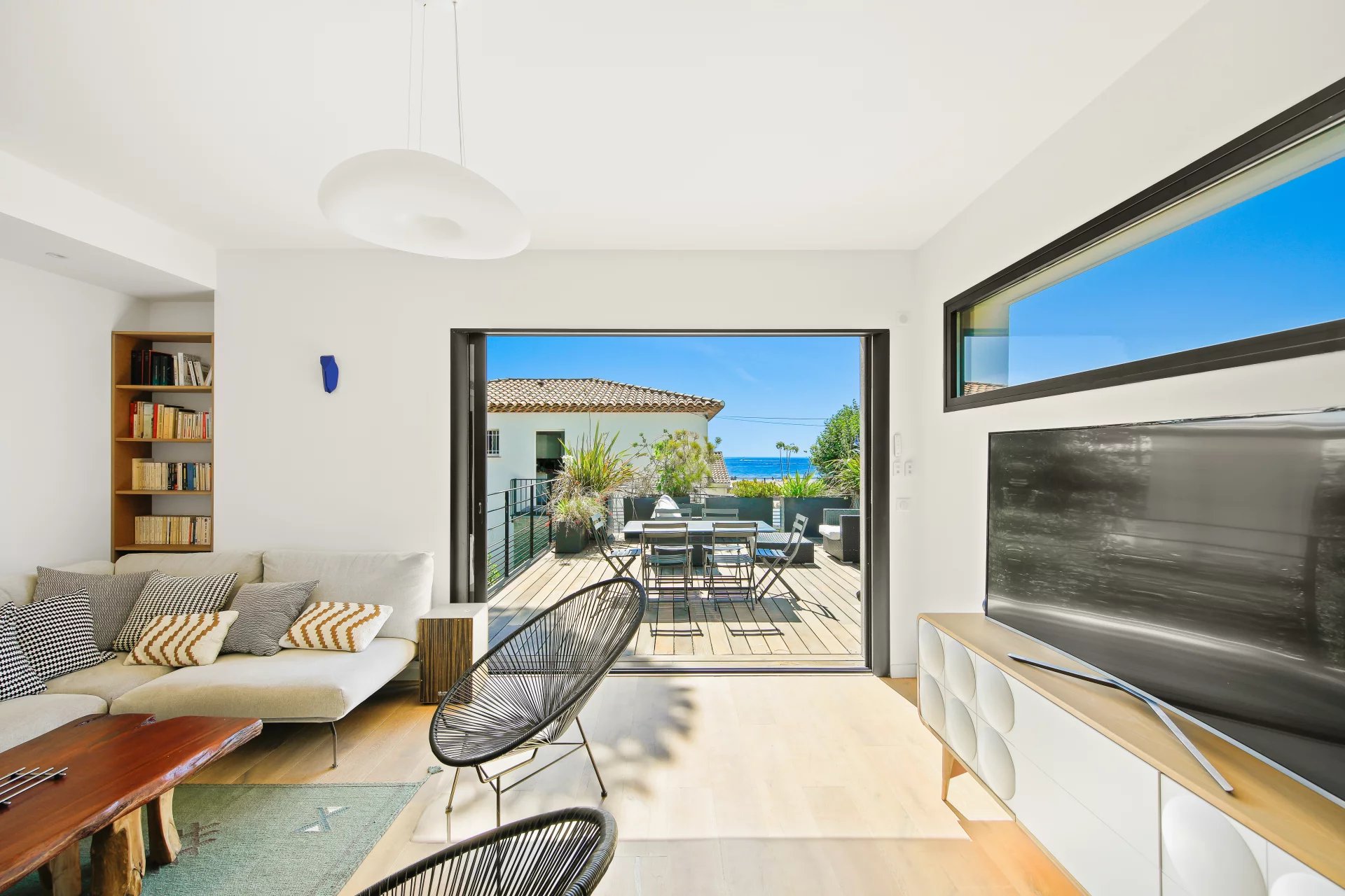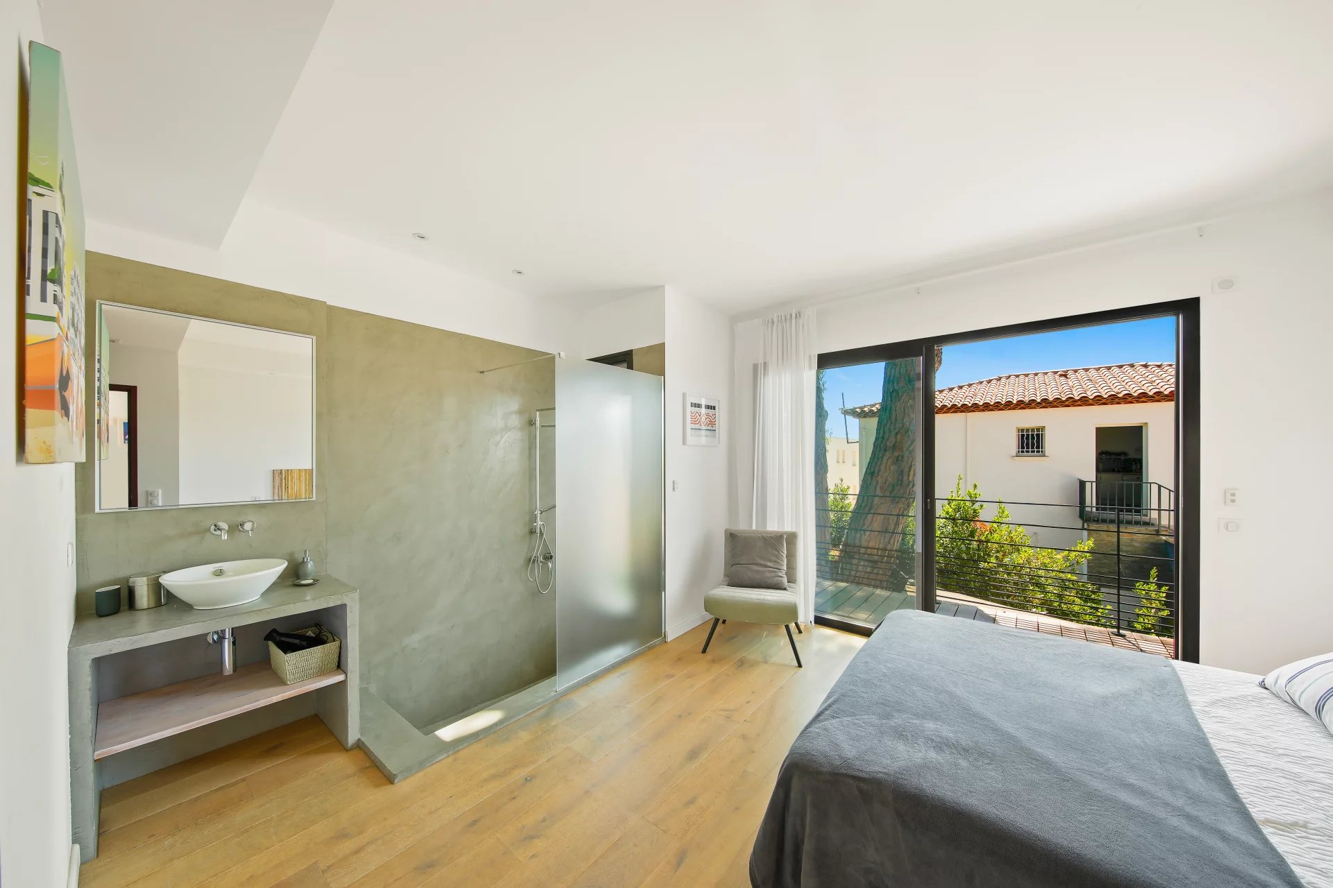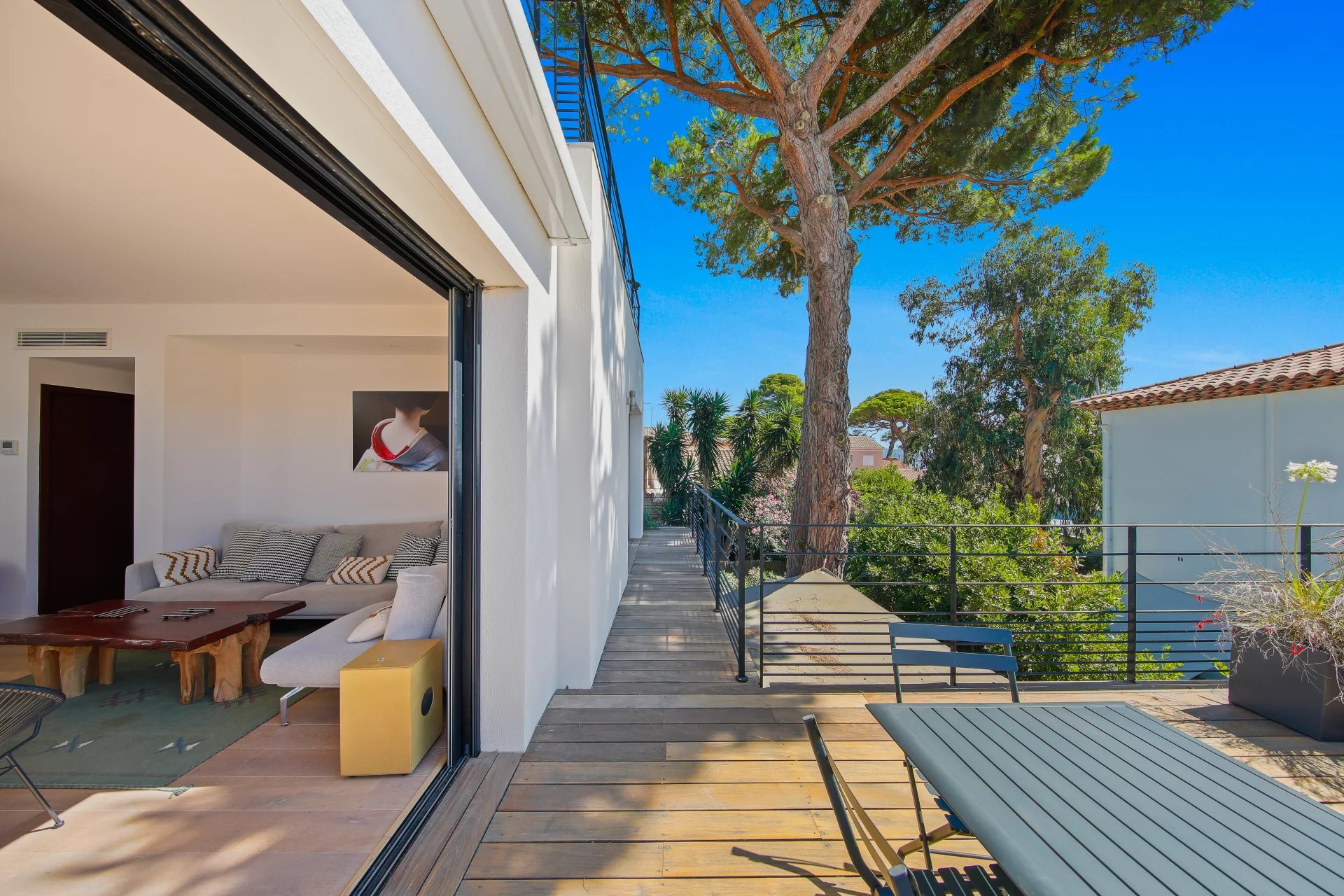 L'étage se compose d'un salon TV s'ouvrant sur une vaste terrasse bois et de la suite parentale avec salle de bains, dressing, bureau et un wc.