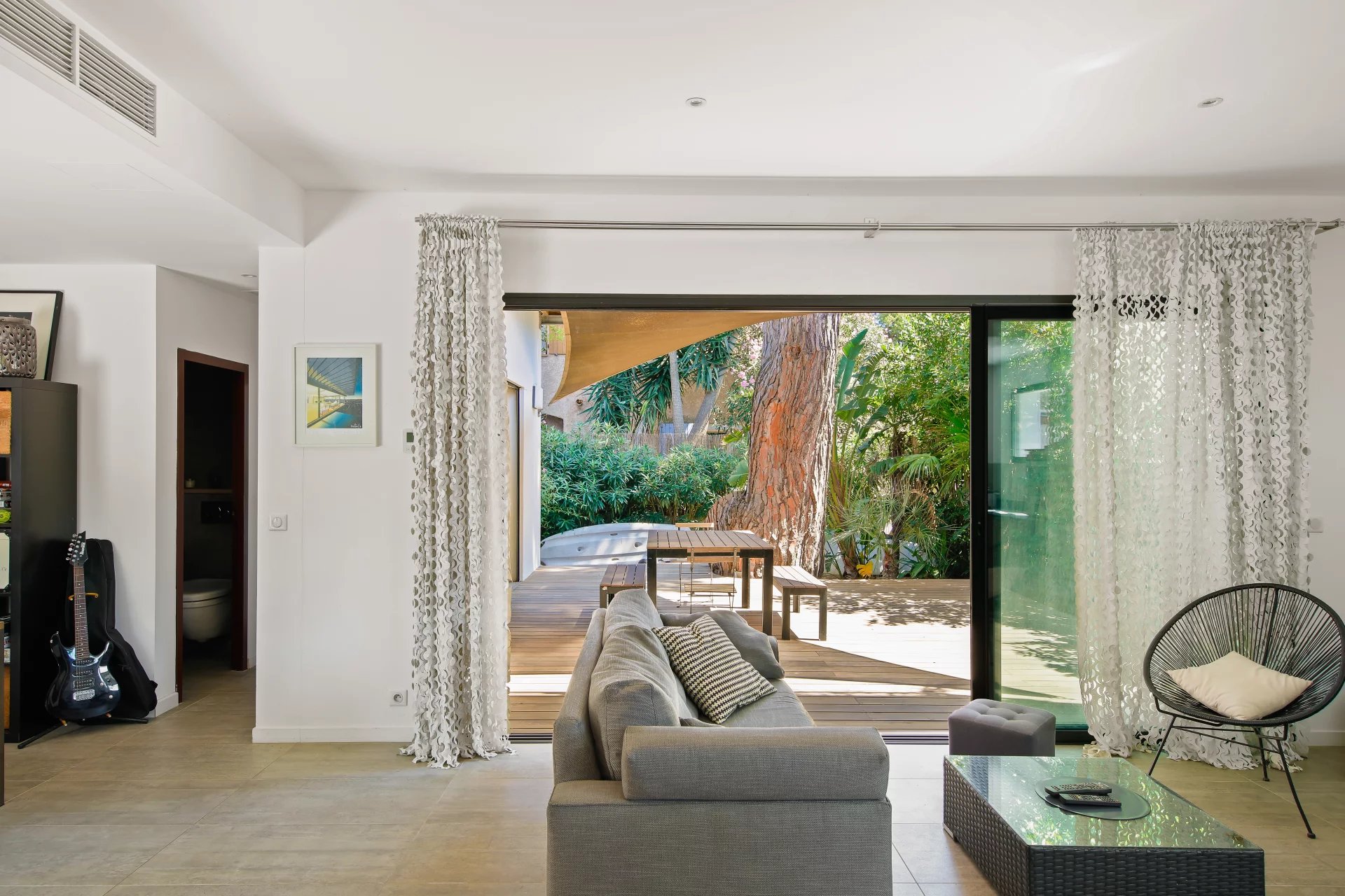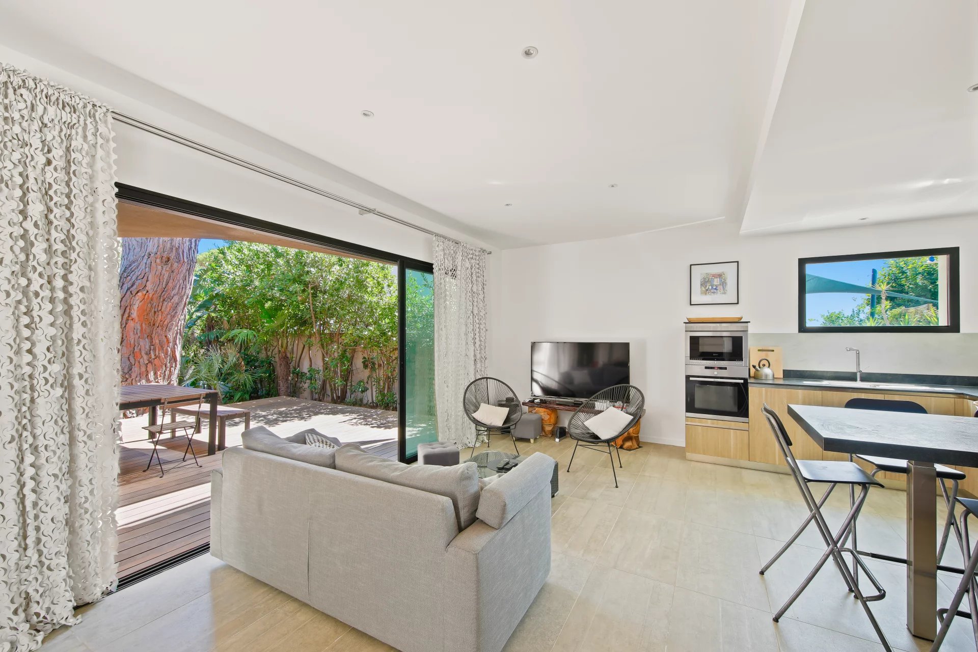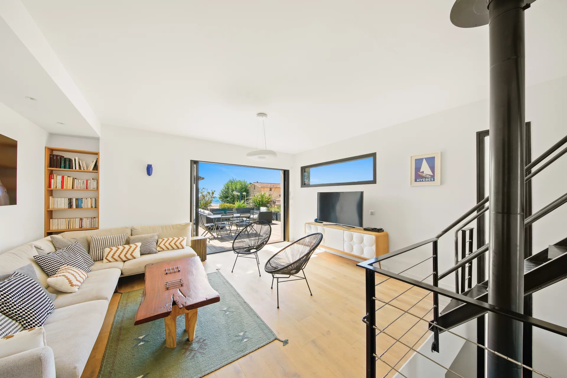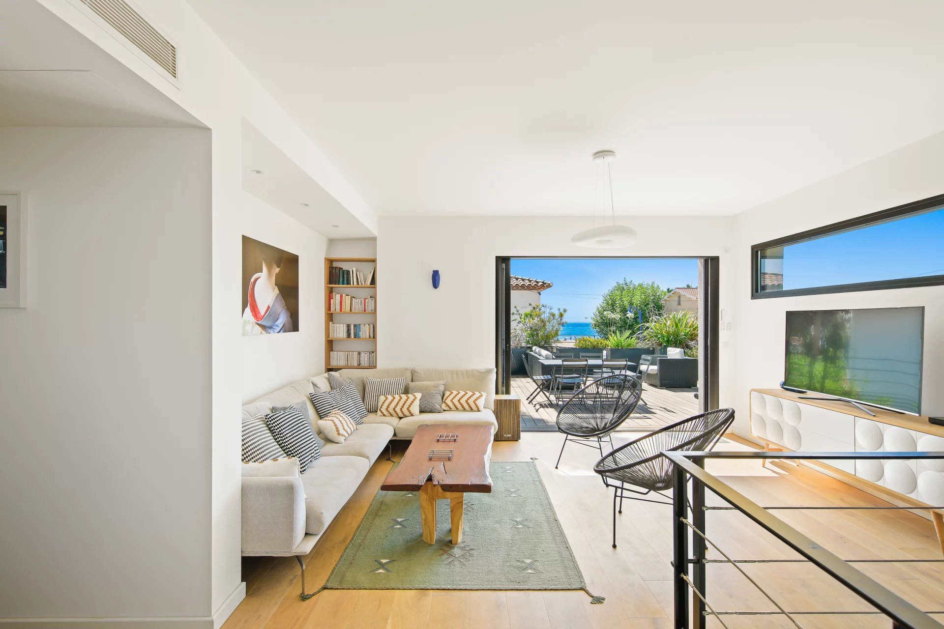 L'étage se compose d'un salon TV s'ouvrant sur une vaste terrasse bois et de la suite parentale avec salle de bains, dressing, bureau et un wc.
