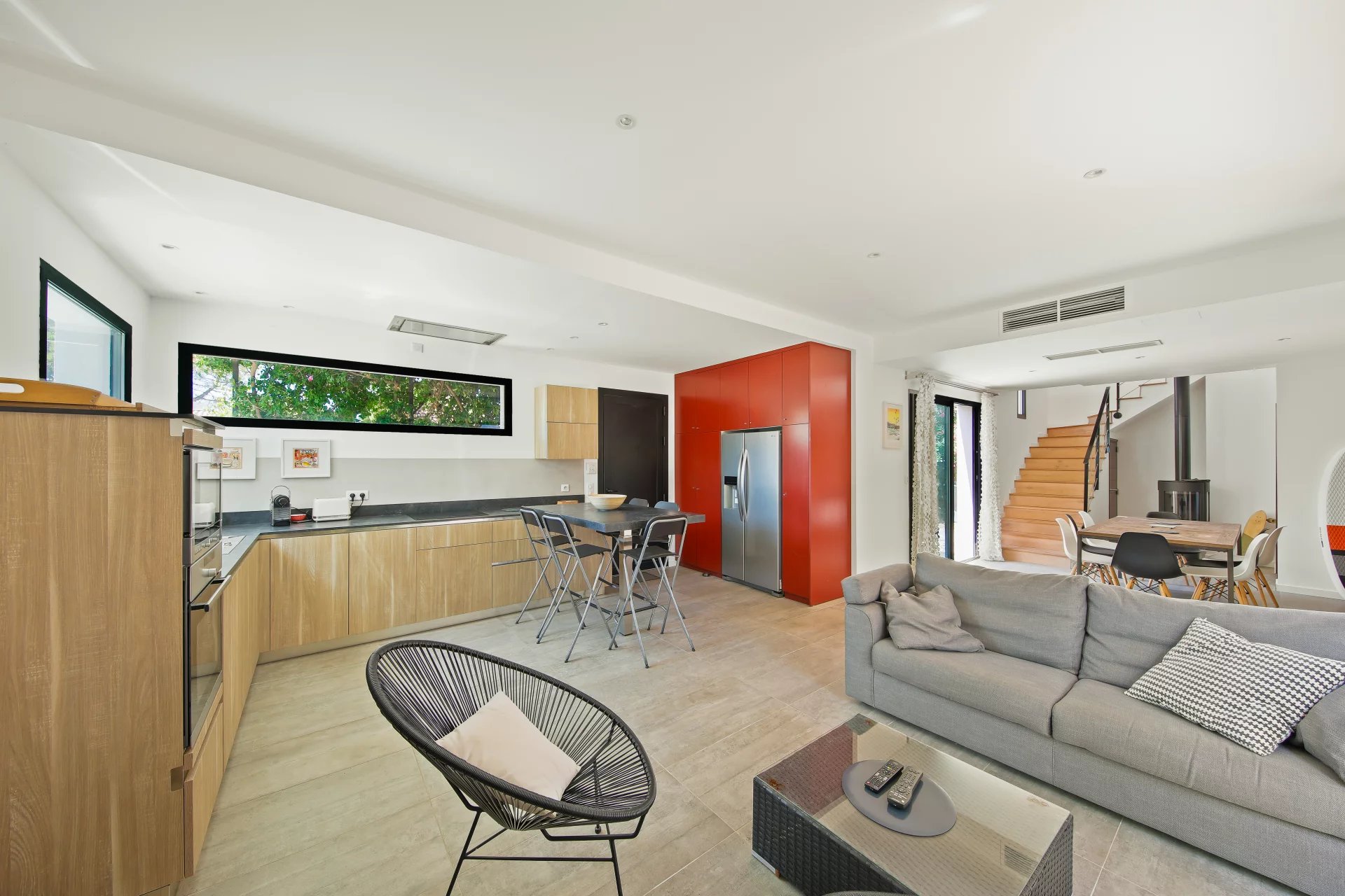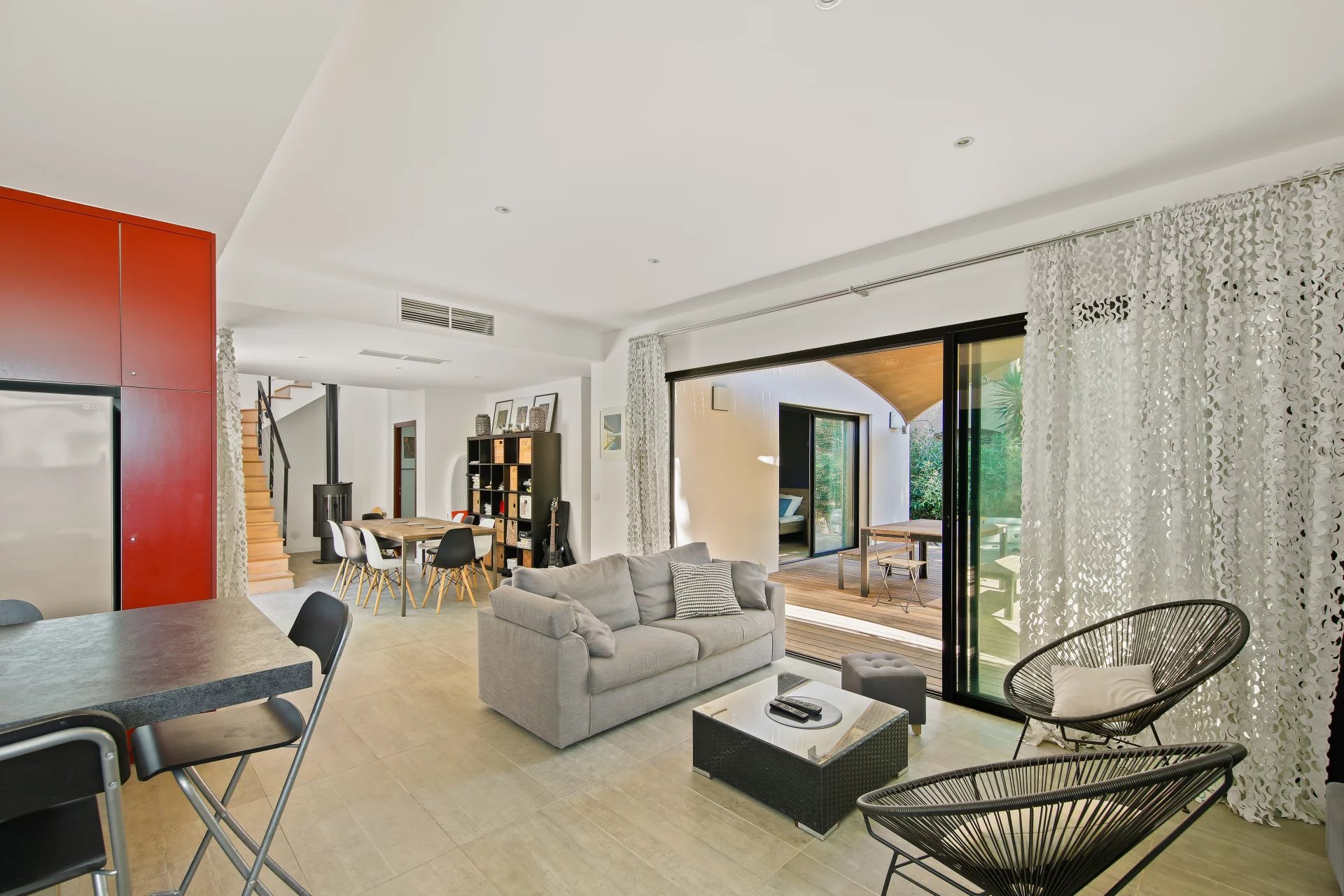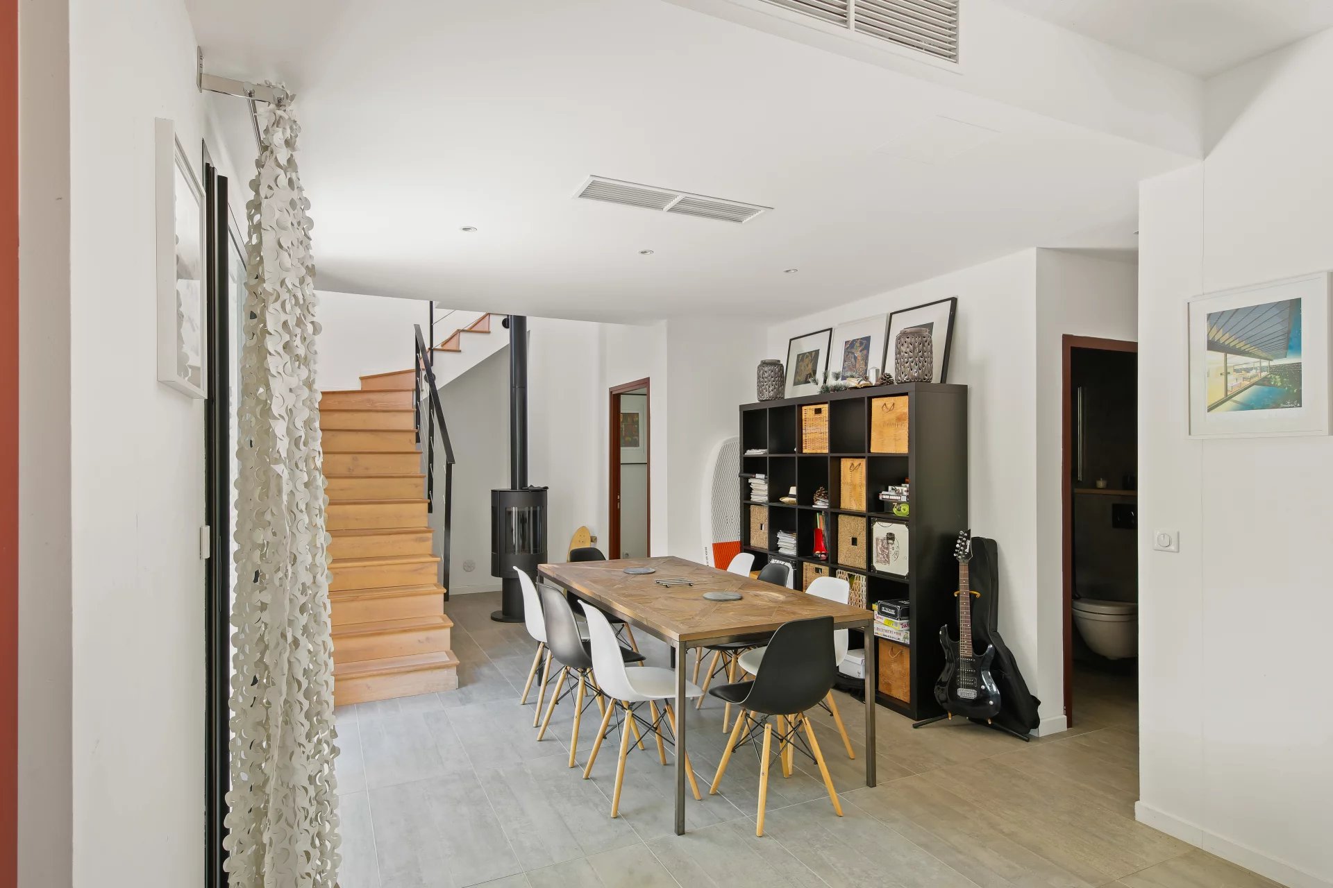 Le RDC se compose du séjour avec poêle à bois salon salle à manger et cuisine, qui s'ouvre sur une belle terrasse bois, deux chambres, deux salles de bains et un wc.