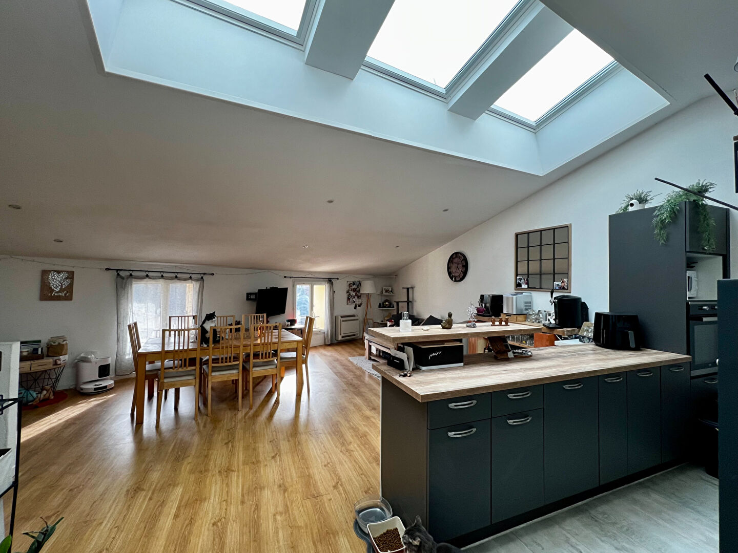 Au coeur de Carcès, spacieux et chaleureux appartement atypique entièrement rénové, au dernier étage. Il dispose d'une très belle pièce de vie très lumineuse, une cuisine aménagée et équipée ouverte sur salon, deux belles chambres dont l'une avec placards, une salle d'eau, toilettes indépendants. Climatisation réversible, fenêtre double vitrage. Remise de 13m² environ stationnement 2 roues possible. Copropriété de 4 lots - dont 4 lots habitation. (Pas de procédure en cours). Charges annuelles : 440 euros.