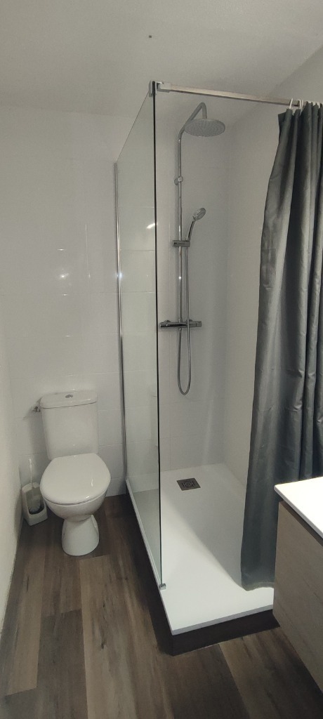 Entrée sur une pièce principale avec coin bureau, une cuisine équipée, une chambre avec vue, salle d’eau (Douche Italienne) avec wc