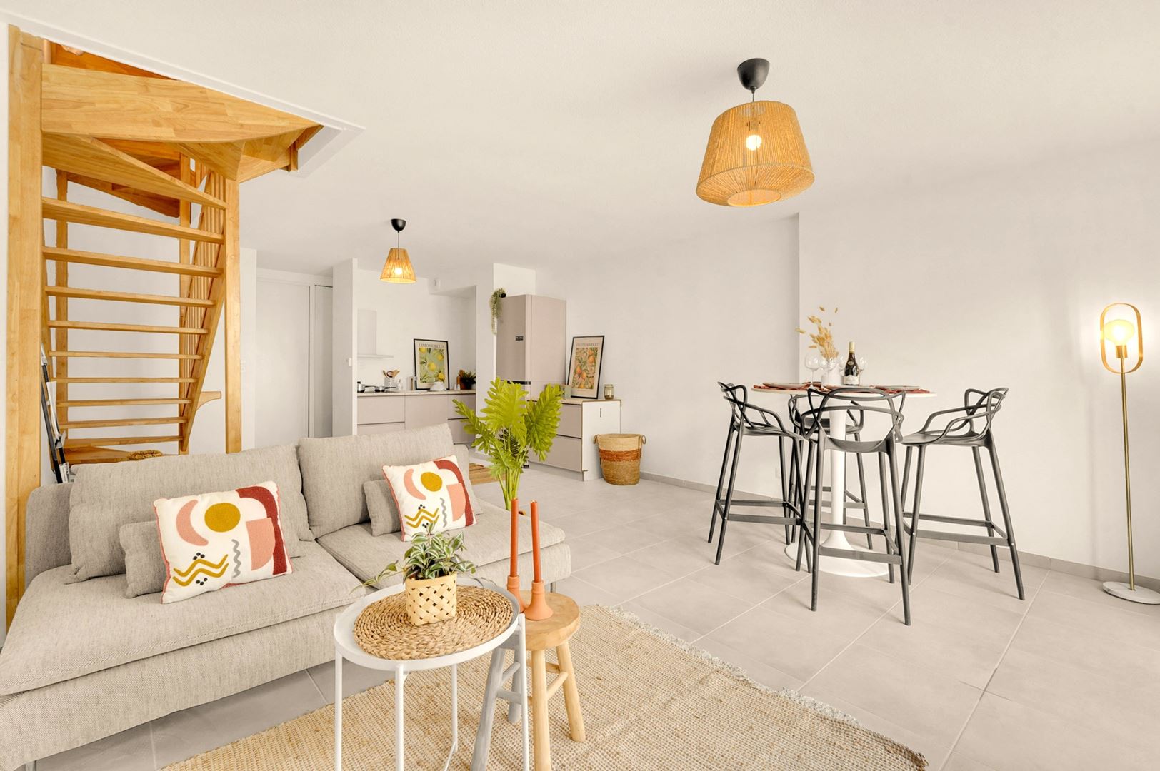 Au rez-de-chaussée, vous découvrirez un vaste espace de vie séjour/cuisine baigné de lumière, ouvert sur une terrasse et un agréable jardin privatif.