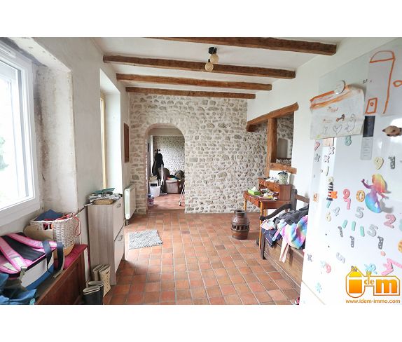 en centre village, une fermette en pierres d'environ 140 m² habitables développée sur 2 niveaux et comprenant :