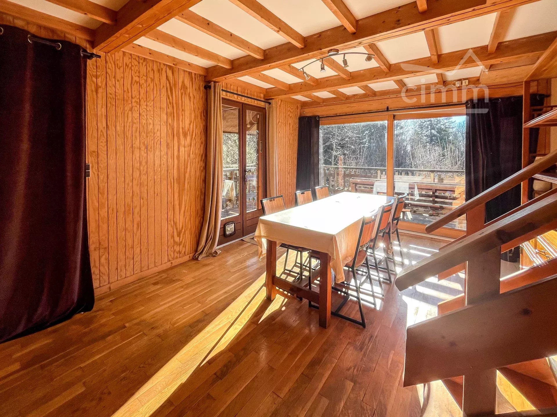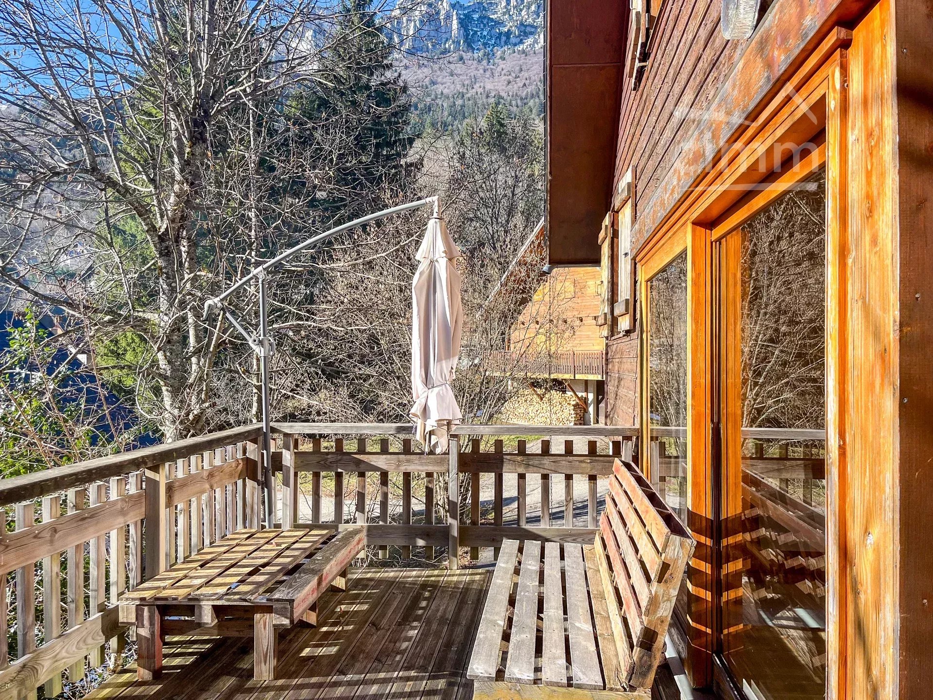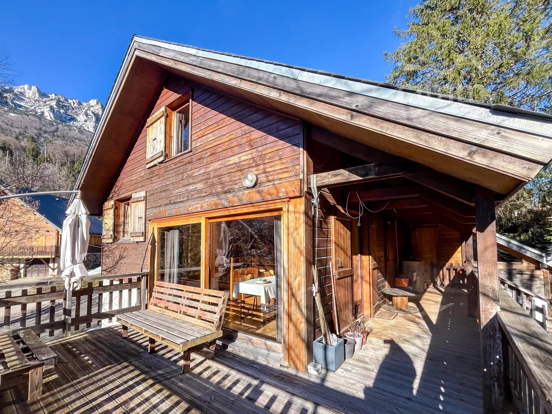 Chalet bois construit en 1980 sur 3 niveaux d'environ 180 m2, une extension a été faite en 2006 - Garage d'environ 42 m2 - places de stationnement - Terrain plat et arboré non clos d'environ 926 m2 - Vue Chartreuse