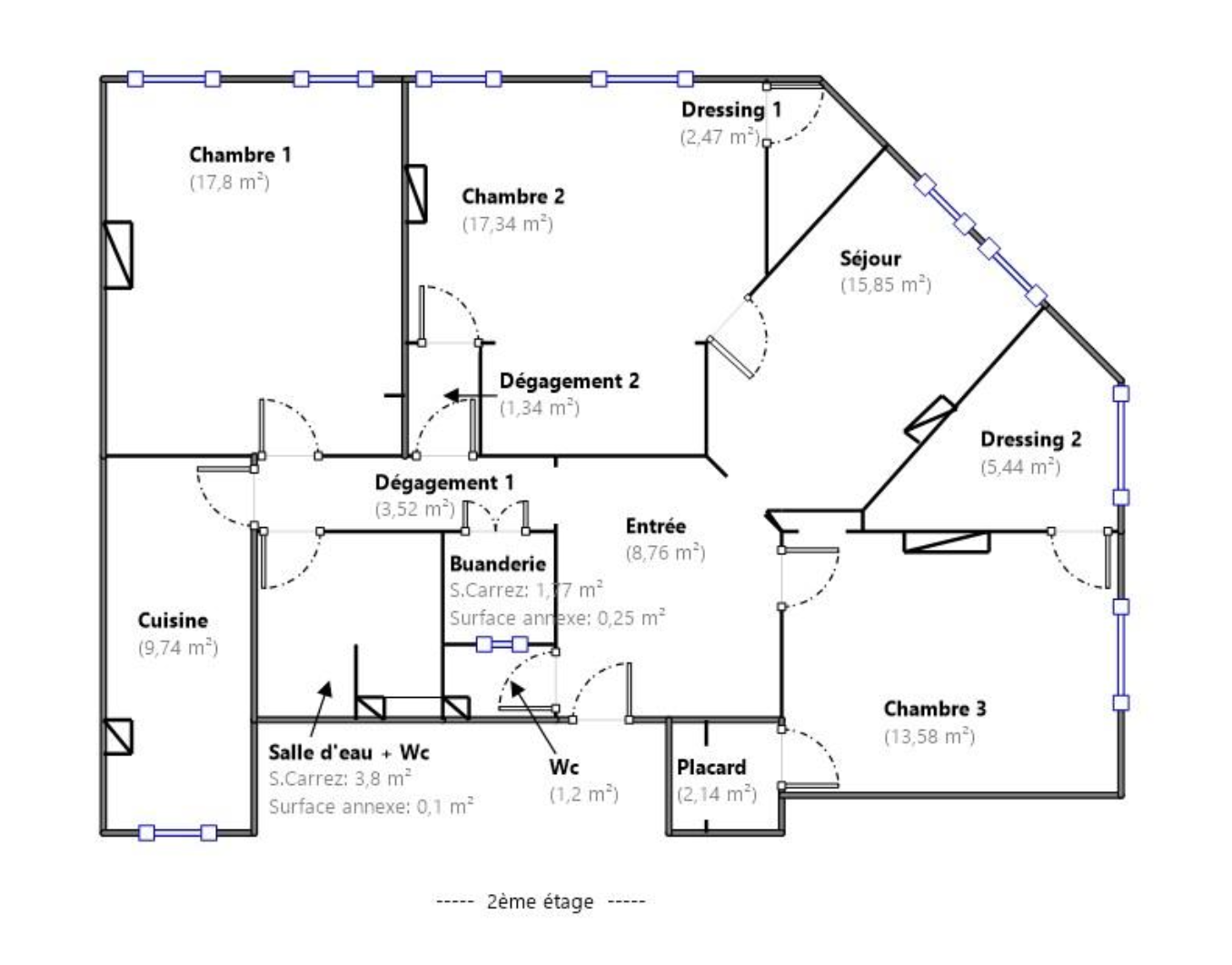 * Trois grandes chambres (18,19 et 21 m²) avec dressings intégrés