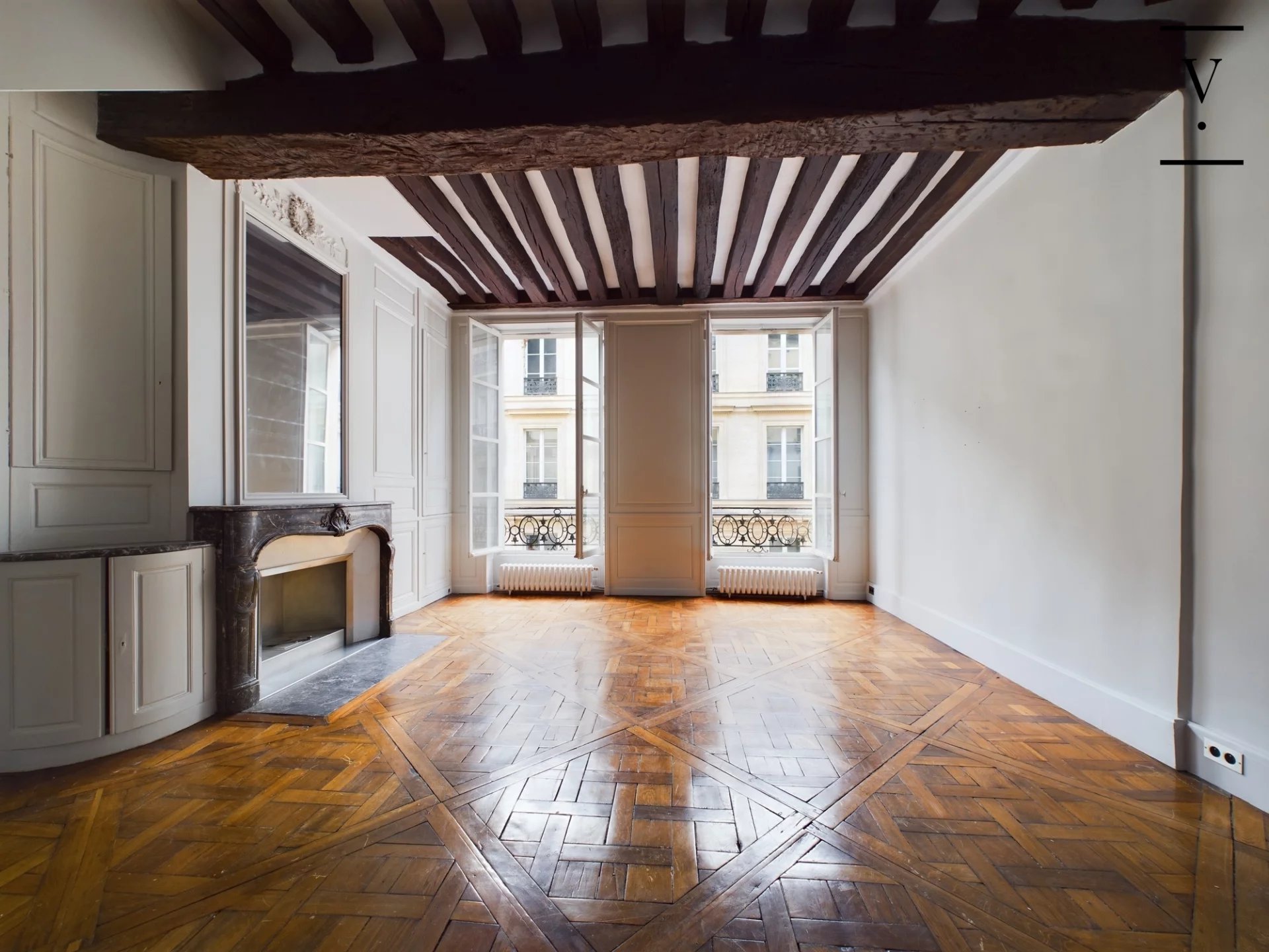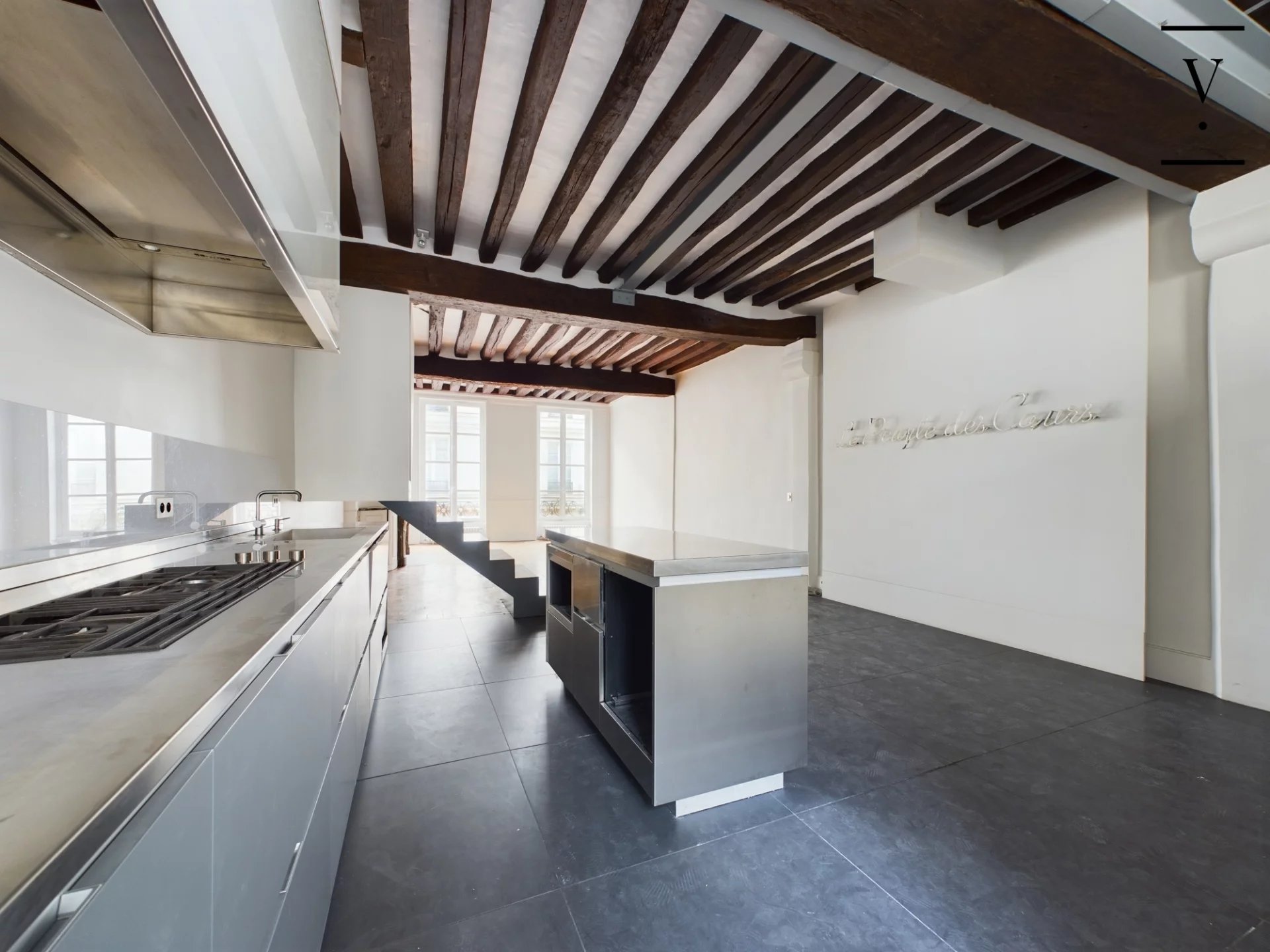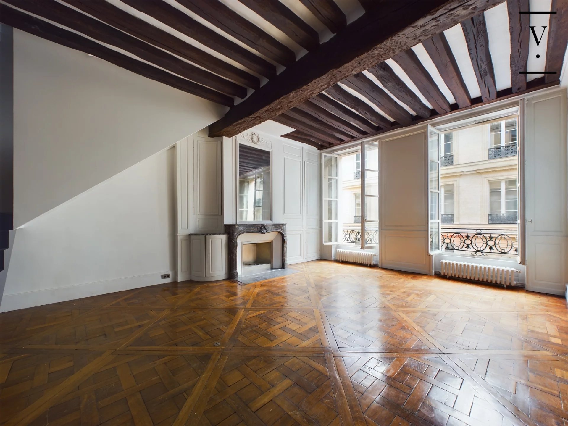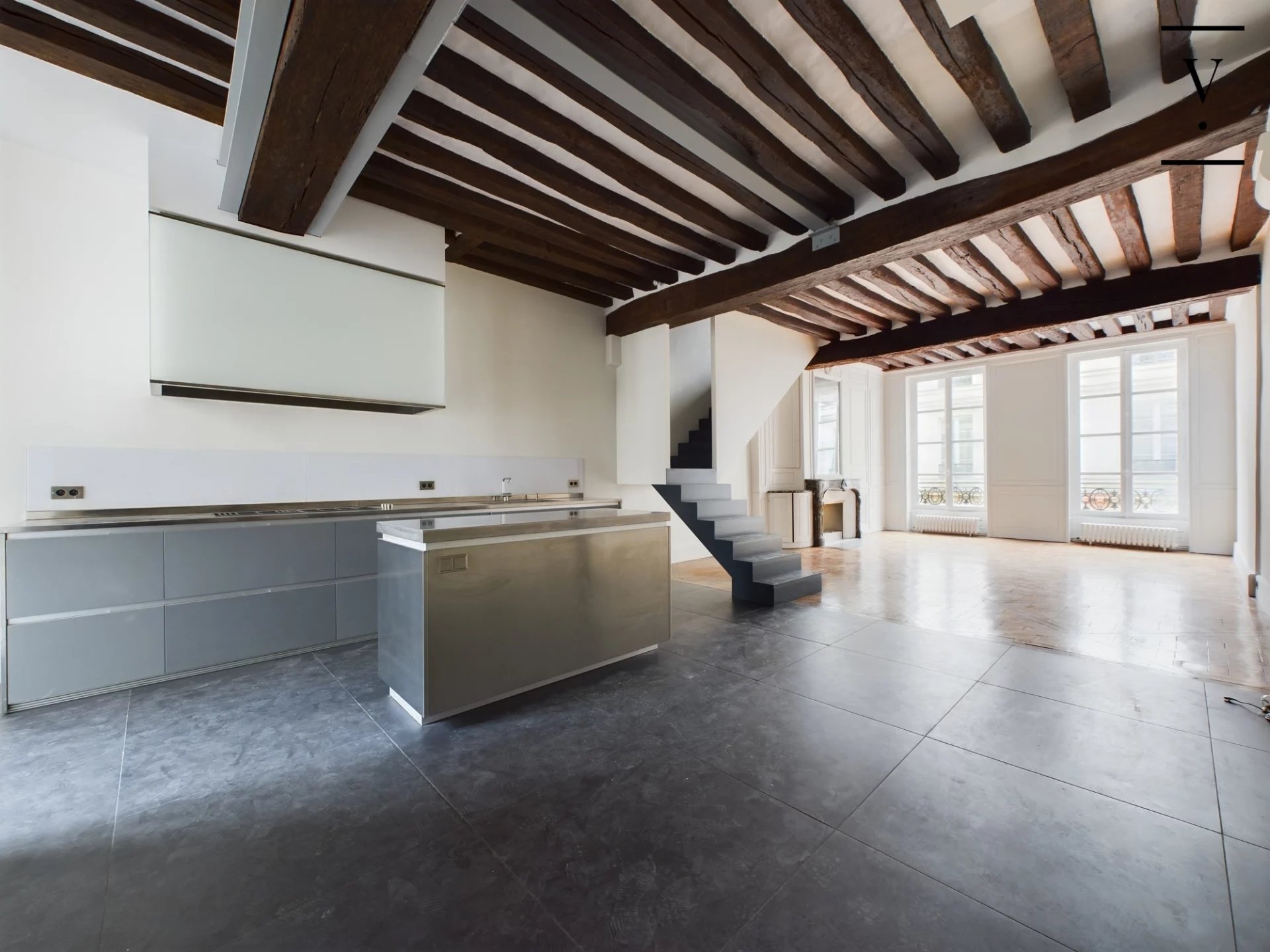 Dans un immeuble datant de 1750, aux 2ème et 3ème étage, un appartement en duplex composé d'une entrée, cuisine ouverte sur belle pièce de vie avec larges fenêtres, toilettes. A l'étage, une grande chambre, salle d'eau, toilettes. Très beaux éléments d'origine : parquet Versailles, cheminée, poutres apparentes, grande hauteur sous plafond. Possibilité d'acquérir un studio mitoyen de 27m² pour faire 2 chambres au prix de 315 000 € FAI.