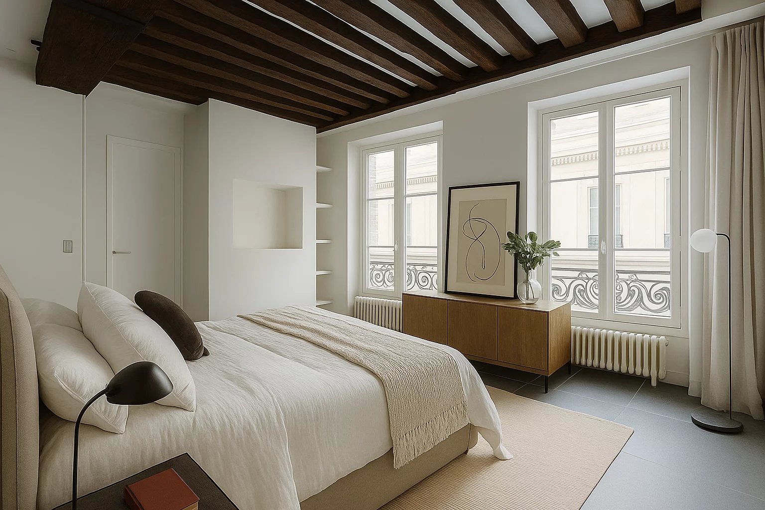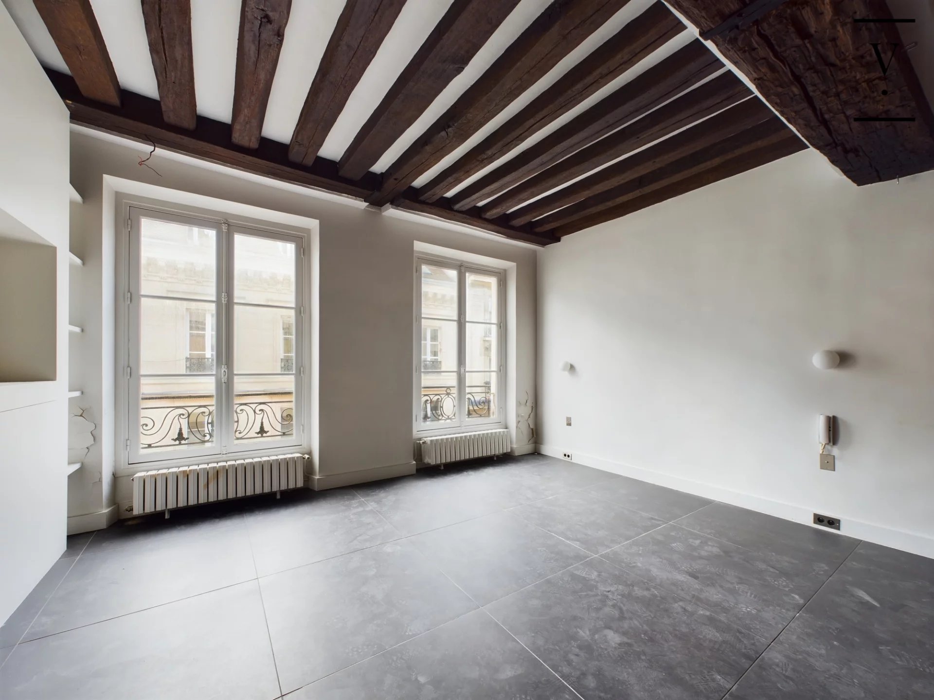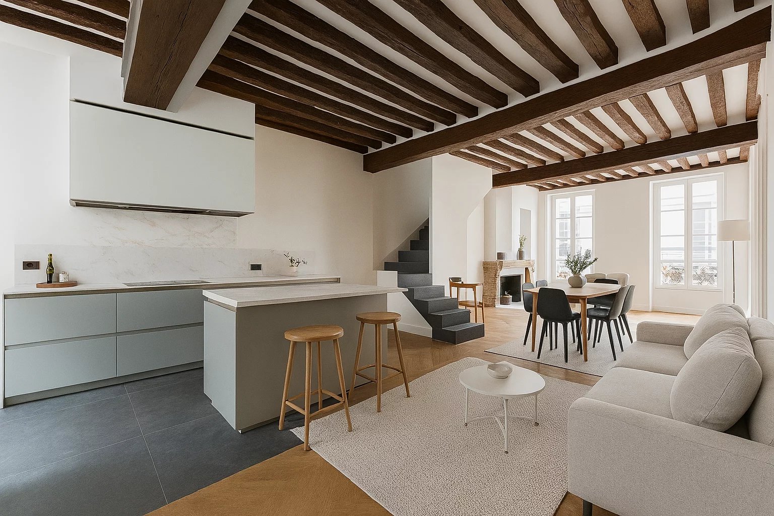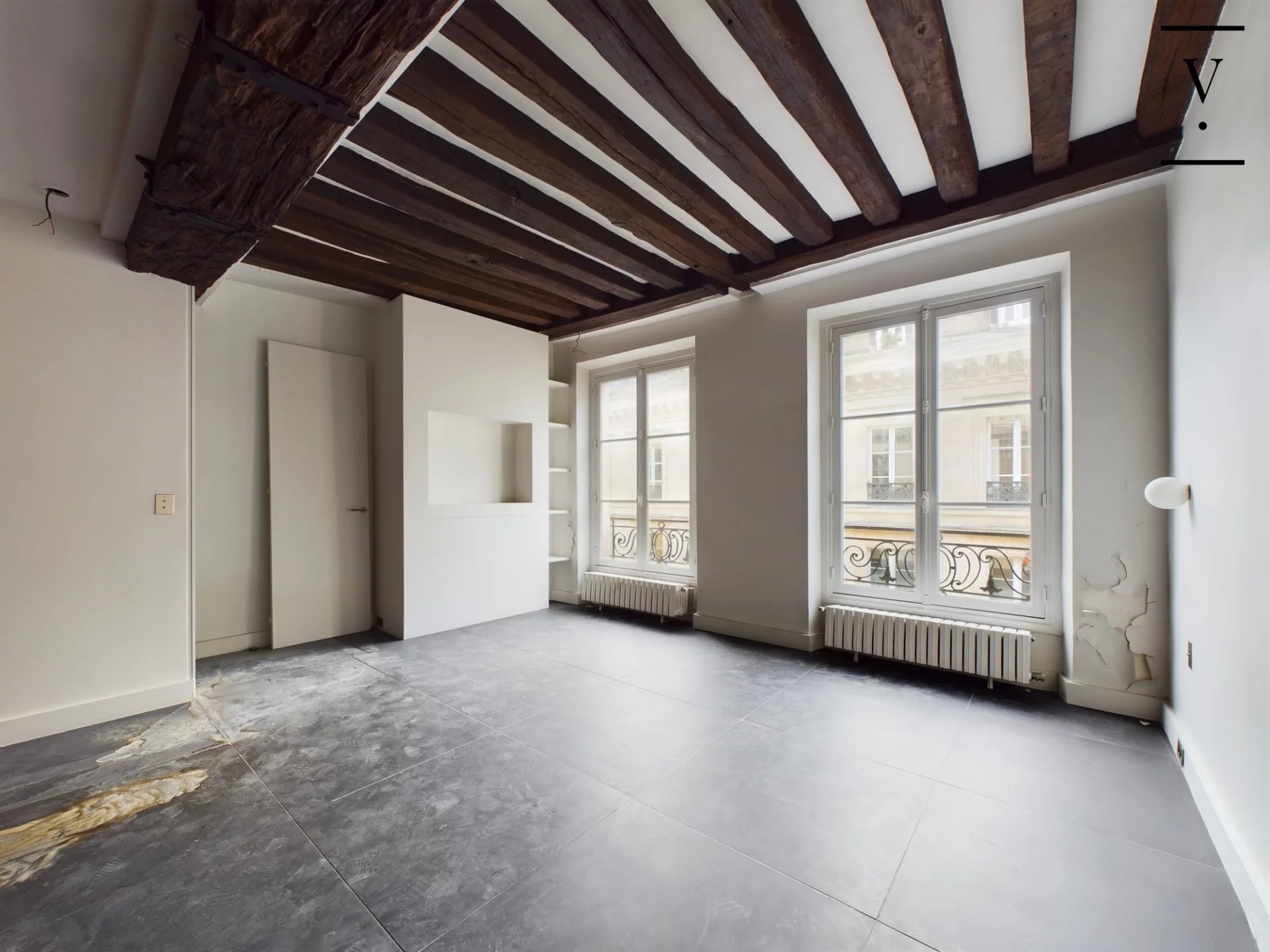 Dans un immeuble datant de 1750, aux 2ème et 3ème étage, un appartement en duplex composé d'une entrée, cuisine ouverte sur belle pièce de vie avec larges fenêtres, toilettes. A l'étage, une grande chambre, salle d'eau, toilettes. Très beaux éléments d'origine : parquet Versailles, cheminée, poutres apparentes, grande hauteur sous plafond. Possibilité d'acquérir un studio mitoyen de 27m² pour faire 2 chambres au prix de 315 000 € FAI.