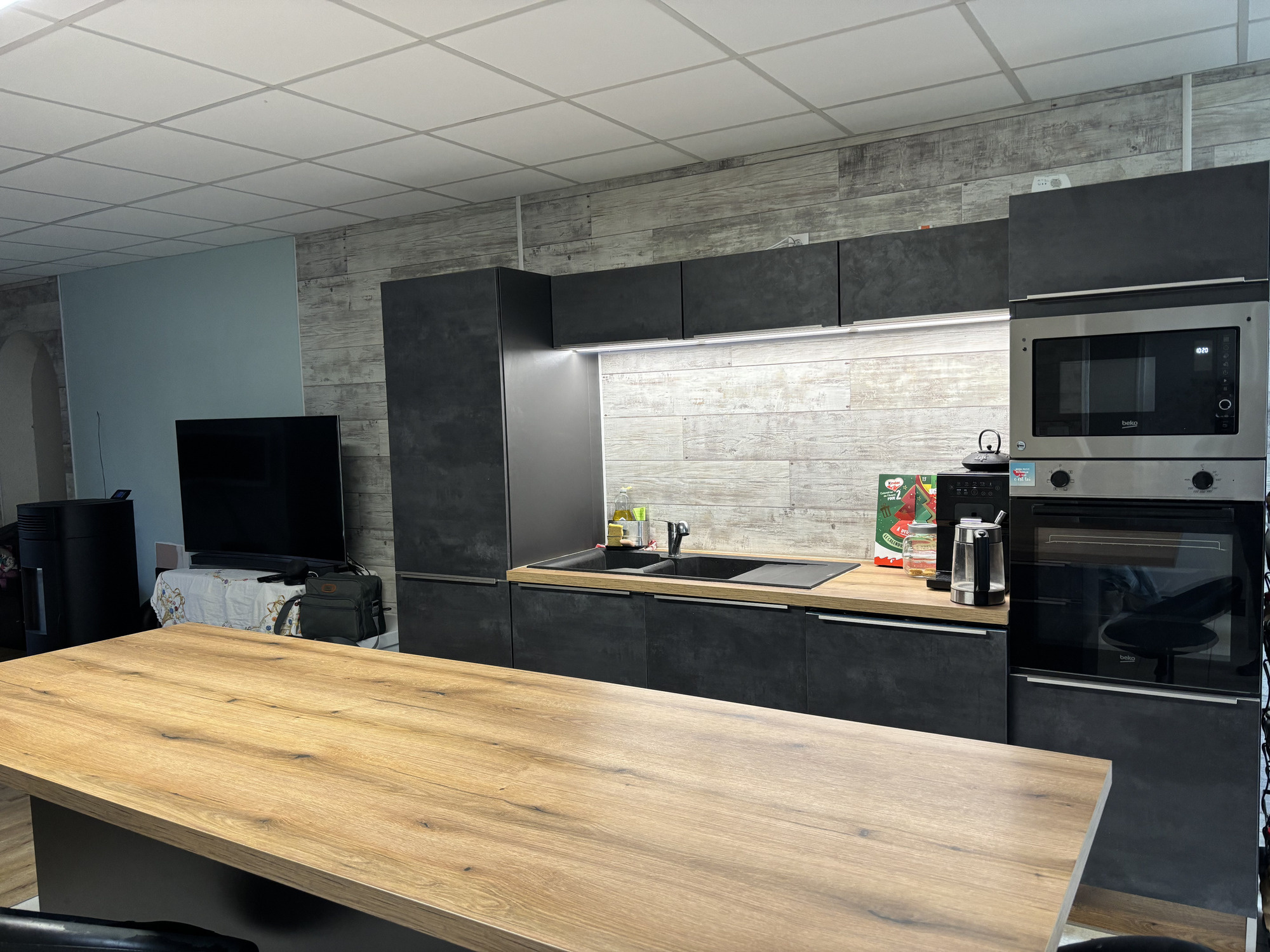 Depuis le salon, une porte donne accès à l'atelier de pâtisserie. Celle-ci se compose d'une pièce centrale équipée de quatre feux à gaz, d'une pièce séparée avec un point d'eau pour la vaisselle et une deuxième chauffe-eau, et se prolonge vers l'ancienne boutique avec une porte donnant sur l'extérieur/le parking privé. On y trouve également des toilettes avec lavabo et un dernier espace de rangement. Cet atelier peut être transformé en chambre d'hôtes.