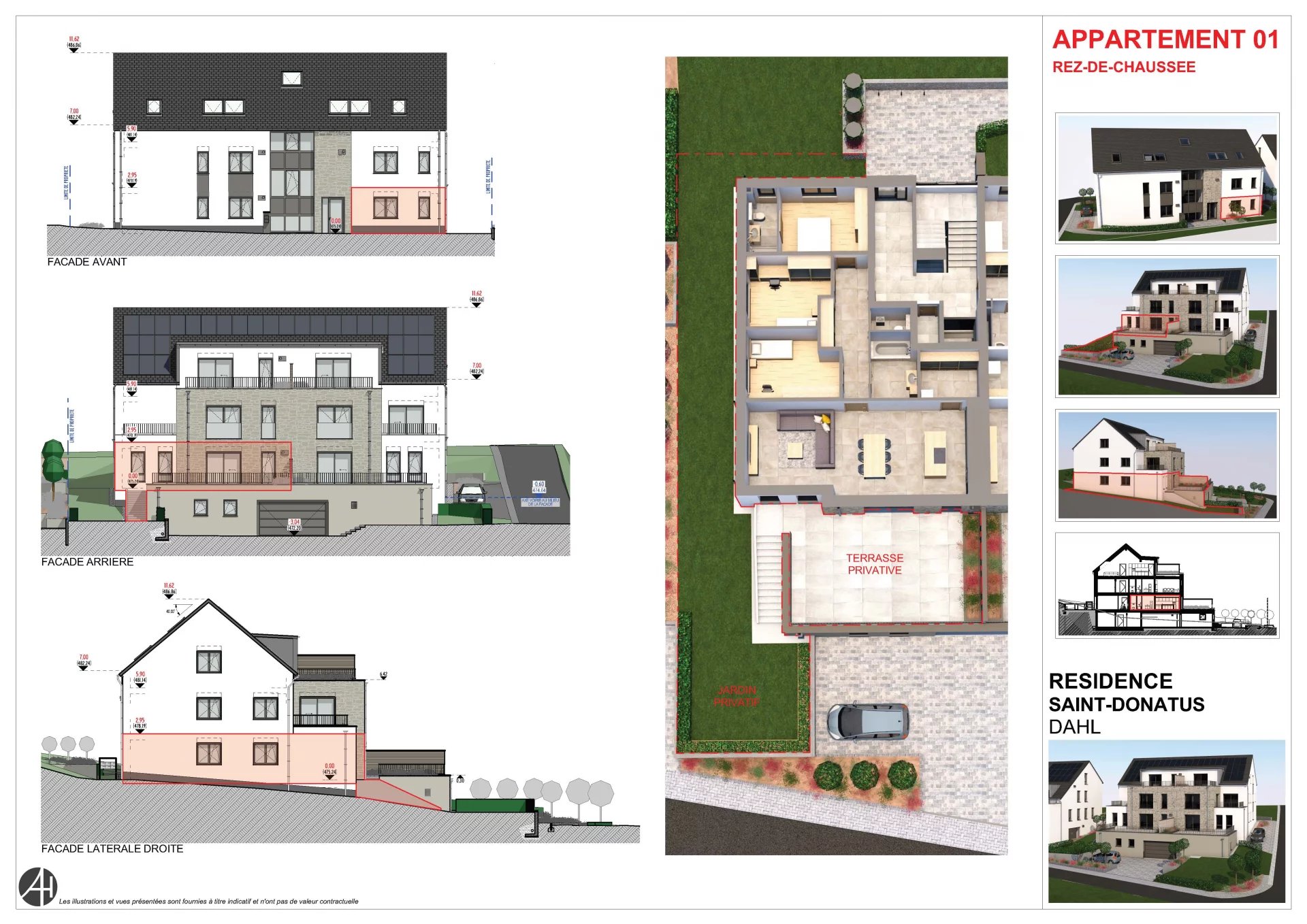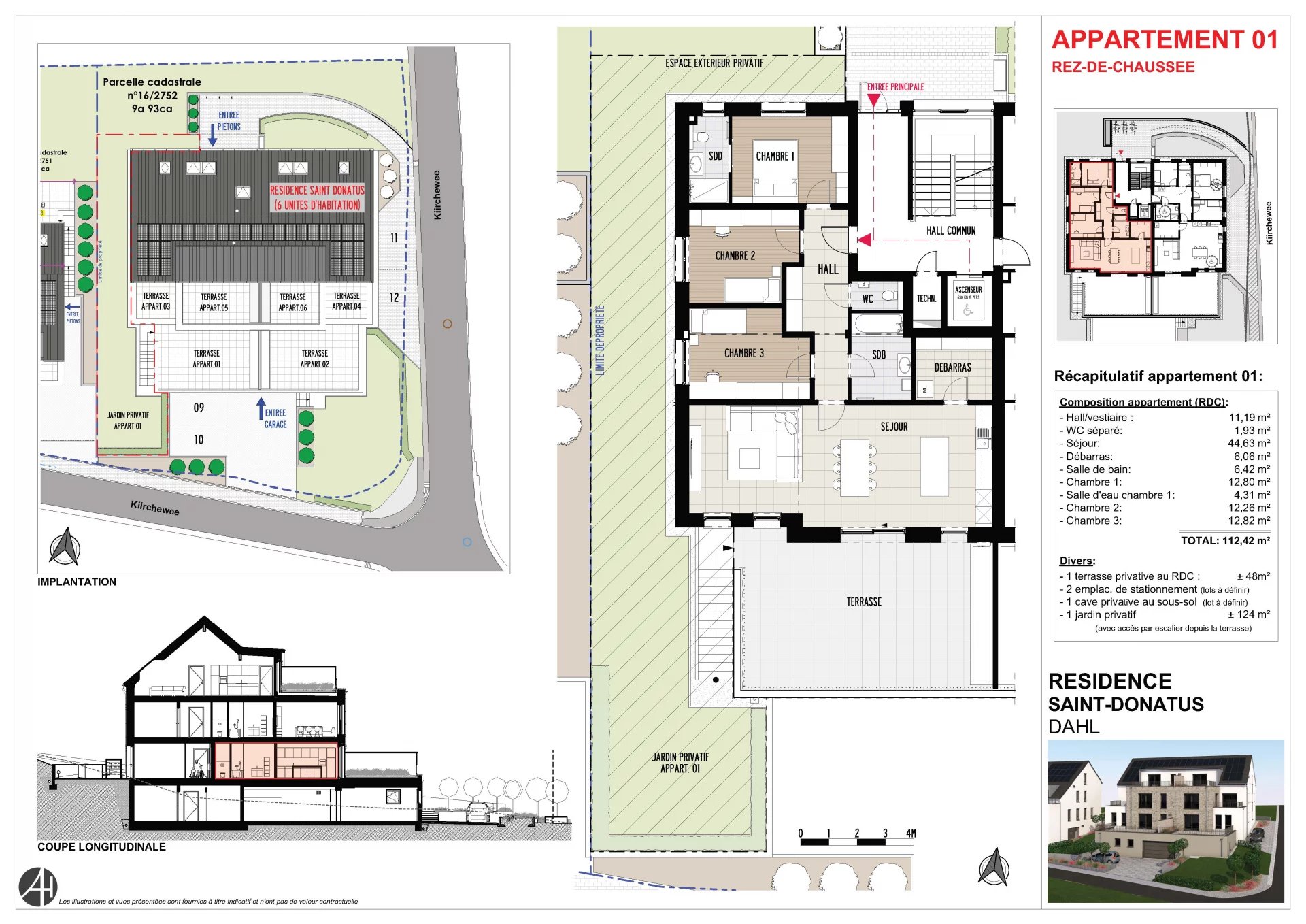 Au cœur du village recherché de Dahl, au sein de la Résidence Saint Donatus, découvrez ce superbe appartement (01) neuf en vente en état futur d’achèvement, situé au rez-de-chaussée d’une résidence contemporaine à taille humaine, pensée pour offrir confort, performance énergétique et qualité de vie durable. Développé sur une surface de 112,42 m², cet appartement séduit par ses volumes généreux et sa distribution parfaitement optimisée. La pièce de vie, spacieuse et lumineuse, accueille un séjour avec cuisine ouverte non incluse dans le prix de vente, offrant un accès direct à une large terrasse de ± 48 m², prolongée par un jardin privatif de ± 124 m², idéal pour profiter pleinement des beaux jours en toute intimité. L’espace nuit se compose de trois chambres, dont une suite parentale avec salle d’eau privative, ainsi qu’une seconde salle de bains indépendante. Un WC séparé, un débarras et des espaces de rangement complètent intelligemment l’ensemble. Les prestations ont été sélectionnées avec exigence – Carrelage dans les pièces de vie – Parquet dans les chambres – Triple vitrage PVC – Chauffage par pompe à chaleur avec diffusion par le sol – Ascenseur – Vidéophone – Cave privative incluse La résidence répond aux standards énergétiques actuels avec une classe de performance énergétique A et une classe d’isolation thermique B, garantissant confort thermique et maîtrise des consommations. Deux emplacements de parking intérieur sont en supplément au prix de 65.000 € et ne sont pas inclus dans le prix de vente. Ce bien s’adresse aussi bien à une famille qu’à des acquéreurs en quête d’un appartement neuf offrant un extérieur exceptionnel, dans un environnement calme et verdoyant, tout en restant à proximité des axes principaux. Les visuels et plans présentés sont fournis à titre indicatif et n’ont pas de valeur contractuelle, conformément au cadre d’une vente en état futur d’achèvement. Pour toute information complémentaire, je reste à votre entière disposition.