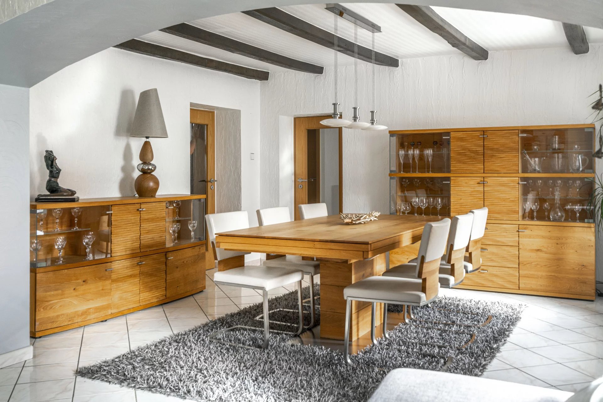 Située dans un quartier calme et résidentiel de Kayl, cette maison mitoyenne de charme développe environ 230 m² habitables sur un terrain de 3,45 ares. Parfaitement entretenue, elle allie élégance, confort et fonctionnalité, offrant un cadre de vie idéal pour une famille en quête d’espace, de bien-être et de sérénité, à seulement quelques minutes d’Esch-sur-Alzette et de Luxembourg-Ville. Dès l’entrée, la maison séduit par ses volumes généreux et son ambiance chaleureuse. Le vaste séjour, baigné de lumière naturelle, associe harmonieusement salon et salle à manger dans un espace ouvert et convivial, sublimé par des poutres apparentes et des finitions en bois massif. La cuisine séparée, entièrement équipée, reflète un style authentique et raffiné avec ses éléments en chêne, son bar en briques et ses plans de travail en granit, créant un lieu à la fois accueillant et pratique. Le rez-de-chaussée comprend également une salle de bains, parfaitement pensée pour le quotidien et particulièrement pratique pour ceux qui profitent de la piscine. À l’étage, un grand hall dessert trois chambres confortables, ainsi qu’une salle de bains rénovée, aux matériaux contemporains et au design sobre et élégant. L’étage supérieur, entièrement aménagé en suite parentale, occupe toute la mezzanine et offre un véritable espace de détente et d’intimité. Une préinstallation technique permet d’y créer une troisième salle de bains, transformant cet étage en une suite haut de gamme complète. À l’extérieur, la maison dévoile un espace de vie en plein air remarquable. La grande terrasse pavée, idéalement exposée, accueille un coin repas, un jacuzzi et une piscine hors-sol, dans un environnement intime et facile d’entretien. Un garage fermé pour une voiture ainsi que plusieurs emplacements extérieurs pouvant accueillir jusqu’à quatre véhicules complètent cet ensemble. Sur le plan technique, la maison dispose d’un chauffage au gaz (chaudière 2011) avec diffusion par radiateurs, de châssis PVC et bois à double vitrage, et de revêtements de sol en carrelage et parquet. L’installation d’une chaise monte-escalier assure un accès aisé à tous les niveaux, rendant le bien adapté à tous les profils d’occupants. Idéalement implantée, la propriété bénéficie d’une localisation recherchée, à proximité immédiate des commerces, écoles, transports publics et axes autoroutiers. Kayl combine harmonieusement la douceur d’un cadre résidentiel et la praticité d’une commune dynamique au cœur du sud du Luxembourg. Alliant caractère, volumes, prestations et espaces extérieurs d’exception, cette maison représente une opportunité rare sur le marché local, idéale pour ceux qui recherchent un bien familial clé en main, synonyme de qualité, confort et art de vivre.