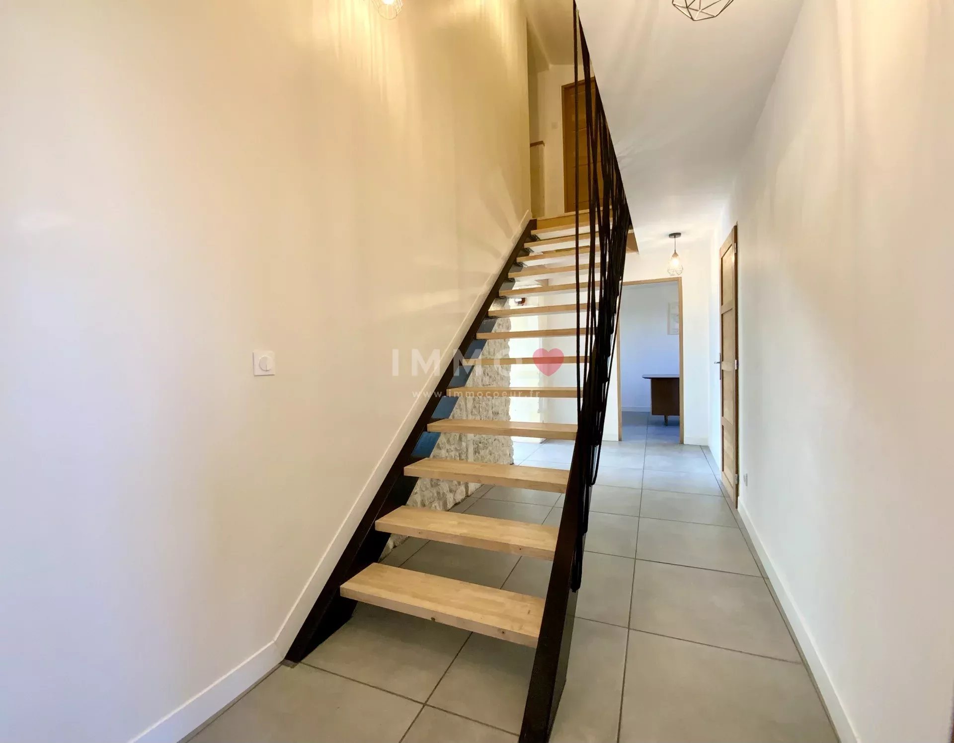 La pièce de vie principale s’ouvre sur une cuisine aménagée et équipée, conviviale et contemporaine. La grande baie vitrée à galandage efface la frontière entre intérieur et extérieur, donnant accès de plain-pied à une terrasse en bois exposée plein sud — un espace idéal pour profiter de la quiétude des lieux et de la vue sur les vignes.