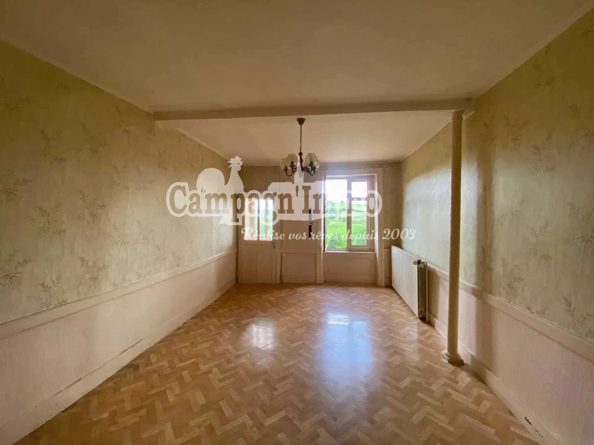 Un sous-sol complet et un jardin avec remise adossée s'ouvrent sur la campagne environnante.