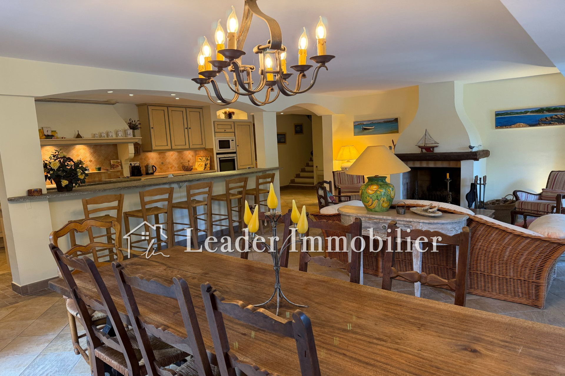 La villa offre un vaste séjour lumineux de 47 m² avec cheminée, une cuisine entièrement équipée, ainsi que quatre suites parentales, alliant confort et intimité.