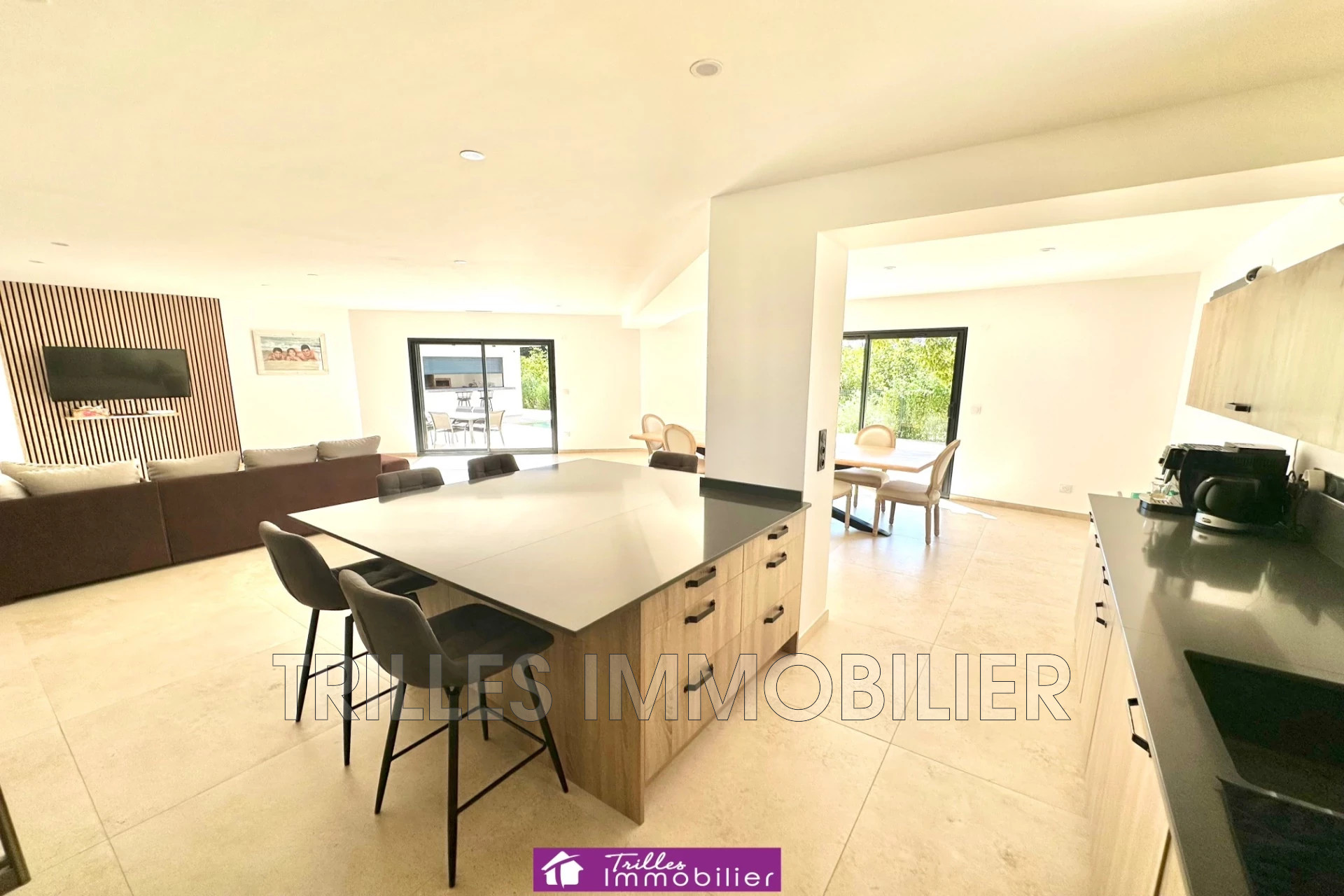 Cette magnifique pièce dotée de très grandes baies vitrées vous donnera une splendide vue sur la nature et la piscine.