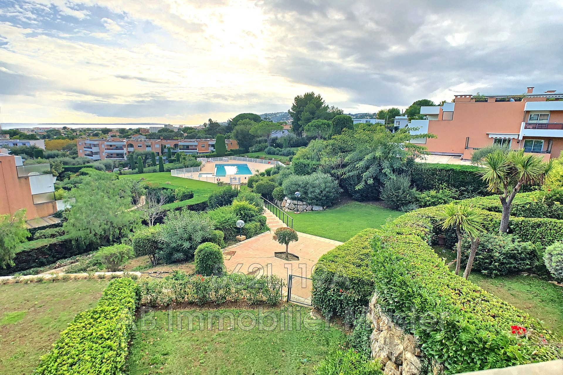 Dans une résidence recherchée d'Antibes avec parc, piscine et tennis, appartement 2 pièces meublé situé au dernier étage, au calme, avec vue mer et Îles de Lérins.