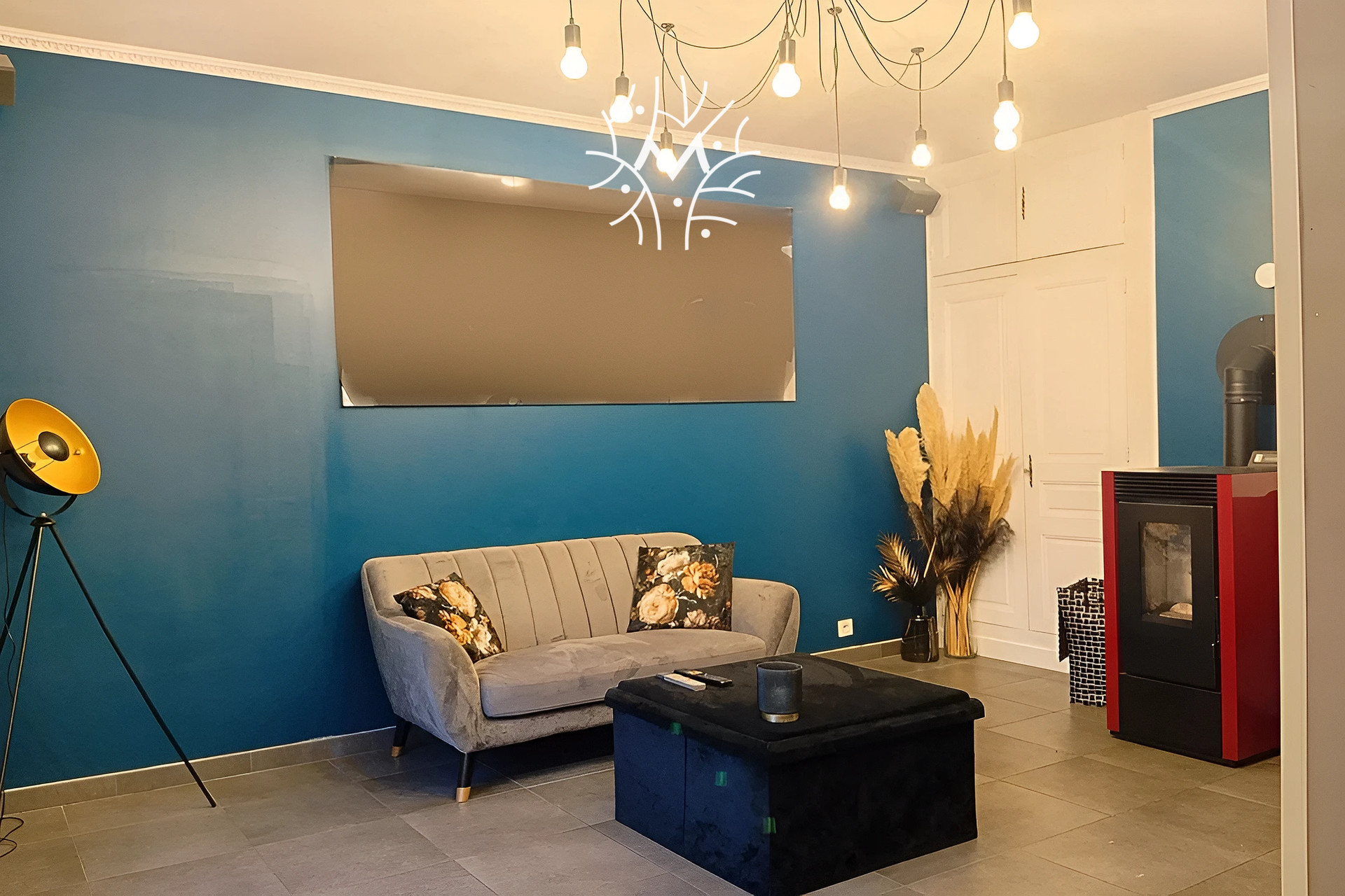 Cette maison totalement rénovée se compose d'une entrée, un salon cosy équipé d'un poêle à granulés, une cuisine entièrement équipée, spacieuse et dinatoire, avec accès direct à une petite cour privative et un wc.