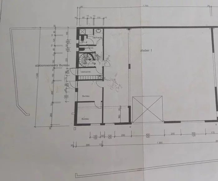- Au rez de chaussée un atelier avec accès véhicule avec une grande hauteur + 2 bureaux + 2 sanitaires + un espace de stockage pour une surface d'environ 180 m2.