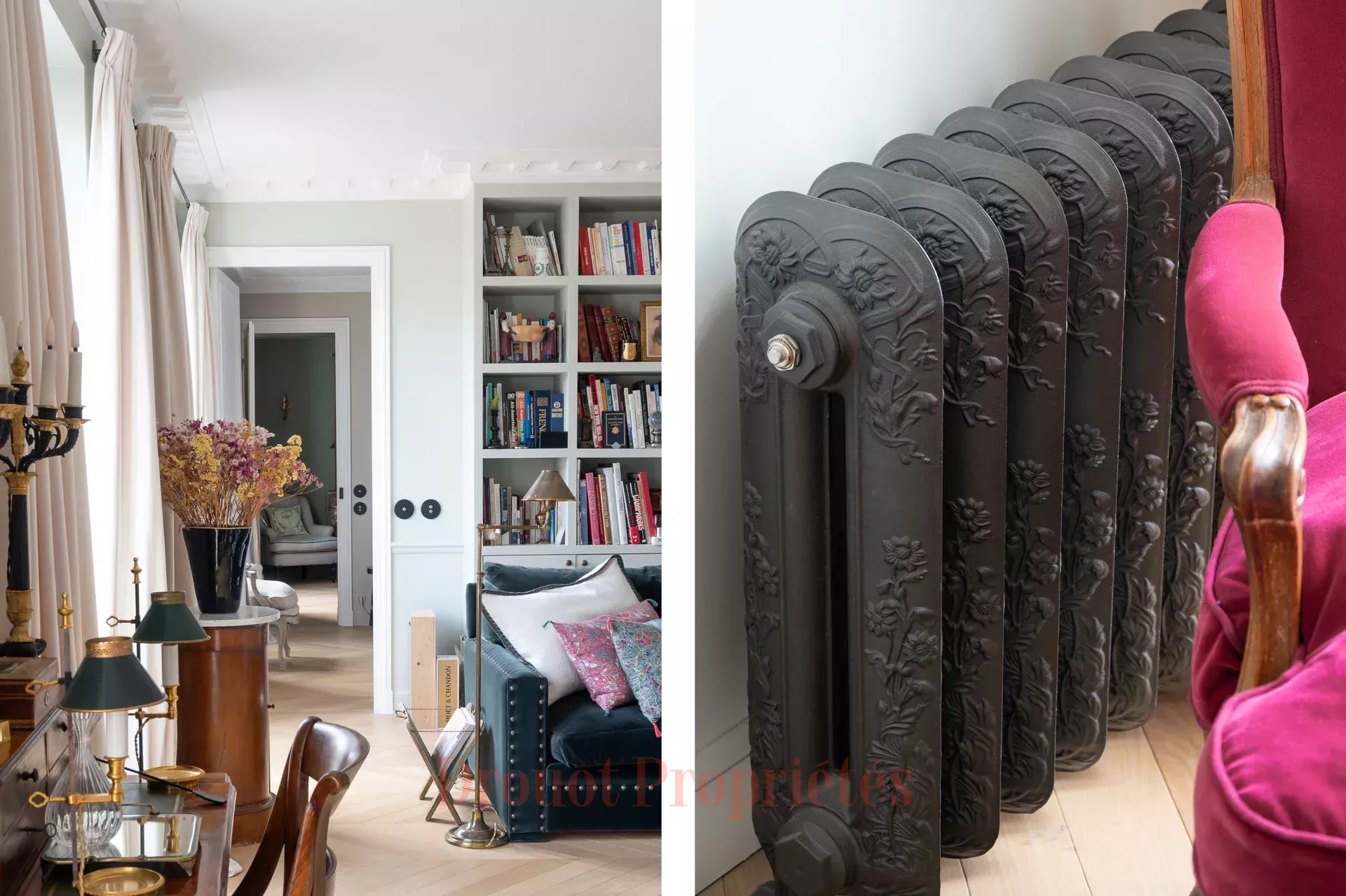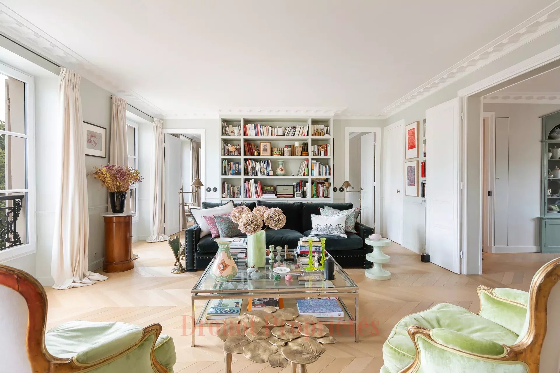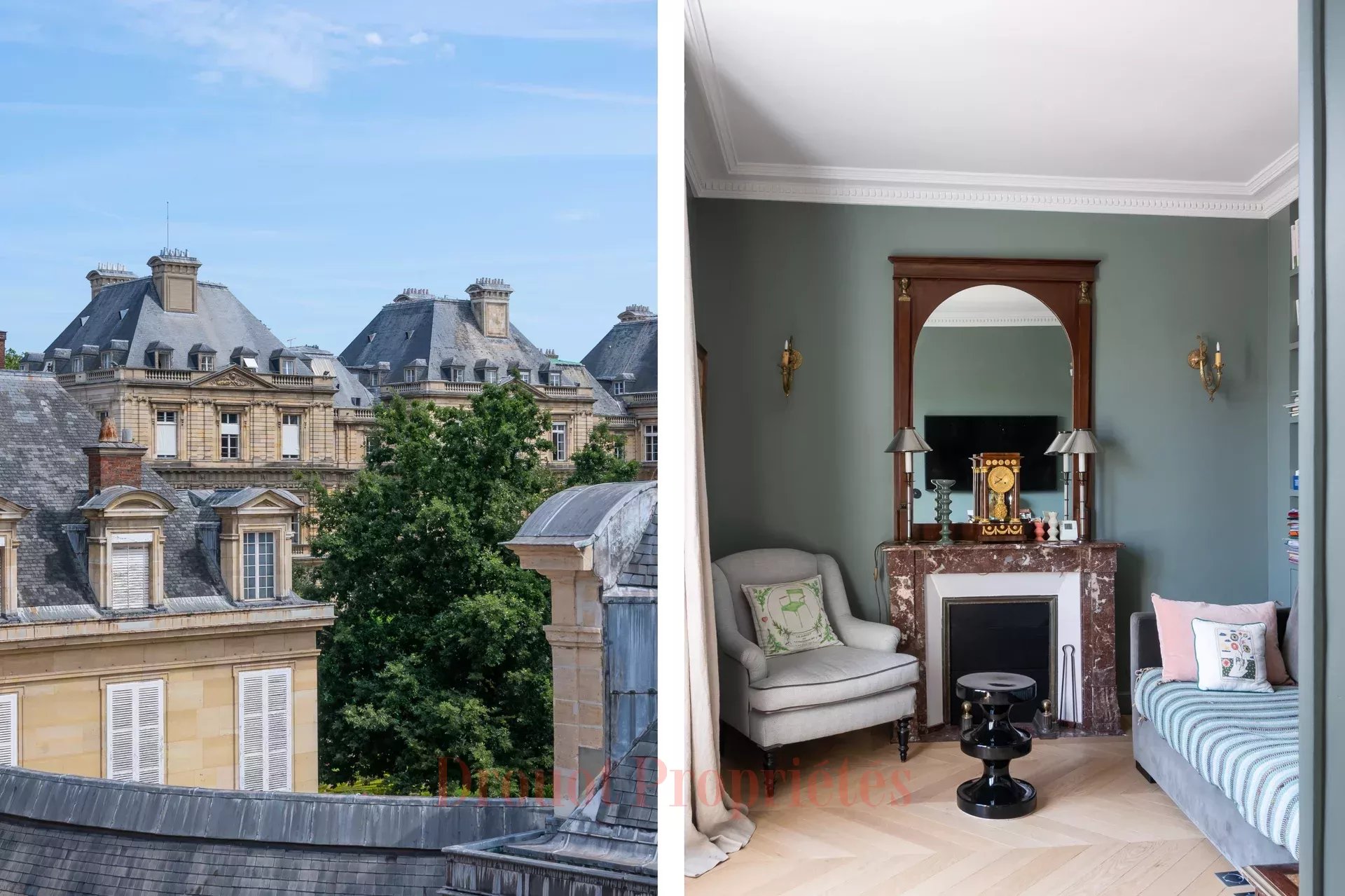 APPARTEMENT TRAVERSANT - ETAGE ELEVÉ - VUE DEGAGÉE SUR LE PALAIS DU LUXEMBOURG - 2 CHAMBRES Idéalement situé entre la place de l'Odéon et le jardin du Luxembourg, superbe appartement au 4ème étage avec ascenseur d'un élégant immeuble Directoire. Ce bien traversant bénéficie d'une vue ciel et domine les toits du Petit Luxembourg. Il se compose d'un grand salon orienté au sud, d'un petit salon, d'une salle à manger, d'une cuisine idépendante meublée et équipée contiguë, de deux chambres dont une sur cour, chacune disposant de sa salle de bains avec toilettes. Prestations exceptionnelles, nombreux rangements, adresse rare et recherchée. Une grande cave complète ce bien.