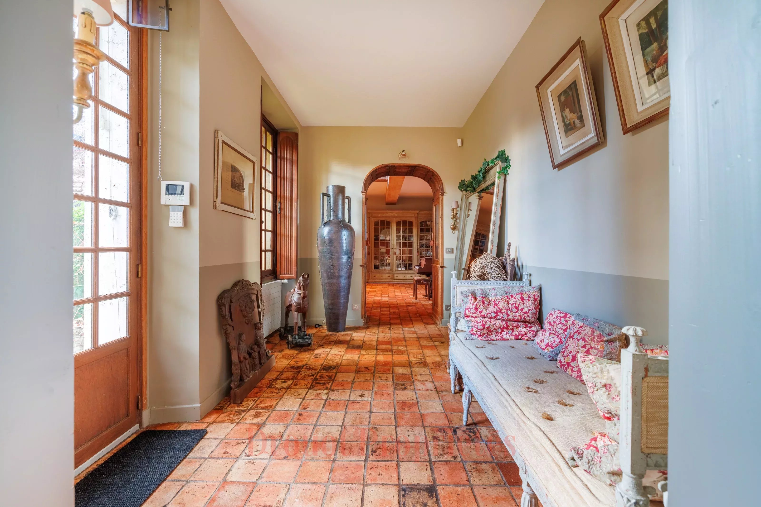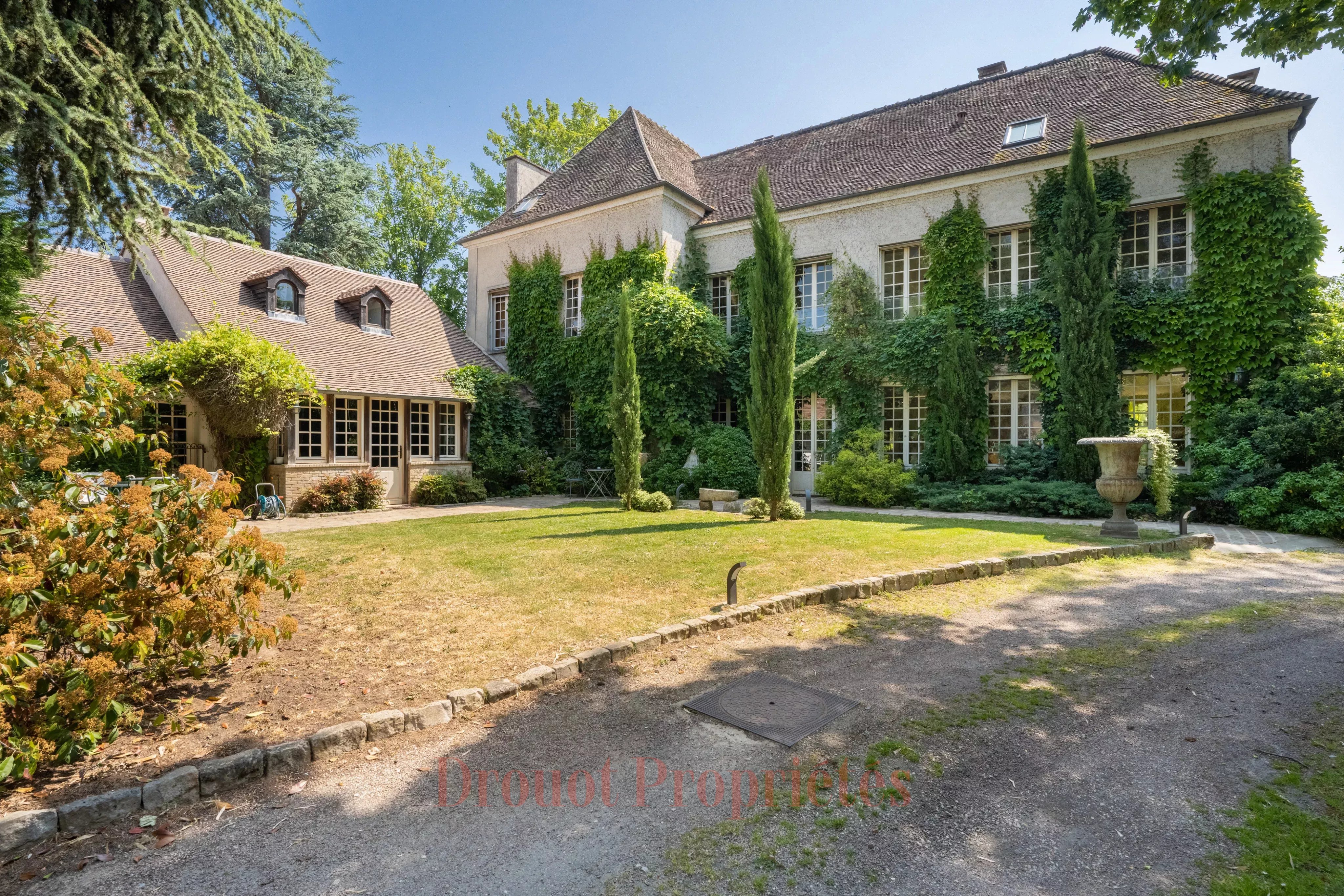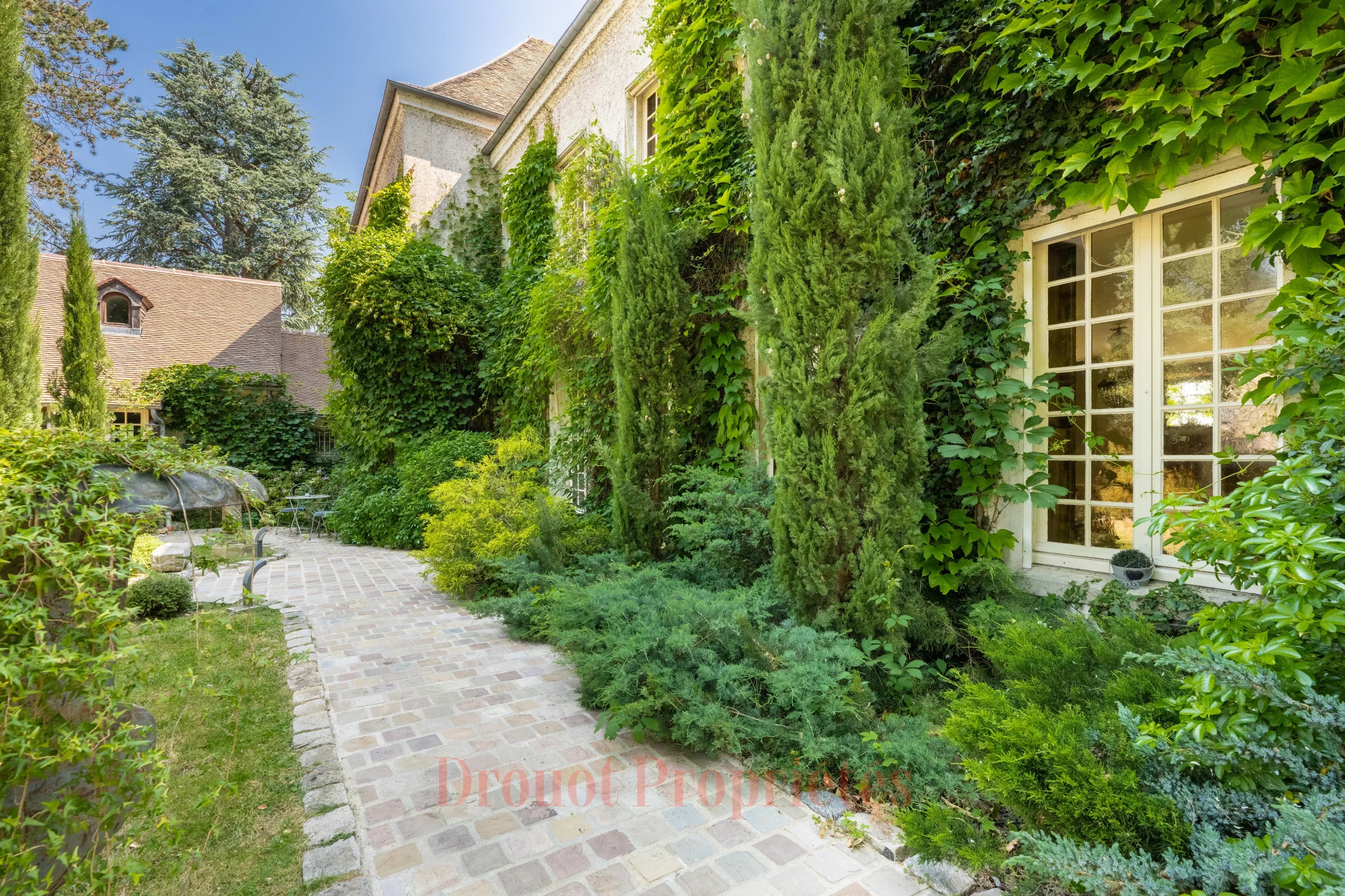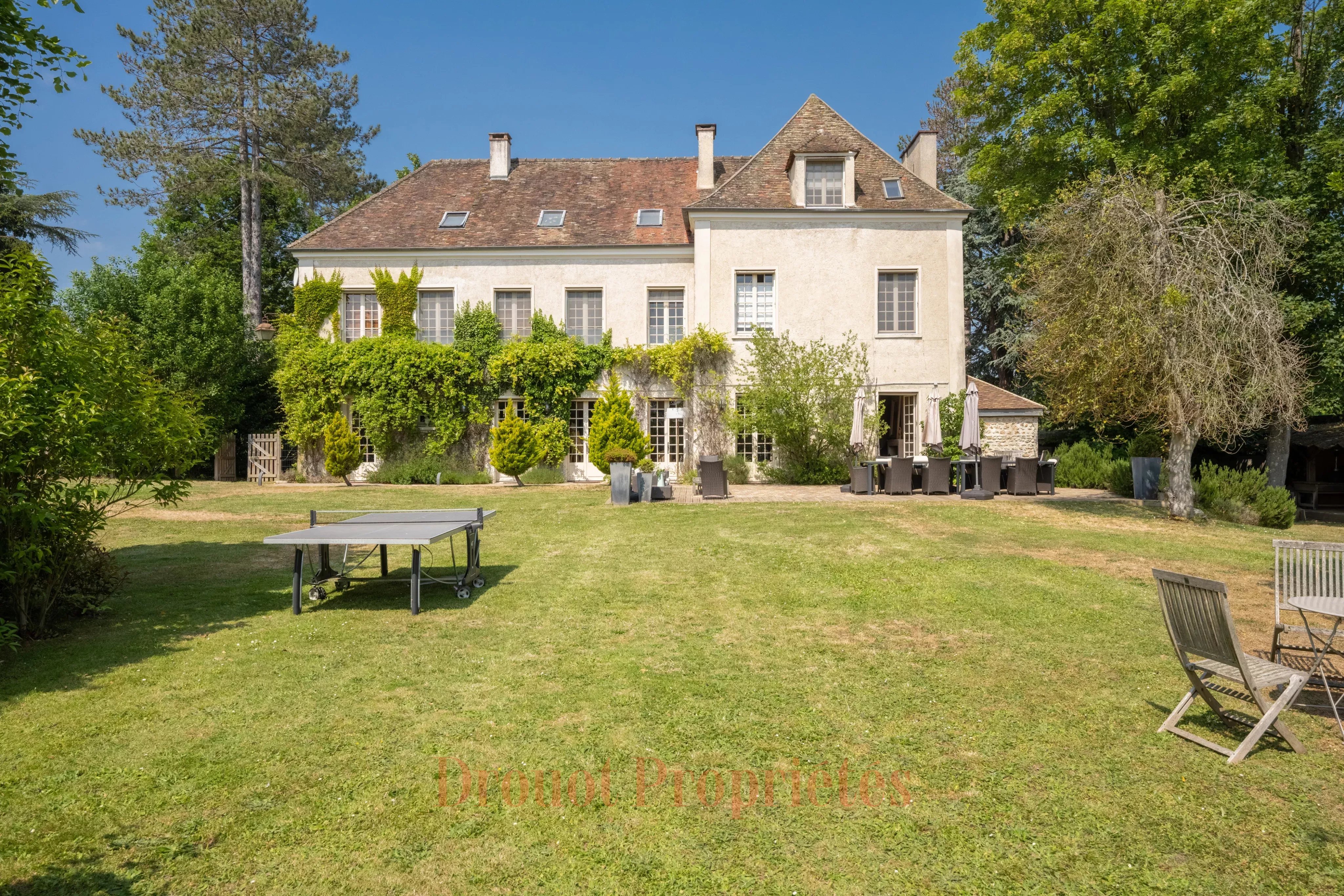 DEMEURE DE CARACTERE - JARDIN - PISCINE - 10 CHAMBRES A quelques pas du centre de Monfort L'Amaury et des écoles, d'une surface d'environ 600 m² sur un terrain de 2800 m², superbe Prieuré entièrement repensé et rénové avec soin. Cette bâtisse au charme intemporel et à la décoration raffinée propose de magnifiques prestations. Au rez-de-chaussée du corps principal se trouve un vaste salon de 60 m² avec cheminée, une élégante salle à manger de 47 m² et un bureau. Toutes les pièces ouvrent par de hautes portes-fenêtres donnant sur une grande terrasse et un jardin arboré. Le premier étage (du corps principal) comprend une belle suite parentale avec une salle de bains, un dressing et salle d'eau attenante, ainsi que quatre chambres disposant chacune leur propre salle de bains. Le deuxième étage dessert trois chambres, deux salles de bains et une très grande salle de jeu pouvant faire office de dortoir. L'aile se trouvant à gauche du corps principal abrite au rez-de-chaussée une magnifique cuisine dînatoire pouvant accueillir de grandes tablées familiales. Une chambre avec salle de bains et à l'étage une seconde chambre avec salle de bains ainsi qu'une buanderie. L'aile se prolonge par un corps de bâtiment à usage professionnel avec accès direct sur la rue. Il se compose d'une salle d'attente, d'un cabinet et d'un sauna. Dans le jardin entièrement paysagé se trouve une très belle piscine chauffée récemment construite et agrémentée d'un pool house équipé d'une cuisine d'été et de toilettes.