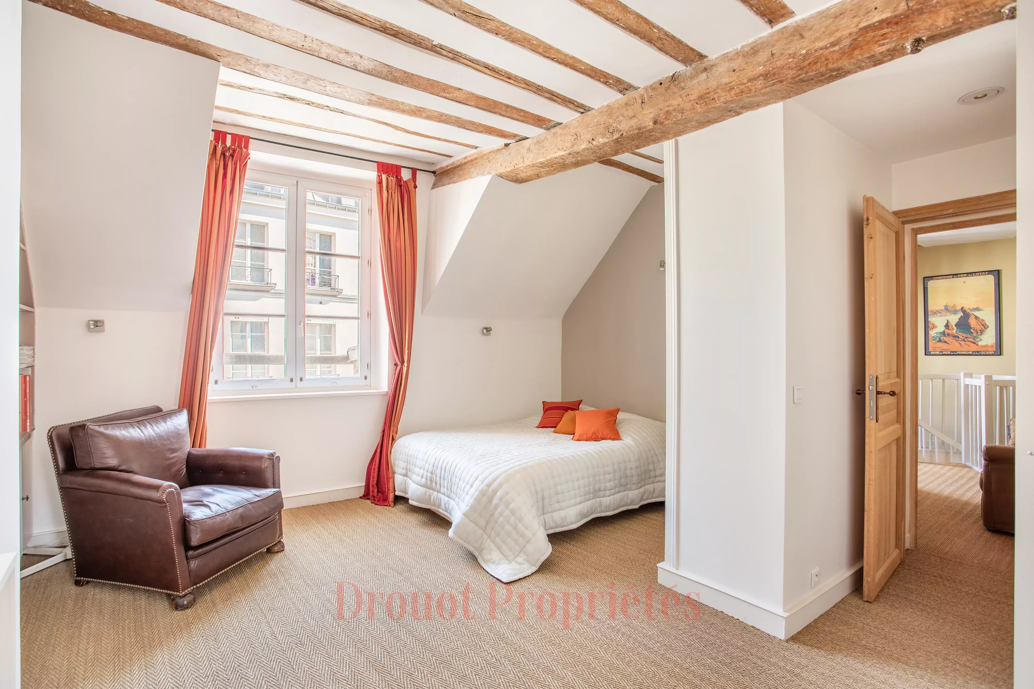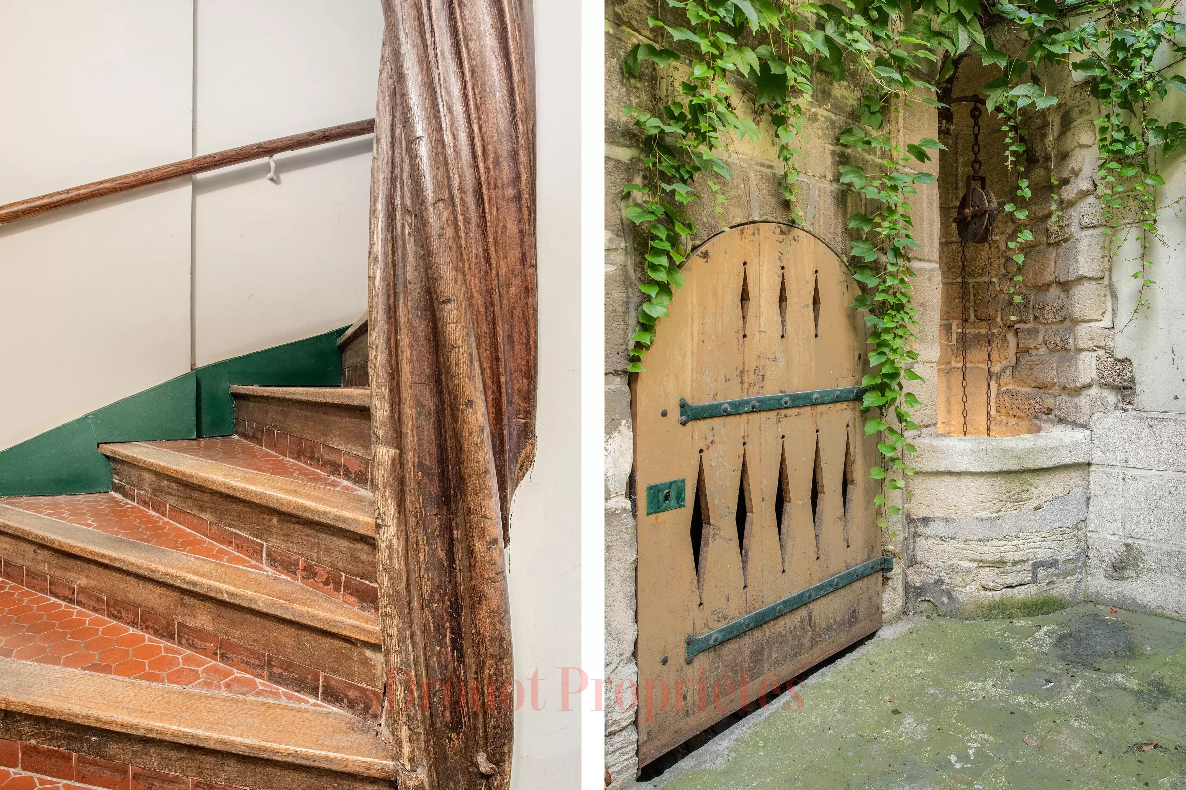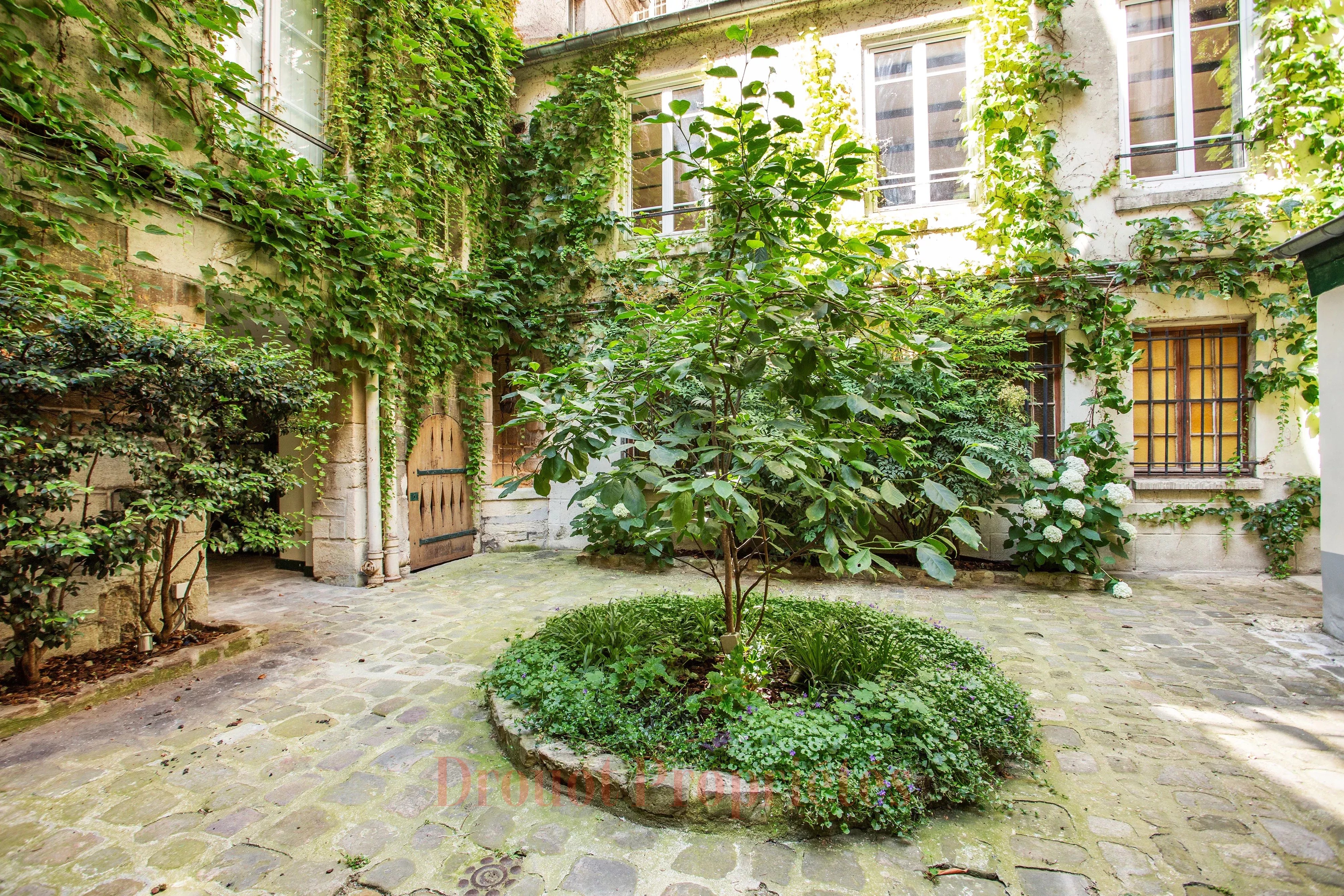 DUPLEX TRAVERSANT- ODEON- CALME- Situé en plein cur du 6ème arrondissement, magnifique duplex traversant aux 2ème et 3ème étages d'un immeuble du 17ème siècle, dont les parties communes étaient les anciennes écuries d'Henri IX. Une très belle porte cochère cloutée d'époque donne accès à une cour arborée où se trouve un puits classé aux monuments historiques. L'appartement, qui a gardé ses éléments authentiques d'origine (poutres apparentes, portes en bois, etc.), bénéficie d'une agréable distribution et de volumes remarquables (hauteur sous plafond de 4 mètres). Il se compose au premier niveau d'un grand salon lumineux avec cheminée, d'une cuisine dinatoire donnant sur la cour arborée et assurant un dépaysement immédiat. Un escalier intérieur conduit à l'étage supérieur composé d'un grand bureau et de deux vastes chambres avec leurs salles de bains attenantes donnant sur l'église Saint-Sulpice. Deux grands greniers, directement accessibles par l'escalier, et deux grandes caves complètent ce bien. Possibilité, en sus, de racheter les parties communes à ces niveaux, permettant d'être ainsi le seul occupant des 2ème et 3ème étages. Un lieu hors du temps, une page d'histoire pour un bien exceptionnel et plein de charme.