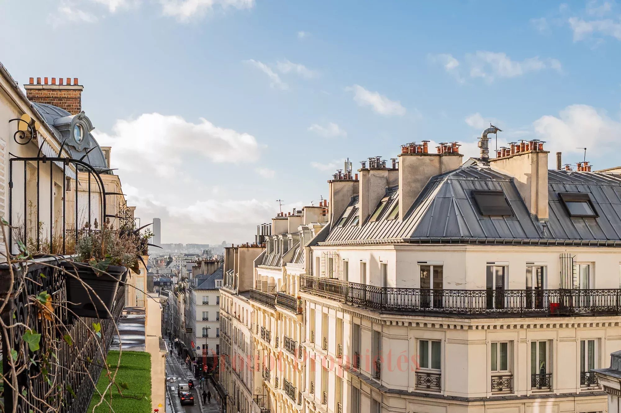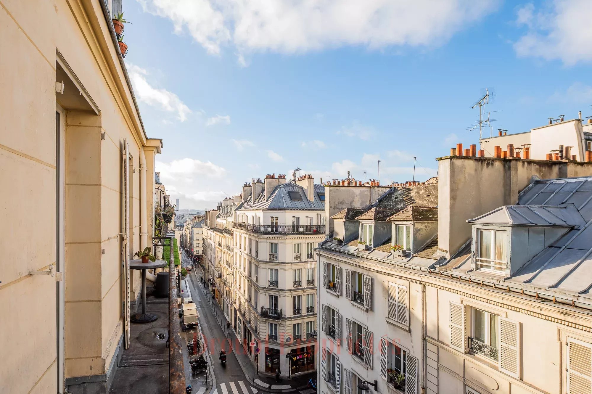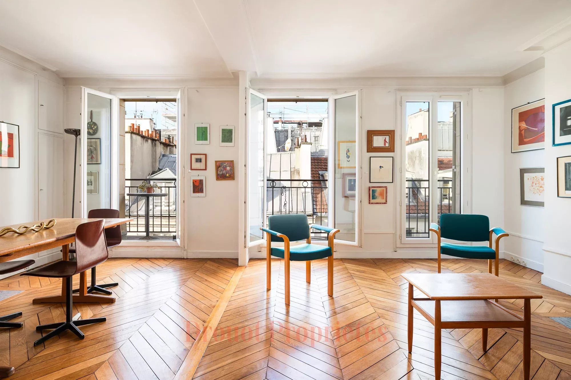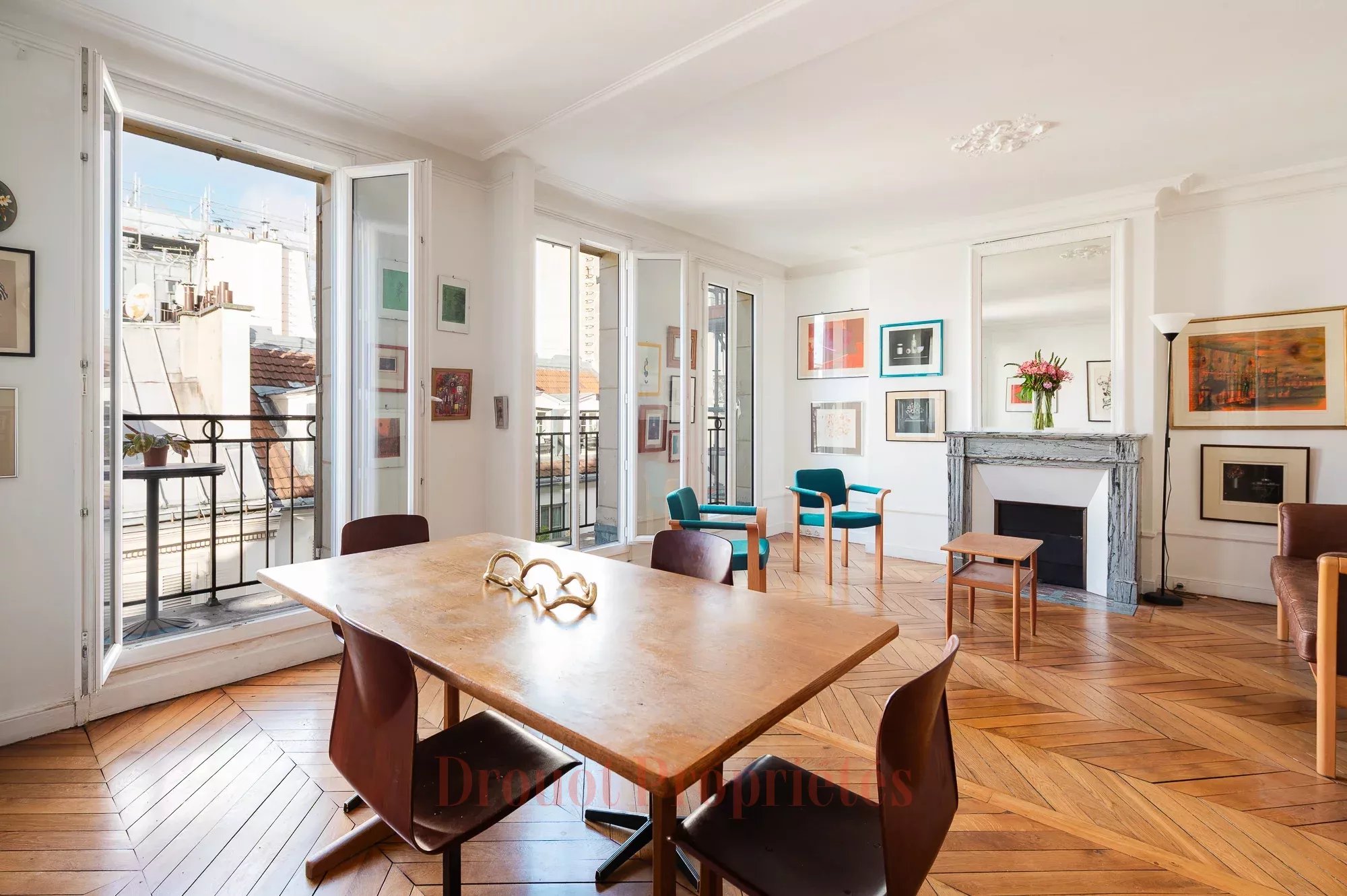 EXCLUSIVITE - BALCON FILANT ETAGE ELEVE LUMIERE - CHARME DE L'ANCIEN Situé entre la rue Condorcet et l'avenue Trudaine, appartement traversant au cinquième étage par escalier d'un immeuble en pierre de taille de 1900. Ce bien se compose d'un vaste double séjour (deuxième chambre possible) ouvrant sur un balcon filant exposé plein ouest, d'une chambre au calme, d'une cuisine indépendante, d'une salle de douche, de toilettes séparées et d'un dressing. Appartement lumineux ayant préservé ses élements d'origine, parquet en point de Hongrie et cheminée. Une grande cave complète ce bien. Local vélo dans la copropriété.