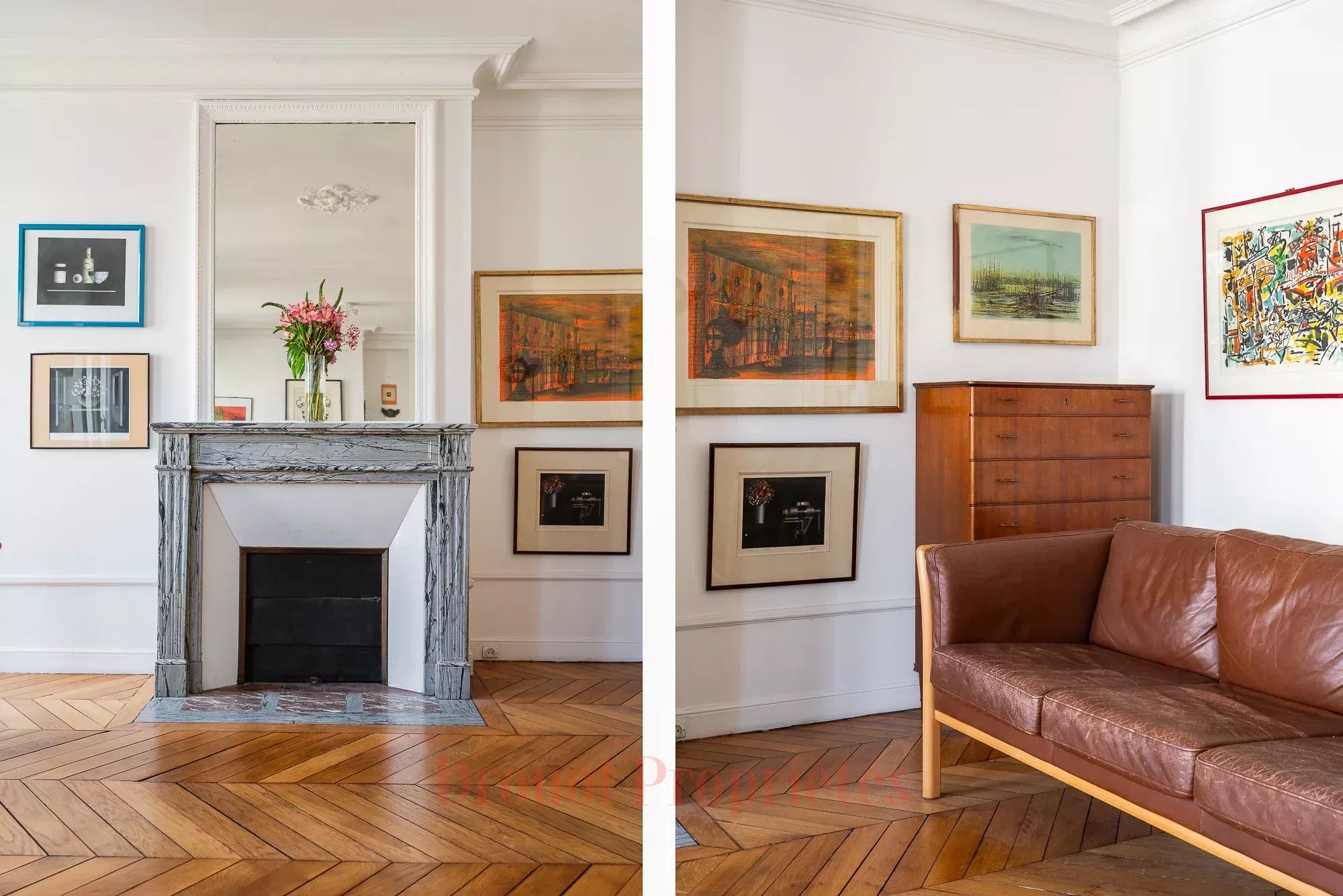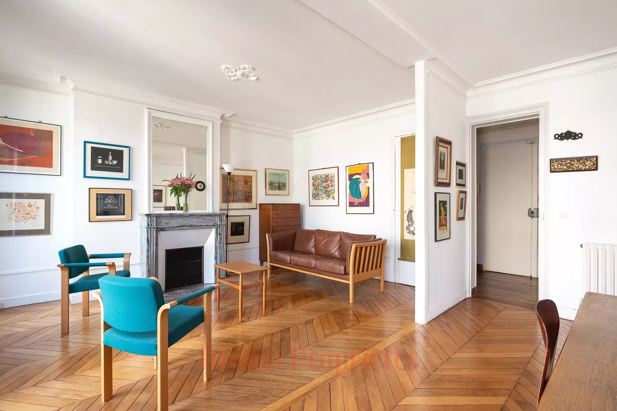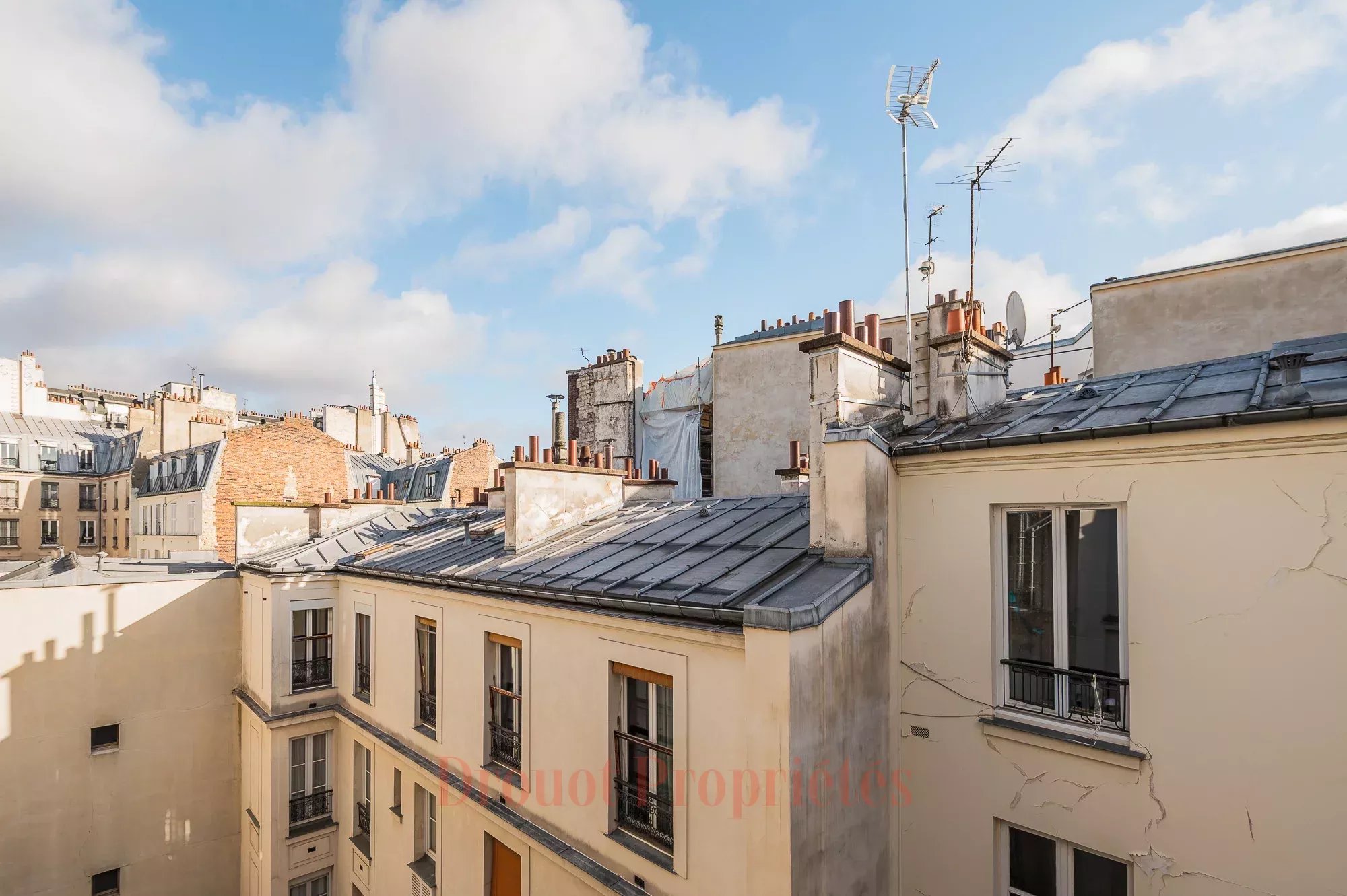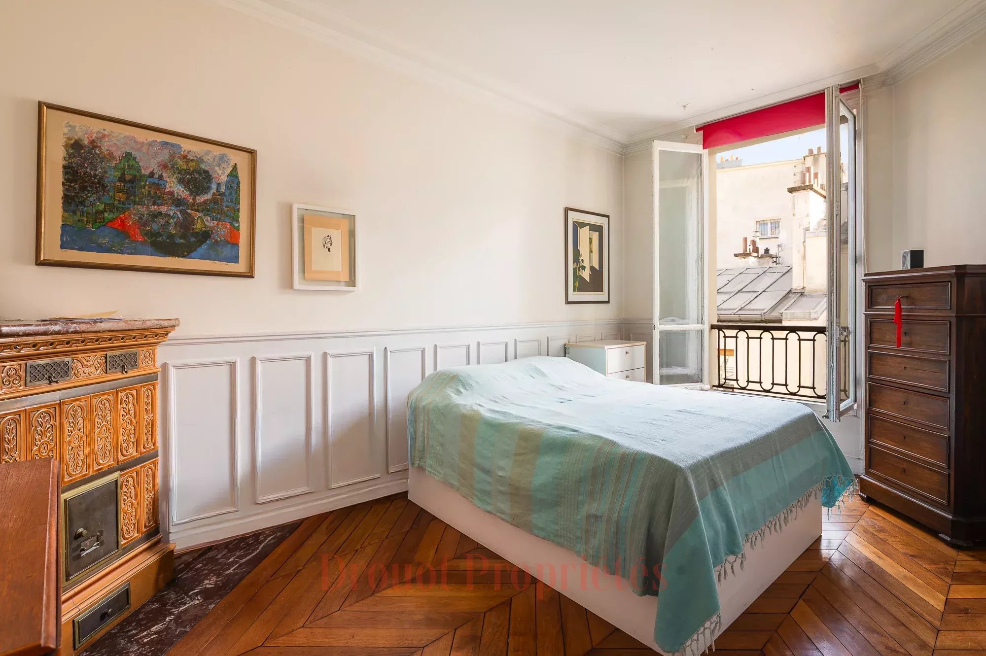 EXCLUSIVITE - BALCON FILANT ETAGE ELEVE LUMIERE - CHARME DE L'ANCIEN Situé entre la rue Condorcet et l'avenue Trudaine, appartement traversant au cinquième étage par escalier d'un immeuble en pierre de taille de 1900. Ce bien se compose d'un vaste double séjour (deuxième chambre possible) ouvrant sur un balcon filant exposé plein ouest, d'une chambre au calme, d'une cuisine indépendante, d'une salle de douche, de toilettes séparées et d'un dressing. Appartement lumineux ayant préservé ses élements d'origine, parquet en point de Hongrie et cheminée. Une grande cave complète ce bien. Local vélo dans la copropriété.