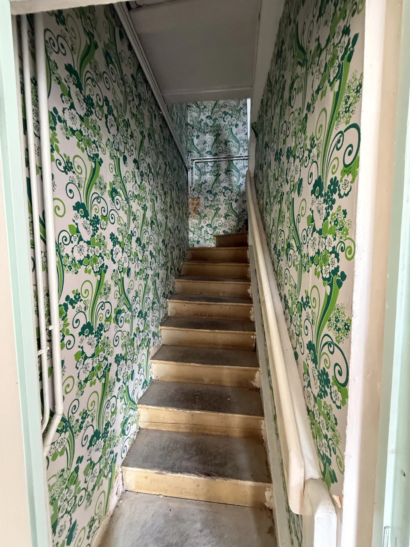 Vous vous stationnez dans le garage puis traversez le terrain pour découvrir l'entrée, donnant sur la cuisine, le cabinet de toilette et la salle d'eau. Vous traversez la pièce de vie et découvrez l'escalier. Du palier, une grande chambre et une plus petite pour un enfant ou un bureau.