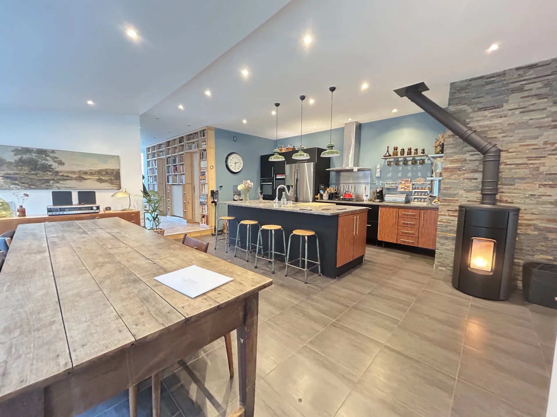 Cette maison est composée d'un hall d'entrée qui s'ouvre sur une magnifique pièce de vie d'environ 80 m2, avec espace cuisine qui s'intègre parfaitement à l'espace séjour/salle à manger/bibliothèque.