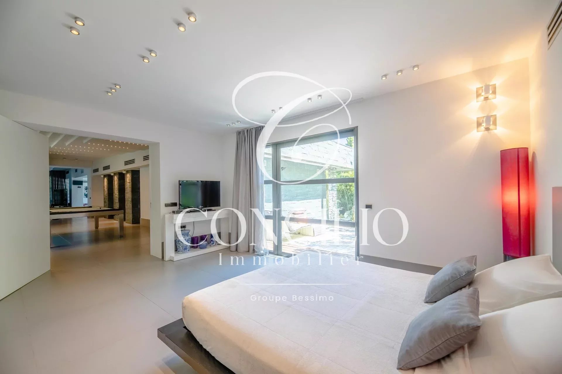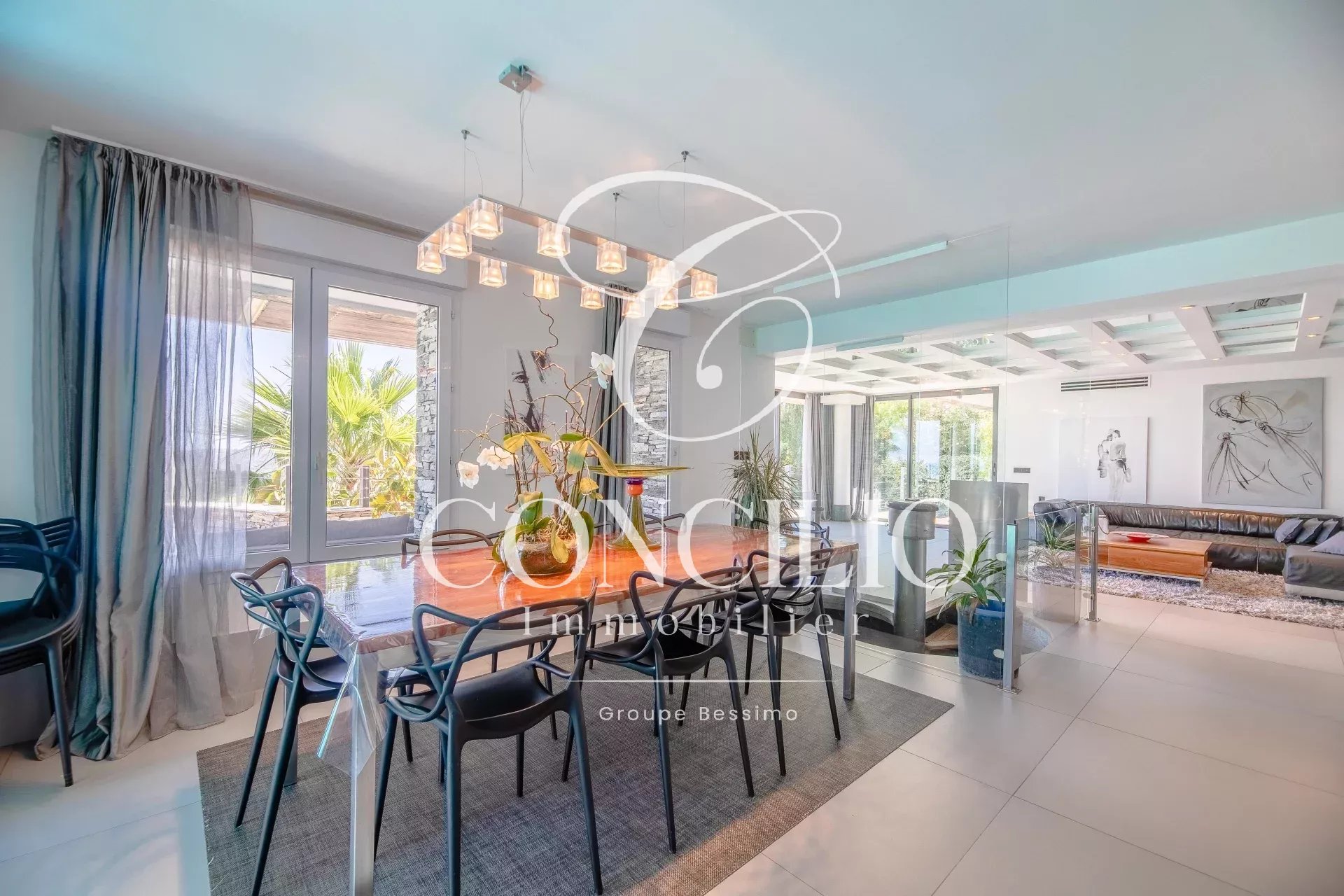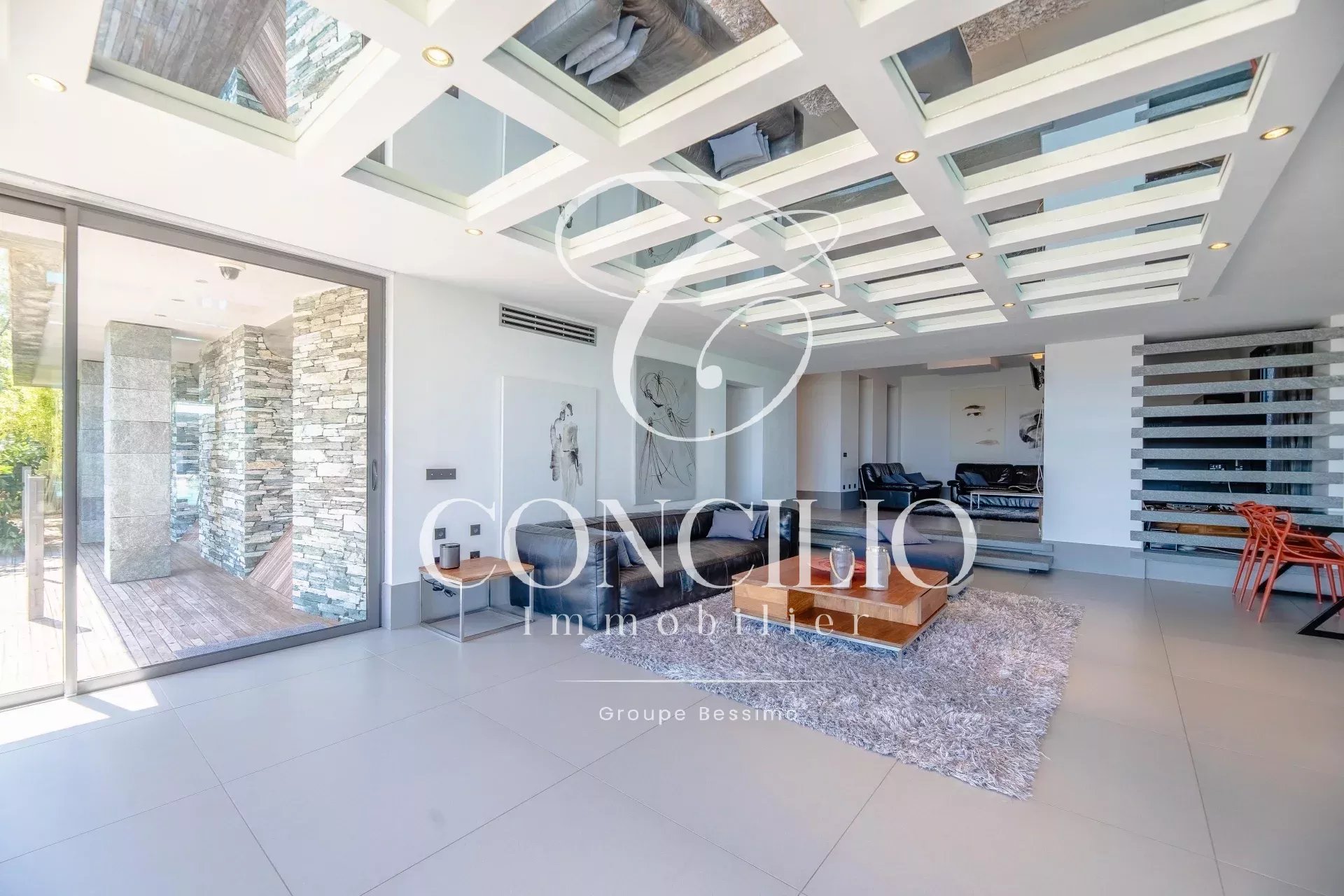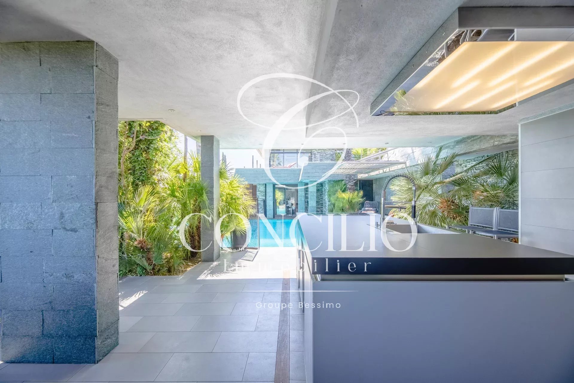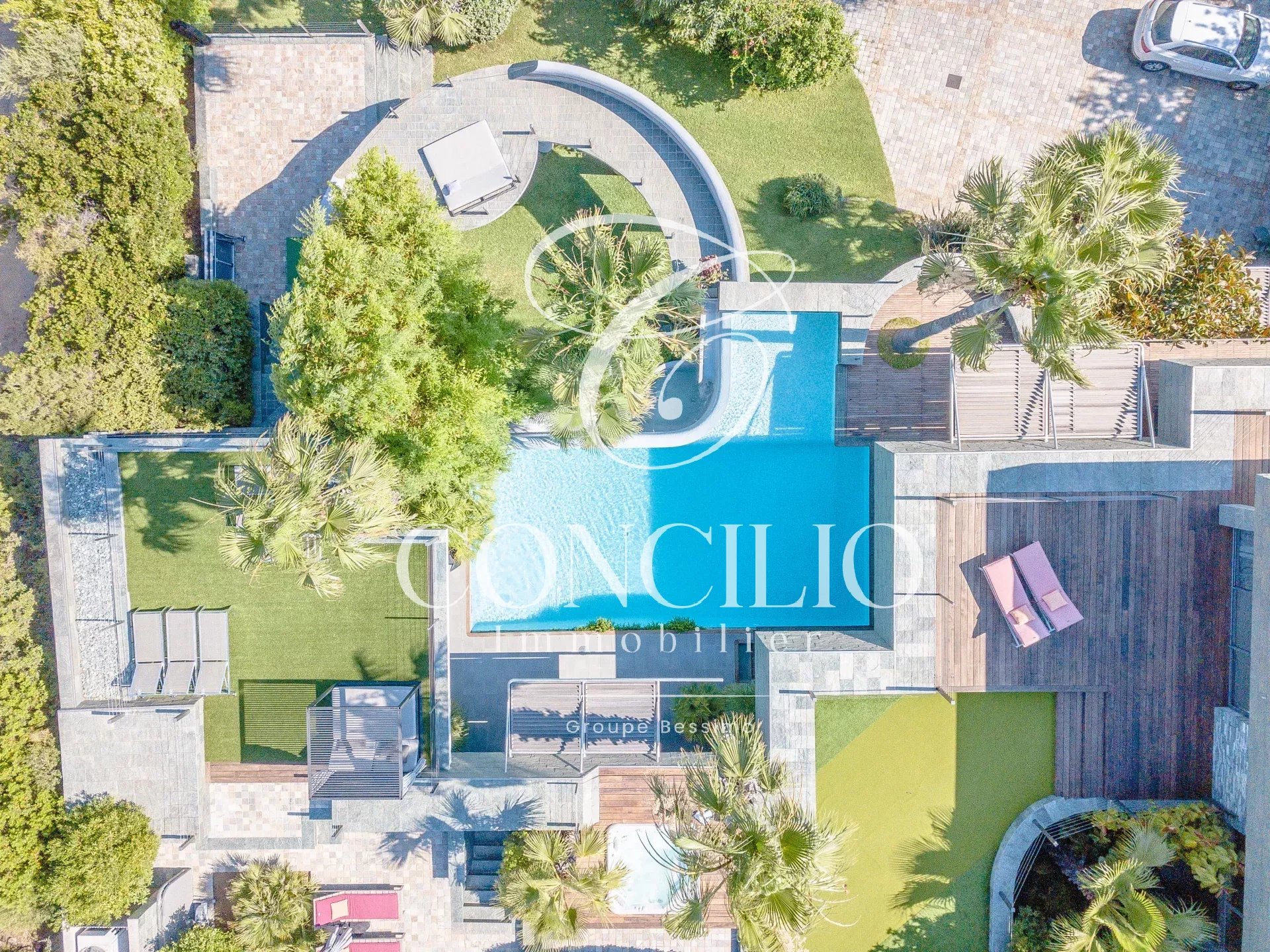 Située dans un environnement privilégié, cette villa contemporaine d’exception, édifiée sur trois niveaux, bénéficie d’une vue mer panoramique et d’un emplacement recherché à proximité immédiate de la mer. D’une surface habitable d’environ 370 m², elle se compose de 9 pièces dont 6 chambres, et est implantée sur un terrain de 1 939 m². La propriété offre des prestations haut de gamme, comprenant une piscine chauffée à débordement, un spa, un solarium ainsi qu’un putting green privé. Les espaces intérieurs se distinguent par leurs volumes généreux et lumineux, avec des équipements de qualité : fenêtres coulissantes en aluminium, double vitrage, climatisation, ventilation double flux et installations modernes. Un pool house avec cuisine d’été équipée, une cave à vin et plusieurs espaces dédiés à la détente viennent compléter ce bien. La villa bénéficie d’un emplacement idéal, avec la mer, la plage et le port accessibles à pied, tout en restant proche du centre-ville et des commodités. Villa construite en 1988. Les informations sur les risques auxquels ce bien est exposé sont disponibles sur le site Géorisques.