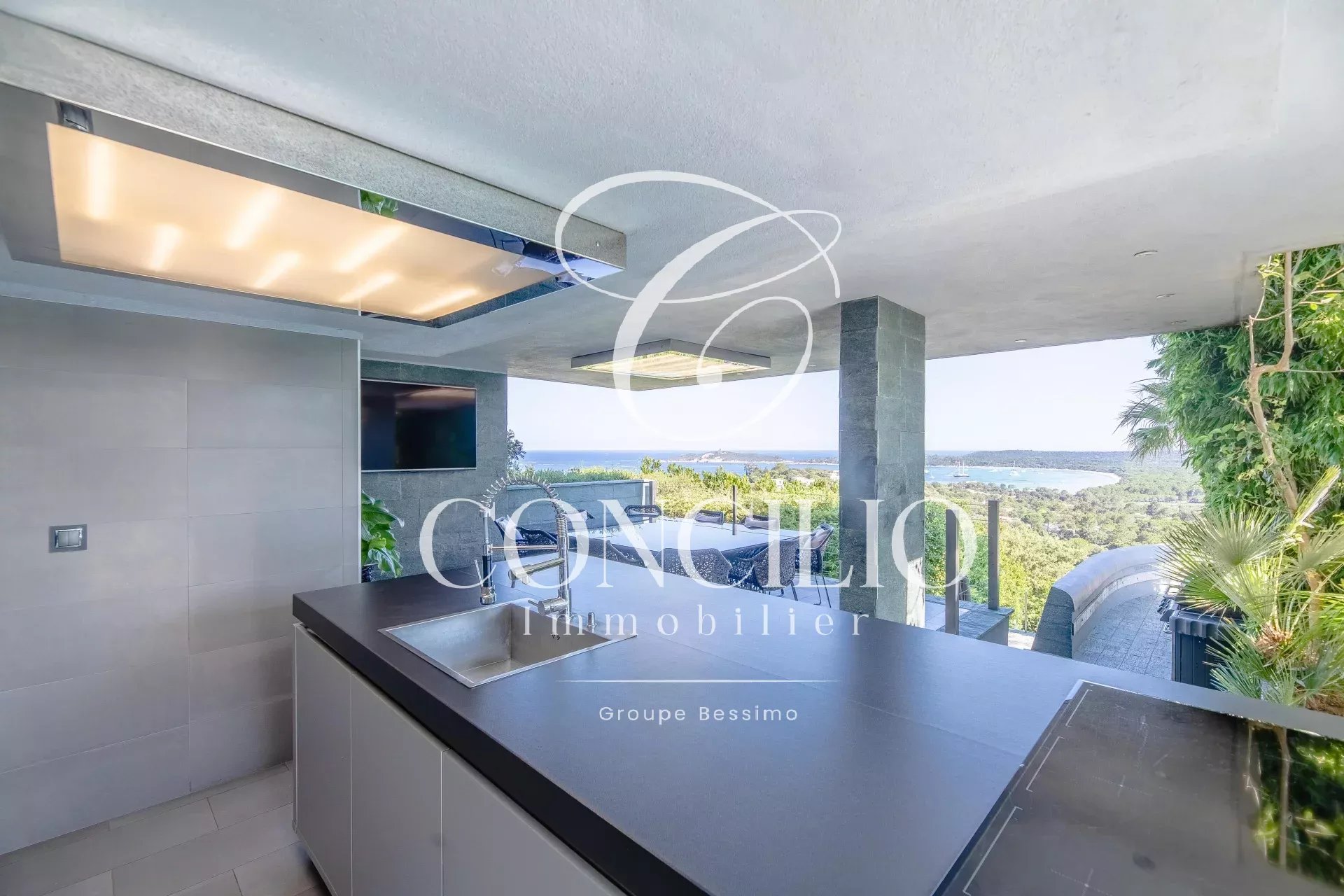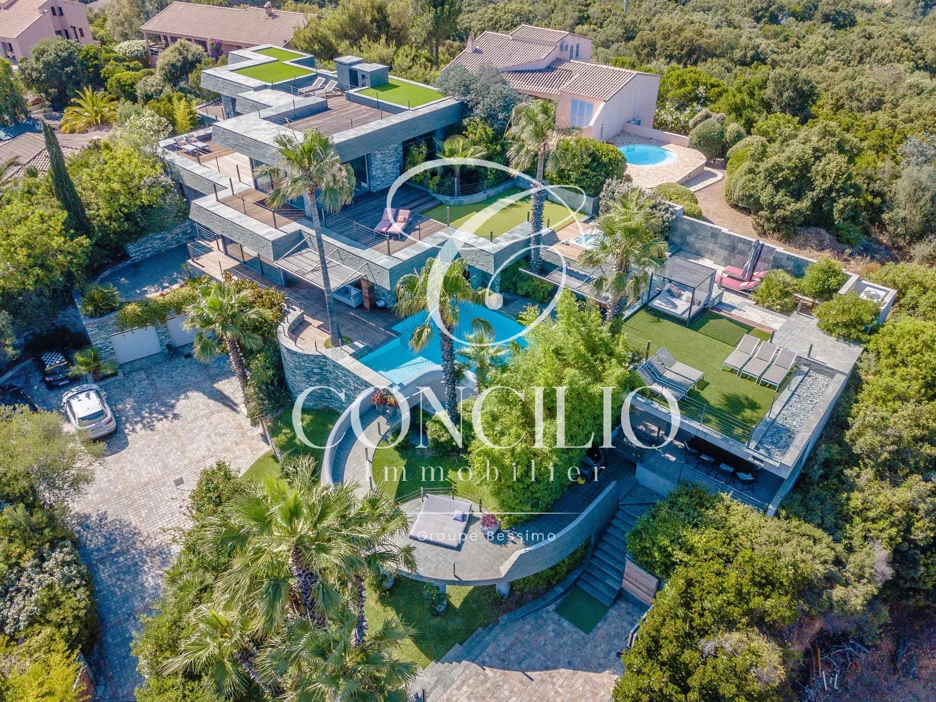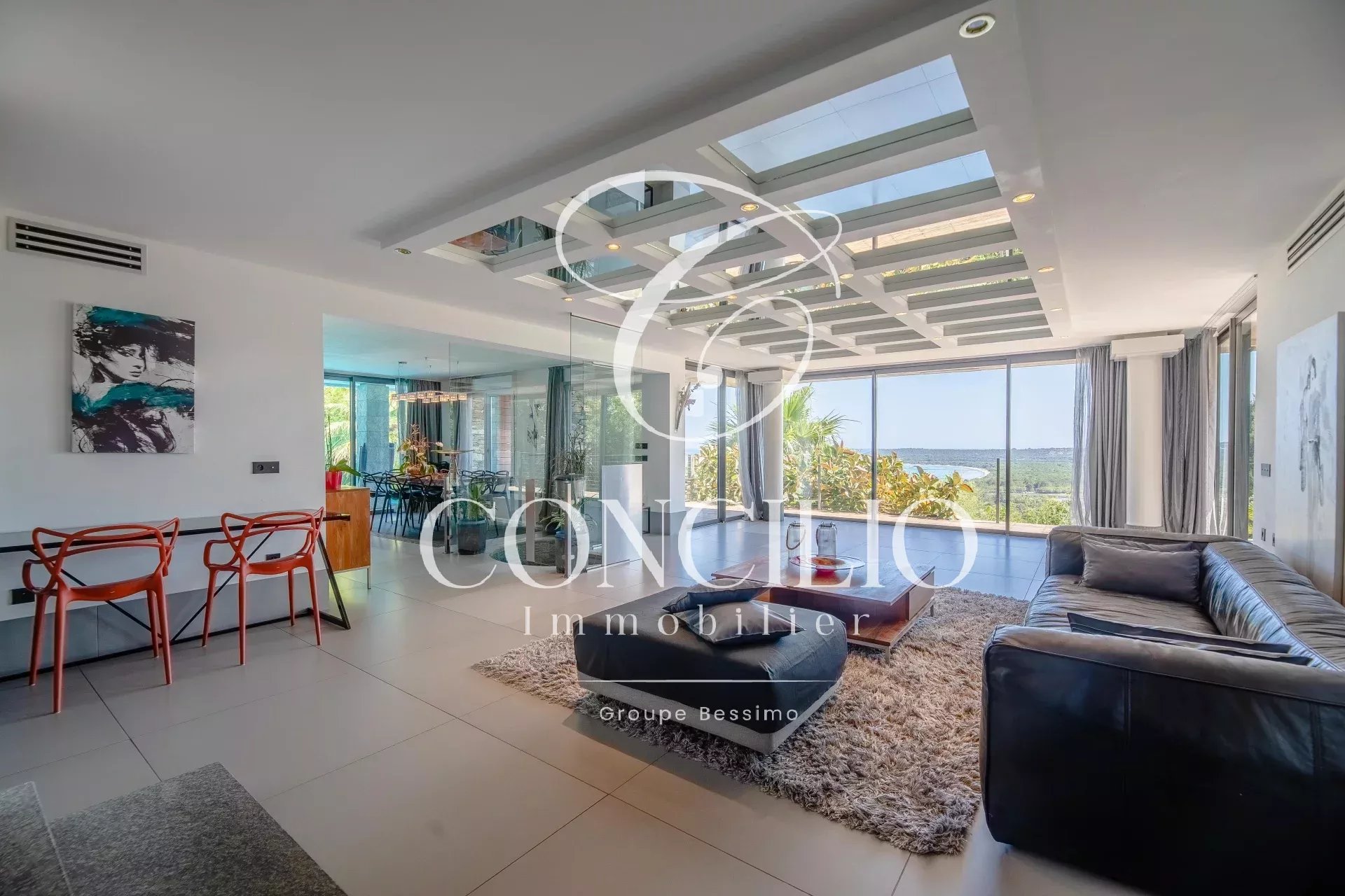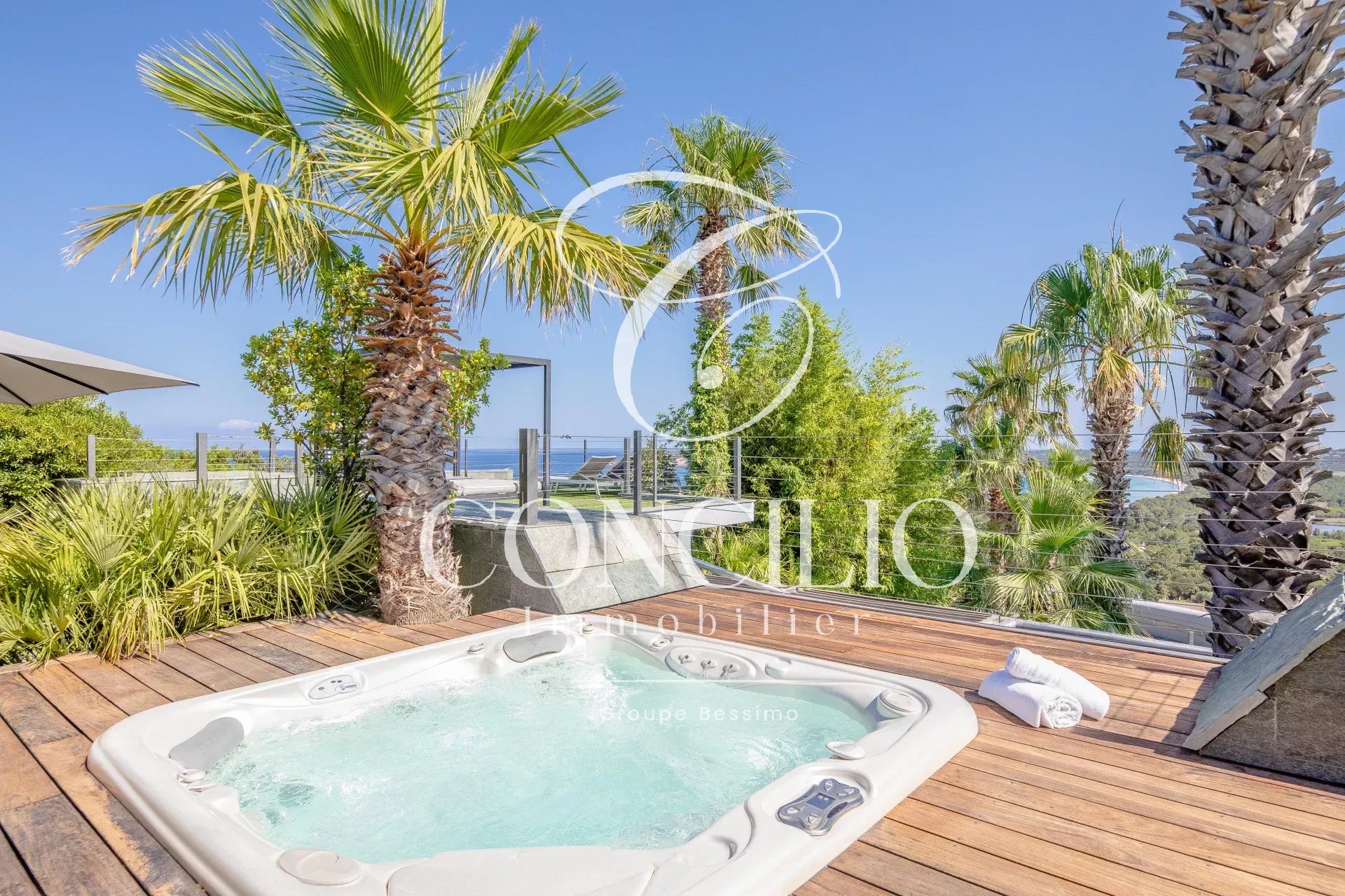 Située dans un environnement privilégié, cette villa contemporaine d’exception, édifiée sur trois niveaux, bénéficie d’une vue mer panoramique et d’un emplacement recherché à proximité immédiate de la mer. D’une surface habitable d’environ 370 m², elle se compose de 9 pièces dont 6 chambres, et est implantée sur un terrain de 1 939 m². La propriété offre des prestations haut de gamme, comprenant une piscine chauffée à débordement, un spa, un solarium ainsi qu’un putting green privé. Les espaces intérieurs se distinguent par leurs volumes généreux et lumineux, avec des équipements de qualité : fenêtres coulissantes en aluminium, double vitrage, climatisation, ventilation double flux et installations modernes. Un pool house avec cuisine d’été équipée, une cave à vin et plusieurs espaces dédiés à la détente viennent compléter ce bien. La villa bénéficie d’un emplacement idéal, avec la mer, la plage et le port accessibles à pied, tout en restant proche du centre-ville et des commodités. Villa construite en 1988. Les informations sur les risques auxquels ce bien est exposé sont disponibles sur le site Géorisques.