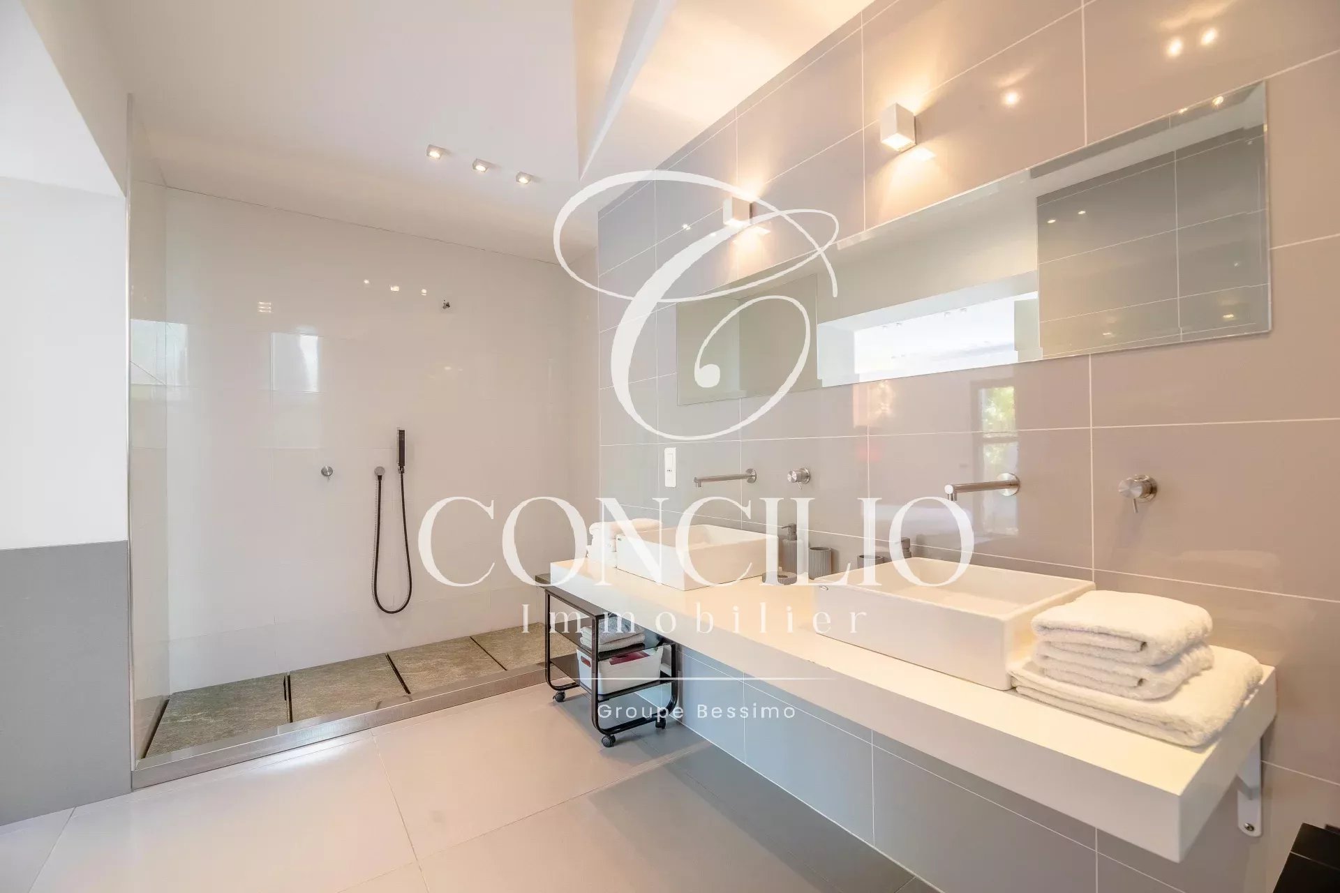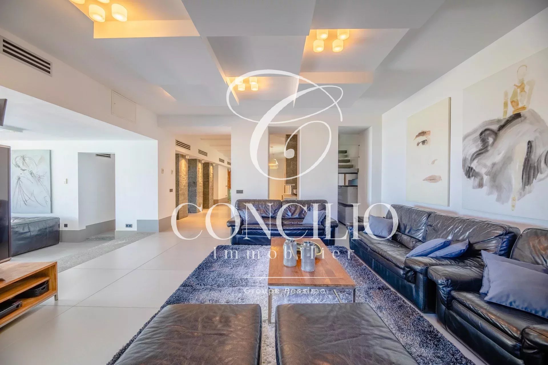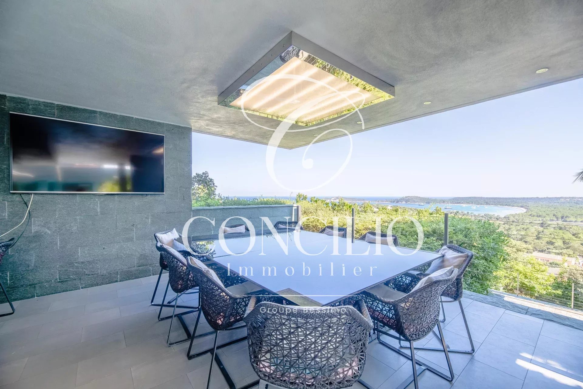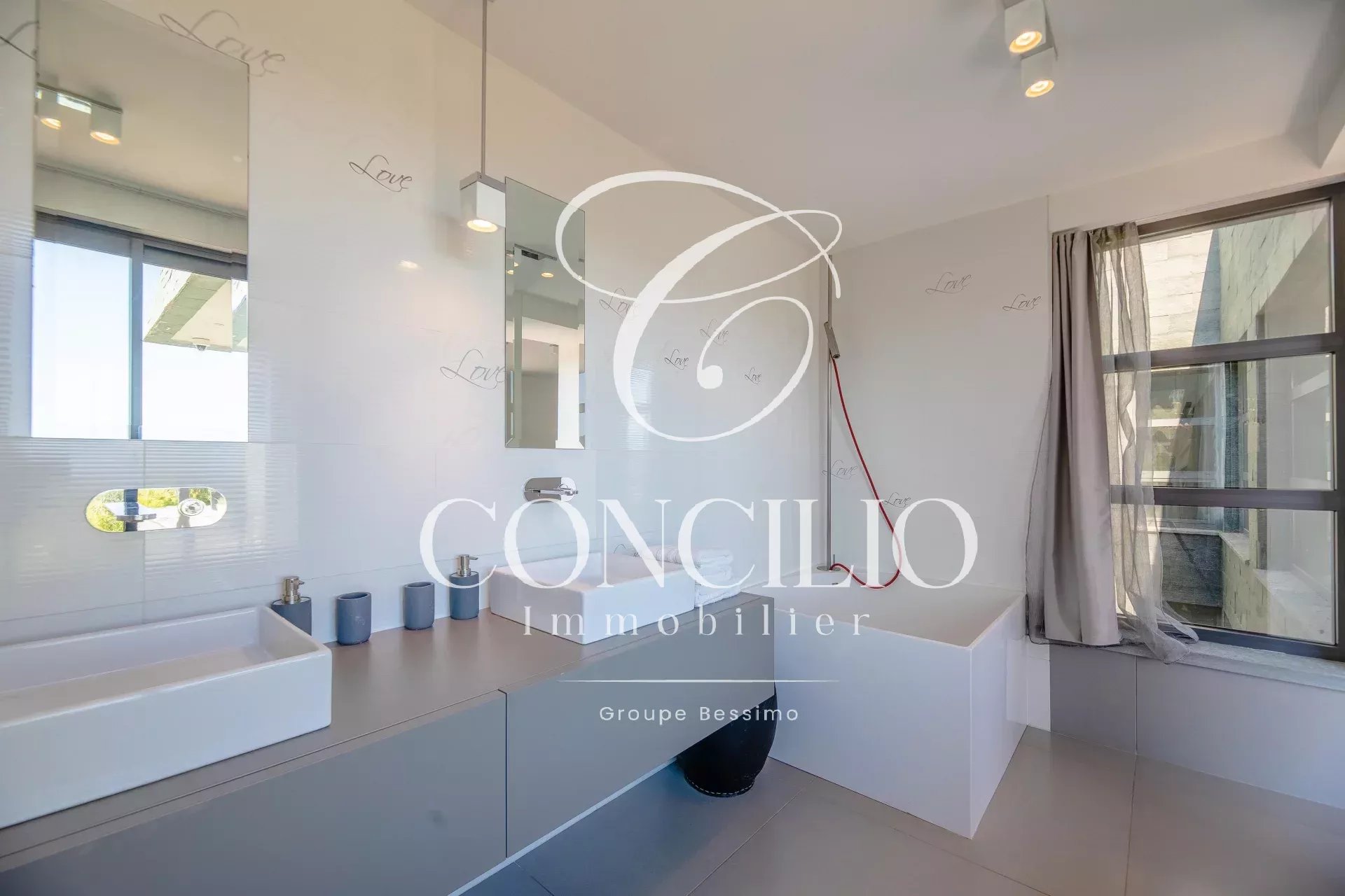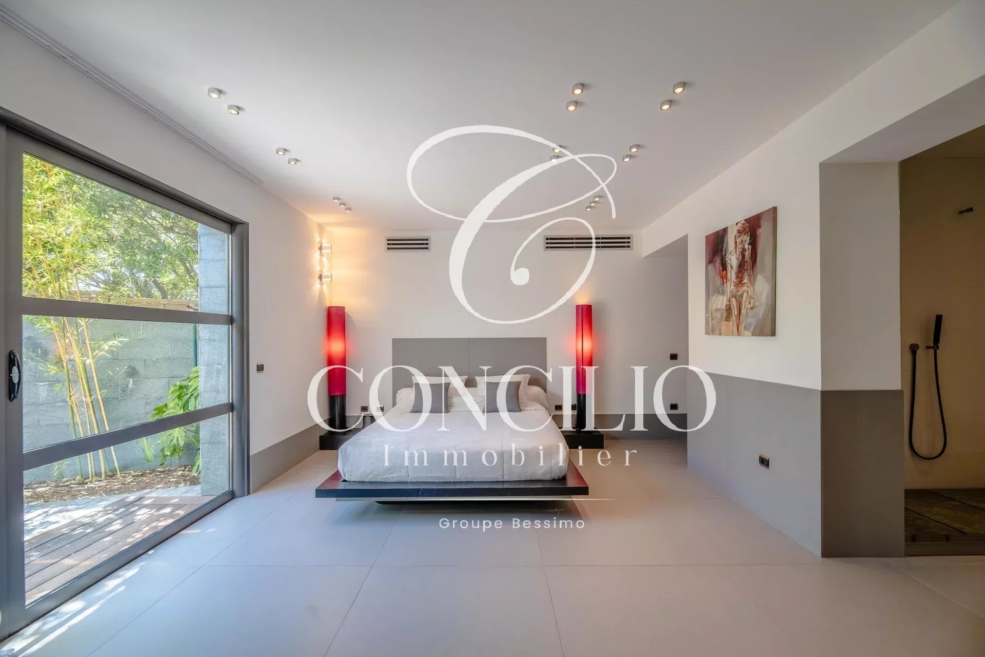 Située dans un environnement privilégié, cette villa contemporaine d’exception, édifiée sur trois niveaux, bénéficie d’une vue mer panoramique et d’un emplacement recherché à proximité immédiate de la mer. D’une surface habitable d’environ 370 m², elle se compose de 9 pièces dont 6 chambres, et est implantée sur un terrain de 1 939 m². La propriété offre des prestations haut de gamme, comprenant une piscine chauffée à débordement, un spa, un solarium ainsi qu’un putting green privé. Les espaces intérieurs se distinguent par leurs volumes généreux et lumineux, avec des équipements de qualité : fenêtres coulissantes en aluminium, double vitrage, climatisation, ventilation double flux et installations modernes. Un pool house avec cuisine d’été équipée, une cave à vin et plusieurs espaces dédiés à la détente viennent compléter ce bien. La villa bénéficie d’un emplacement idéal, avec la mer, la plage et le port accessibles à pied, tout en restant proche du centre-ville et des commodités. Villa construite en 1988. Les informations sur les risques auxquels ce bien est exposé sont disponibles sur le site Géorisques.